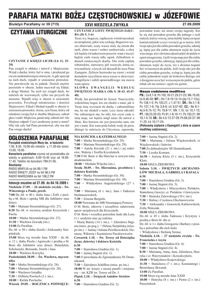 PARAFIA MATKI BOŻEJ CZÊSTOCHOWSKIEJ w JÓZEFOWIE Biuletyn Parafialny nr 39 (715) CZYTANIA LITURGICZNE CZYTANIE Z KSIĘGI LICZB (Lb 11, 2529) Pan zstąpił w obłoku i mówił z Mojżeszem. Wziął z ducha, który był w nim, i przekazał go owym siedemdziesięciu starszym. A gdy spoczął na nich duch, wpadli w uniesienie prorockie. Nie powtórzyło się to jednak. Dwóch mężów pozostało w obozie. Jeden nazywał się Eldad, a drugi Medad. Na nich też zstąpił duch, bo należeli do wezwanych, tylko nie przyszli do namiotu. Wpadli więc w obozie w uniesienie prorockie. Przybiegł młodzieniec i doniósł Mojżeszowi: Eldad i Medad wpadli w obozie w uniesienie prorockie. Jozue, syn Nuna, który od młodości swojej był w służbie Mojżesza, zabrał głos i rzekł: Mojżeszu, panie mój, zabroń im! Ale Mojżesz odparł: Czyż zazdrosny jesteś o mnie? Oby tak cały lud Pana prorokował, oby mu dał Pan swego ducha! OG£OSZENIA PARAFIALNE Porz¹dek niedzielnych Mszy œw. w koœciele: 7.00, 8.30, 10.00-dla m³odzie¿y, 11.30-dla dzieci, 13.00, 18.00. Kancelaria parafialna czynna od poniedzia³ku do soboty w godzinach: 9.00-10.45 oraz od 16.0017.45. Telefon do kancelarii 789-21-05. S³uchamy: RADIO MARYJA na fali 89,1 FM RADIO ŒWIÊTY JÓZEF na fali 96,5 FM RADIO WARSZAWA na fali 106,2 FM Intencje mszalne od 27.09. do 04.10.2009 r. Niedziela 27.09. – 26 niedziela zwykła - Św. Wincentego a Paulo, prezb. 7:00 Dz.-bł. w 40 r. ślubu Jana i Zofii z prośbą o bł. Boże i opiekę MB dla Jubilatów oraz dzieci. 7:00 + Mariana Strzemińskiego (Gr. 27). 8:30 Dz.-bł. w rocznicę urodzin Krzysztofa i Pawła. 10:00 + Marka Strzemińskiego (Gr. 27). 11:30 + Wacława Zawadę (im.) 13:00 Za Parafian. Dz.-bł. w 50 r. ślubu Józefa i Aleksandry Sierpińskich. 15:00 Msza wg mszału Jana XXIII – dz.-bł. w 12 r. ślubu Pawła i Agnieszki z prośbą o bł. Boże dla Jubilatów oraz dzieci: Benedykta, Scholastyki, Bernarda, Józefa i Jana. 18:00 + Wacława Koczyka. Poniedziałek 28.09. – Św. Wacława, męczennika 7:00 + Marka Strzemińskiego (Gr. 28). 7:00 + Mariana Strzemińskiego (Gr. 28). 7:00 + Wacława Gniadka. 7:30 + Elżbietę Pawluch (2 r. śm.). 18:00 + Rafała Pawlucha. Wtorek 29.09. - ROCZNICA POŚWIĘCE- XXVI NIEDZIELA ZWYKŁA 27.09.2009 CZYTANIE Z LISTU ŚWIĘTEGO JAKUBA (Jk 5, 1-6) Teraz wy, bogacze, zapłaczcie wśród narzekań na utrapienia, jakie was czekają. Bogactwo wasze zbutwiało, szaty wasze stały się żerem dla moli, złoto wasze i srebro zardzewiało, a rdza ich będzie świadectwem przeciw wam i toczyć będzie ciała wasze niby ogień. Zebraliście w dniach ostatecznych skarby. Oto woła zapłata robotników, żniwiarzy pól waszych, którą zatrzymaliście, a krzyk ich doszedł do uszu Pana Zastępów. Żyliście beztrosko na ziemi i wśród dostatków tuczyliście serca wasze w dniu rzezi. Potępiliście i zabili sprawiedliwego: nie stawia wam oporu. S Ł O WA E WA N G E L I I W E D Ł U G ŚWIĘTEGO MARKA (Mk 9, 38-43. 45.4748) Wtedy Jan powiedział do Jezusa: Nauczycielu, widzieliśmy kogoś, kto nie chodzi z nami, jak w Twoje imię wyrzucał złe duchy, i zabranialiśmy mu, bo nie chodził z nami. Lecz Jezus odrzekł: Nie zabraniajcie mu, bo nikt, kto czyni cuda w imię moje, nie będzie mógł zaraz źle mówić o Mnie. Kto bowiem nie jest przeciwko nam, ten jest z nami. Kto wam poda kubek wody do picia, dlatego że należycie do Chrystusa, zaprawdę, powiadam wam, nie utraci swojej nagrody. Kto by się stał powodem grzechu dla jednego z tych małych, którzy wierzą, temu byłoby lepiej uwiązać kamień młyński u szyi i wrzucić go w morze. Jeśli twoja ręka jest dla ciebie powodem grzechu, odetnij ją; lepiej jest dla ciebie ułomnym wejść do życia wiecznego, niż z dwiema rękami pójść do piekła w ogień nieugaszony. I jeśli twoja noga jest dla ciebie powodem grzechu, odetnij ją; lepiej jest dla ciebie, chromym wejść do życia, niż z dwiema nogami być wrzuconym do piekła. Jeśli twoje oko jest dla ciebie powodem grzechu, wyłup je; lepiej jest dla ciebie jednookim wejść do królestwa Bożego, niż z dwojgiem oczu być wrzuconym do piekła, gdzie robak ich nie umiera i ogień nie gaśnie. NIA KOŚCIOŁA KATEDRALNEGO 7:00 + Marka Strzemińskiego (Gr. 29). 7:00 + Mariana Strzemińskiego (Gr. 29). 7:00 + Anielę Krysiak (21 r. śm.) i jej rodziców; Walerię i Teofila Krysińskich. 7:30 O bł. Boże w dla Marcina w nowym roku akademickim. 18:00 + Michała Wójcika (im.) Środa 30.09. - Św. Hieronima, prezbitera i doktora Kościoła 7:00 + Marka Strzemińskiego (Gr. 30). 7:00 + Mariana Strzemińskiego (Gr. 30). 7:00 + Władysława Auguścińskiego (27 r. śm.) 7:00 + Mariannę (6 r. śm.), Jana i Tadeusza Stelmaszewskich. 7:30 + Zenona Bergiela. 18:00 Nowenna do MB Nieustającej Pomocy O bł. Boże, zdrowie i szczęśliwe załatwienie spraw urzędowych dla Krzysztofa. O bł. Boże i wszelkie potrzebne łaski dla Leny (1 r. urodzin) oraz jej rodziny. + Marię Batory (14 r. śm.). + Zdzisława Stępnia (mies. po pog.). + Helenę Sierpińską (mies. po śm.). + Janinę i Juliana Pawlikowskich, Eleonorę, Wiktorię i Kazimierza Paszkiewiczów. Czwartek 1.10. – Św. Teresy od Dzieciątka Jezus, dziewicy i doktora Kościoła 6:30 7:00 + Stanisława Grudnia (Gr. 1). 7:00 + Janinę Stępień (Gr. 1). 7:00 O powołania do Zgromadzenia SS Dominikanek. 7:30 + Zdzisława Schiffera (mies. po śm.) 18:00 W int. księży z naszej parafii i misjonarzy – int. KŻR św. Teresy od Dz. J. Piątek 2.10. – Świętych Aniołów Stróżów 6:30 7:00 + Stanisława Grudnia (Gr. 2). 7:00 + Janinę Stępień (Gr. 2). 7:00 + Mariannę i Juliana Więckowskich, cr Więckowskich i Salwów. 7:00 Za dobrodziejów SS Dominikanek. 7:30 + Leszka Komara. 16:30 + Justynę Klotz (5 r. śm.), Krzysztofa Klotz. 18:00 MSZA ZBIOROWA Sobota 3.10. - ŚWIĘTYCH ARCHANIOŁÓW MICHAŁA, GABRIELA I RAFAŁA 6:30 7:00 + Stanisława Grudnia (Gr. 3). 7:00 + Janinę Stępień (Gr.