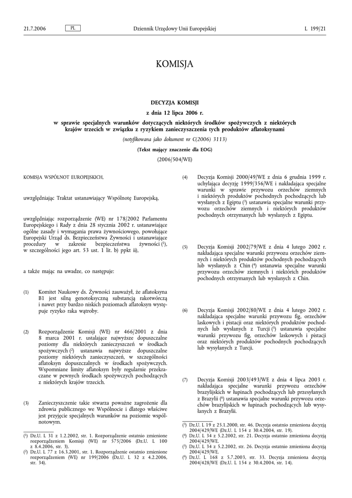 21.7.2006 PL Dziennik Urzędowy Unii Europejskiej L 199/21 KOMISJA DECYZJA KOMISJI z dnia 12 lipca 2006 r. w sprawie specjalnych warunków dotyczących niektórych środków spożywczych z niektórych krajów trzecich w związku z ryzykiem zanieczyszczenia tych produktów aflatoksynami (notyfikowana jako dokument nr C(2006) 3113) (Tekst mający znaczenie dla EOG) (2006/504/WE) KOMISJA WSPÓLNOT EUROPEJSKICH, (4) Decyzja Komisji 2000/49/WE z dnia 6 grudnia 1999 r. uchylająca decyzję 1999/356/WE i nakładająca specjalne warunki w sprawie przywozu orzechów ziemnych i niektórych produktów pochodnych pochodzących lub wysłanych z Egiptu (3) ustanawia specjalne warunki przywozu orzechów ziemnych i niektórych produktów pochodnych otrzymanych lub wysłanych z Egiptu. (5) Decyzja Komisji 2002/79/WE z dnia 4 lutego 2002 r. nakładająca specjalne warunki przywozu orzechów ziemnych i niektórych produktów pochodnych pochodzących lub wysłanych z Chin (4) ustanawia specjalne warunki przywozu orzechów ziemnych i niektórich produktów pochodnych otrzymanych lub wysłanych z Chin. (6) Decyzja Komisji 2002/80/WE z dnia 4 lutego 2002 r. nakładająca specjalne warunki przywozu fig, orzechów laskowych i pistacji oraz niektórych produktów pochodnych lub wysłanych z Turcji (5) ustanawia specjalne warunki przywozu fig, orzechów laskowych i pistacji oraz niektórych produktów pochodnych pochodzących lub wysyłanych z Turcji. (7) Decyzja Komisji 2003/493/WE z dnia 4 lipca 2003 r. nakładająca specjalne warunki przywozu orzechów brazylijskich w łupinach pochodzących lub przesyłanych z Brazylii (6) ustanawia specjalne warunki przywozu orzechów brazylijskich w łupinach pochodzących lub wysyłanych z Brazylii. uwzględniając Traktat ustanawiający Wspólnotę Europejską, uwzględniając rozporządzenie (WE) nr 178/2002 Parlamentu Europejskiego i Rady z dnia 28 stycznia 2002 r. ustanawiające ogólne zasady i wymagania prawa żywnościowego, powołujące Europejski Urząd ds. Bezpieczeństwa Żywności i ustanawiające procedury w zakresie bezpieczeństwa żywności (1), w szczególności jego art. 53 ust. 1 lit. b) ppkt ii), a także mając na uwadze, co następuje: (1) (2) (3) Komitet Naukowy ds. Żywności zauważył, że aflatoksyna B1 jest silną genotoksyczną substancją rakotwórczą i nawet przy bardzo niskich poziomach aflatoksyn występuje ryzyko raka wątroby. Rozporządzenie Komisji (WE) nr 466/2001 z dnia 8 marca 2001 r. ustalające najwyższe dopuszczalne poziomy dla niektórych zanieczyszczeń w środkach spożywczych (2) ustanawia najwyższe dopuszczalne poziomy niektórych zanieczyszczeń, w szczególności aflatoksyn dopuszczalnych w środkach spożywczych. Wspomniane limity aflatoksyn były regularnie przekraczane w pewnych środkach spożywczych pochodzących z niektórych krajów trzecich. Zanieczyszczenie takie stwarza poważne zagrożenie dla zdrowia publicznego we Wspólnocie i dlatego właściwe jest przyjęcie specjalnych warunków na poziomie wspólnotowym. (1) Dz.U. L 31 z 1.2.2002, str. 1. Rozporządzenie ostatnio zmienione rozporządzeniem Komisji (WE) nr 575/2006 (Dz.U. L 100 z 8.4.2006, str. 3). (2) Dz.U. L 77 z 16.3.2001, str. 1. Rozporządzenie ostatnio zmienione rozporządzeniem (WE) nr 199/2006 (Dz.U. L 32 z 4.2.2006, str. 34). (3) Dz.U. L 19 z 25.1.2000, str. 46. Decyzja ostatnio zmieniona 2004/429/WE (Dz.U. L 154 z 30.4.2004, str. 19). (4) Dz.U. L 34 z 5.2.2002, str. 21. Decyzja ostatnio zmieniona 2004/429/WE. (5) Dz.U. L 34 z 5.2.2002, str. 26. Decyzja ostatnio zmieniona 2004/429/WE. (6) Dz.U. L 168 z 5.7.2003, str. 33. Decyzja zmieniona 2004/428/WE (Dz.U. L 154 z 30.4.2004, str. 14). decyzją decyzją decyzją decyzją L 199/22 PL Dziennik Urzędowy Unii Europejskiej (8) Decyzja Komisji 2005/85/WE z dnia 26 stycznia 2005 r. nakładająca szczególne warunki importu pistacji oraz niektórych produktów uzyskanych z pistacji pochodzących lub sprowadzanych z Iranu (7) ustanawia specjalne warunki przywozu pistacji i niektórych produktów pochodnych pochodzących lub wysyłanych z Iranu. (9) Wiele specjalnych warunków przywozu środków spożywczych objętych decyzjami 2000/49/WE, 2002/79/WE, 2002/80/WE, 2003/493/WE i 2005/85/WE z Brazylii, Chin, Egiptu, Iranu i Turcji jest takich samych. Zatem w celu zapewnienia jasności prawodawstwa wspólnotowego stosowne jest określenie w jednej decyzji specjalnych warunków przywozu tych środków spożywczych ze wspomnianych krajów trzecich w związku z zanieczyszczeniem tych produktów aflatoksynami. (10) W przypadku niektórych środków spożywczych z niektórych krajów trzecich konieczne są szczególne środki dodatkowe. (12) Środki przewidziane w niniejszej decyzji, w szczególności w odniesieniu do środków spożywczych z Iranu i Brazylii, mają znaczny wpływ na możliwości kontrolne państw członkowskich. W związku z powyższym właściwe jest wprowadzenie wymogu, zgodnie z którym na mocy niniejszej decyzji wszystkie koszty związane z pobieraniem próbek, analizą, przechowywaniem oraz wszystkie koszty związane z urzędowymi środkami przedsięwziętymi w odniesieniu do dostaw nieodpowiadających wymogom związanym z urzędowymi kontrolami środków spożywczych z Iranu i z Brazylii ponoszą zainteresowani importerzy lub zaintersowane podmioty działające na rynku spożywczym. (13) (7) w odniesieniu do świadectwa dostaw orzechów brazylijskich bez łupin. Ponadto można też wywnioskować, że bieżące urzędowe kontrole zwracanych partii są niedostateczne. W związku z tym stosowne jest ograniczenie analiz do laboratorium urzędowego, które może zagwarantować odpowiednie wyniki analityczne i ustanowić ścisłe warunki zwrotu nieodpowiednich partii. Jeśli wspomniane ścisłe warunki nie są przestrzegane należy zniszczyć kolejne nieodpowiednie partie. (14) Ze względu na ochronę zdrowia publicznego państwa członkowskie powinny na bieżąco informować Komisję i przedkł