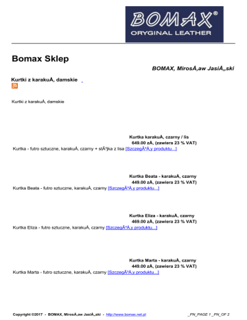 Bomax Sklep BOMAX, MirosÅ‚aw JasiÅ„ski Kurtki z karakuÅ‚ damskie Kurtki z karakuÅ‚ damskie Kurtka karakuÅ‚ czarny / lis 649.00 zÅ‚ (zawiera 23 % VAT) Kurtka - futro sztuczne, karakuÅ‚ czarny + stójka z lisa [Szczegóły produktu...] Kurtka Beata - karakuÅ‚ czarny 449.00 zÅ‚ (zawiera 23 % VAT) Kurtka Beata - futro sztuczne, karakuÅ‚ czarny [Szczegóły produktu...] Kurtka Eliza - karakuÅ‚ czarny 469.00 zÅ‚ (zawiera 23 % VAT) Kurtka Eliza - futro sztuczne, karakuÅ‚ czarny [Szczegóły produktu...] Kurtka Marta - karakuÅ‚ czarny 449.00 zÅ‚ (zawiera 23 % VAT) Kurtka Marta - futro sztuczne, karakuÅ‚ czarny [Szczegóły produktu...] Copyright ©2017 - BOMAX, MirosÅ‚aw JasiÅ„ski - http://www.bomax.net.pl _PN_PAGE 1 _PN_OF 2 Kurtka Monika - karakuÅ‚ czarny 469.00 zÅ‚ (zawiera 23 % VAT) Kurtka Monika - futro sztuczne, karakuÅ‚ czarny [Szczegóły produktu...] • • • • • «« Start « Poprzednia 1 NastÄ™pna » Koniec »» Wyniki 1 - 5 z 5 Copyright ©2017 - BOMAX, MirosÅ‚aw JasiÅ„ski - http://www.bomax.net.pl _PN_PAGE 2 _PN_OF 2