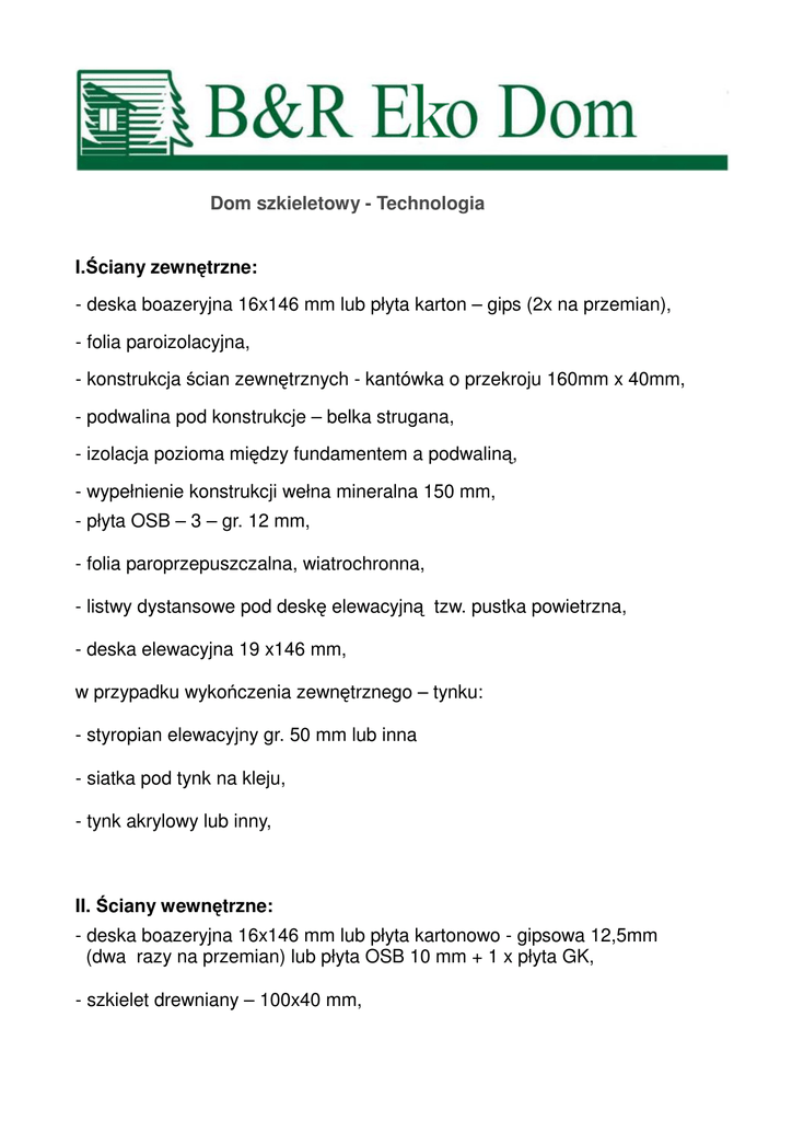 Dom szkieletowy - Technologia I. ciany zewn trzne: - deska boazeryjna 16x146 mm lub płyta karton – gips (2x na przemian), - folia paroizolacyjna, - konstrukcja cian zewn trznych - kantówka o przekroju 160mm x 40mm, - podwalina pod konstrukcje – belka strugana, - izolacja pozioma mi dzy fundamentem a podwalin , - wypełnienie konstrukcji wełna mineralna 150 mm, - płyta OSB – 3 – gr. 12 mm, - folia paroprzepuszczalna, wiatrochronna, - listwy dystansowe pod desk elewacyjn tzw. pustka powietrzna, - deska elewacyjna 19 x146 mm, w przypadku wyko czenia zewn trznego – tynku: - styropian elewacyjny gr. 50 mm lub inna - siatka pod tynk na kleju, - tynk akrylowy lub inny, II. ciany wewn trzne: - deska boazeryjna 16x146 mm lub płyta kartonowo - gipsowa 12,5mm (dwa razy na przemian) lub płyta OSB 10 mm + 1 x płyta GK, - szkielet drewniany – 100x40 mm, - wełna mineralna 100mm, - deska boazeryjna 16x146 mm lub płyta kartonowo - gipsowa 12,5mm (dwa razy na przemian) lub płyta OSB 10 mm + 1 x płyta GK. III. Strop: - belki stropowe strugane o przekroju 200mm x 140mm, - płyta OSB 22 mm + panele podłogowe lub legary i deska podlogowa, - wełna mineralna 100mm, - folia paroizolacja 0,2 mm, - płyta kartonowo-gipsowa 12,5mm lub boazeria 16x146 mm. IV. Dach: - konstrukcja wg. projektu – drewno strugane czterostronnie, - łaty - kontrłaty, - folia dachowa paroprzepuszczalna, wiatroszczelna, - wełna mineralna 200mm, - folia paroizolacja, - listwy pod zamocowanie płyty kartonowo – gipsowej lub boazerii, - płyta kartonowo-gipsowa 12,5mm lub boazeria 16x146 mm, V.Podłoga: - legary drewniane 160 x 50 mm, - wełna mineralna 150 mm, - podłoga drewniana sosna skandynawska olejowana, - zamiennie wylewka betonowa i płytki ceramiczne lub panele podłogowe, V. Stolarka okienna i drzwiowa: -okna drewniane dwuszybowe, uchylno–rozwieralne, (zamiennie PCV) podwójnie szklone Drewno do produkcji – sosna 3 x klejona współczynnik przenikania ciepła U=1,1 W/m2K Izolacja akustyczna - 31 dB - drzwi wej ciowe drewniane, - drzwi wewn trzne drewniane pełne, sosnowe, Materiał podstawowy u yty do budowy: - drewno konstrukcyjne KVH – czterostronnie strugane, kraw dzie fazowane,suszone komorowo do ok. 18% wilgotno ci – pochodzenie drewna wierk skandynawski z certyfikatem FSC, - belki widoczne drewno klejone DUO Belki SI lub Nsi − płyta OSB-3 wodoodporna – Kronopol, Wełna mineralna ISOVER Saint Globin Materiały u yte do budowy spełniaj podstawowe normy dla budownictwa drewnianego, ale technologia wykonania mo e zosta zmieniona pod własny projekt inwestora dotyczy to mi dzy innymi wyko cze cian wewn trznych i zewn trznych, grubo ci materiałów izolacyjnych, rodzaju stolarki okiennej i drzwiowej itp. Nasza firma wykonuje domy pod indywidualne projekty i pomysły inwestora.
