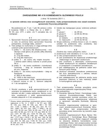 Dziennik Urzędowy Komendy Głównej Policji Nr 3 ⎯ 70 ⎯ Poz. 17 17 ZARZĄDZENIE NR 418 KOMENDANTA GŁÓWNEGO POLICJI z dnia 15 kwietnia 2011 r. w sprawie zakresu oraz szczegółowych warunków, trybu przeprowadzania oraz zasad oceniania sprawności fizycznej policjantów Na podstawie art. 7 ust. 1 pkt 4b ustawy z dnia 6 kwietnia 1990 r. o Policji (Dz. U. z 2007 r. Nr 43, poz. 277, z późn. zm.1)) zarządza się, co następuje: §1 1. Sprawność fizyczna policjanta jest oceniana raz w roku za pomocą testu sprawności fizycznej policjantów, zwanego dalej „testem”. 2. Test polega na wykonaniu w ciągu jednego dnia czterech prób sprawnościowych: 1) próby 1 – do oceny siły eksplozywnej – rzut oburącz znad głowy do przodu piłką lekarską o ciężarze: a) 2 kg dla kobiet, b) 3 kg dla mężczyzn; 2) próby 2 – do oceny siły mięśni brzucha – z leżenia tyłem skłony tułowia w przód przez 30 s; 3) próby 3 – do oceny szybkości i koordynacji ruchowej – bieg ze zmianami kierunków po tzw. kopercie; 4) próby 4 – do oceny wytrzymałości – bieg na dystansie: a) 800 m dla kobiet, b) 1000 m dla mężczyzn. 3. Opis wykonywania prób sprawnościowych, o których mowa w ust. 2, stanowi załącznik nr 1 do zarządzenia. §2 1. Wyniki uzyskane z prób sprawnościowych są oceniane na podstawie norm, ustalonych w zależności od płci i wieku policjanta. Normy wyników uzyskanych z prób sprawnościowych określa załącznik nr 2 do zarządzenia. 1) Zmiany tekstu jednolitego wymienionej ustawy zostały ogłoszone w Dz. U. z 2007 r. Nr 57, poz. 390, Nr 120, poz. 818, Nr 140, poz. 981 i Nr 165, poz. 1170, z 2008 r. Nr 86, poz. 521, Nr 171, poz. 1065 i Nr 237, poz. 1651, z 2009 r. Nr 22, poz. 120, Nr 62, poz. 504, Nr 85, poz. 716, Nr 97, poz. 803, Nr 98, poz. 817, Nr 115, poz. 959, Nr 157, poz. 1241, Nr 168, poz. 1323, Nr 195, poz. 1502, Nr 201, poz. 1540, Nr 206, poz. 1589 i Nr 223, poz. 1777 oraz z 2010 r. Nr 34, poz. 190, Nr 96, poz. 620, Nr 98, poz. 626, Nr 125, poz. 842, Nr 127, poz. 857, Nr 164, poz. 1108, Nr 182, poz. 1228, Nr 238, poz. 1578 i Nr 240, poz. 1602 oraz z 2011 r. Nr 53, poz. 273. 2. Ustala się następujące grupy wiekowe policjantów: 1) grupa I – do 29 lat; 2) grupa II – od 30 do 39 lat; 3) grupa III: a) kobiety – od 40 do 45 lat, b) mężczyźni – od 40 do 50 lat. 3. Grupę wiekową, o której mowa w ust. 2, należy ustalać na podstawie roku urodzenia, bez uwzględniania dnia i miesiąca. §3 Zwalnia się z testu policjanta, który: 1) przekroczył wiek określony w § 2 ust. 2 pkt 3; 2) w roku przeprowadzania testu: a) jest przeniesiony do dyspozycji przełożonego właściwego w sprawach osobowych, b) jest zwolniony z obowiązku wykonywania zadań służbowych na zasadach określonych w przepisach o związkach zawodowych, c) jest oddelegowany do pełnienia zadań służbowych poza Policją, d) ukończył szkolenie zawodowe podstawowe lub kurs specjalistyczny z zakresu taktyki i technik interwencji, e) jest oddelegowany do pełnienia służby poza granicami państwa w celu realizacji zadań w kontyngencie policyjnym. §4 1. Test przeprowadza komisja powołana przez kierownika jednostki organizacyjnej Policji. 2. Dla policjantów: 1) Komendy Głównej Policji i Centralnego Laboratorium Kryminalistycznego Policji, test przeprowadza komisja powołana przez kierownika komórki organizacyjnej właściwej w sprawach szkolenia Komendy Głównej Policji; 2) komórki organizacyjnej właściwej w sprawach antyterrorystycznych Komendy Głównej Policji, test przeprowadza komisja powołana przez kierownika tej komórki organizacyjnej; 3) komórek organizacyjnych Biura Spraw Wewnętrznych i Centralnego Biura Śledczego Komendy Głównej Policji mających siedzibę na obszarze działania komendanta wojewódzkiego Policji, test przeprowadza komisja powołana przez właściwego komendanta wojewódzkiego Policji; Dziennik Urzędowy Komendy Głównej Policji Nr 3 ⎯ 71 ⎯ 4) komisariatów Policji test przeprowadza komisja powołana przez właściwego komendanta powiatowego (miejskiego, rejonowego) Policji; 5) komisariatów specjalistycznych Policji test przeprowadza komisja powołana przez właściwego komendanta wojewódzkiego (Stołecznego) Policji. 3. W przypadku braku możliwości powołania komisji do przeprowadzenia testu dla policjantów komendy powiatowej (miejskiej, rejonowej) Policji i komisariatów Policji, test przeprowadza komisja powołana przez właściwego komendanta wojewódzkiego (Stołecznego) Policji. 4. W razie potrzeby powołuje się więcej niż jedną komisję do przeprowadzenia testu. §5 1. W skład komisji powołanej do przeprowadzenia testu, zwanej dalej „komisją”, wchodzą policjanci będący absolwentami kursu specjalistycznego z zakresu taktyki i technik interwencji lub inne osoby posiadające odpowiednie przygotowanie i kwalifikacje z zakresu szkolenia fizycznego. 2. W skład komisji mogą wchodzić osoby posiadające kwalifikacje zawodowe: lekarza, pielęgniarki, ratownika medycznego. §6 1. Test przeprowadza się od 15 kwietnia do 31 października. 2. Kierownik komórki lub jednostki organizacyjnej Policji właściwej do powołania komisji ustala skład osobowy komisji oraz miejsca i terminy przeprowadzania testu. 3. Policjant przystępuje do testu prowadzonego przez komisję właściwą dla miejsca pełnienia służby. §7 Do testu przystępuje policjant, który posiada aktualne zaświadczenie lekarskie z przeprowadzonych badań profilaktycznych, w którym nie stwierdzono przeciwwskazań zdrowotnych. §8 1. Komisja ocenia sprawność fizyczną policjanta na podstawie wyników uzyskanych z prób sprawnościowych, o których mowa w § 1 ust. 2. 2. Ocenę końcową z testu wystawia się na podstawie średniej arytmetycznej ocen uzyskanych z prób sprawnościowych. 3. Wystawia się z testu ocenę końcową: 1) 6 – wyróżniającą, jeżeli średnia arytmetyczna ocen wynosi od 5,51 do 6,00; Poz. 7 2) 5 – bardzo d