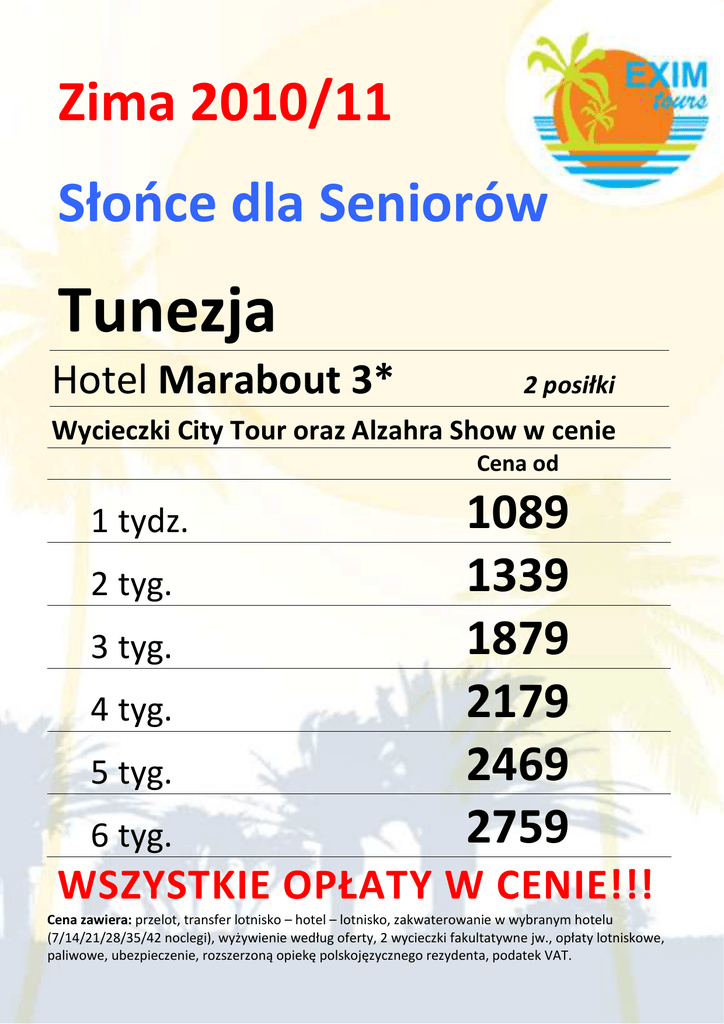 Zima 2010/11 Słońce dla Seniorów Tunezja Hotel Marabout 3* 2 posiłki Wycieczki City Tour oraz Alzahra Show w cenie Cena od 1 tydz. 2 tyg. 3 tyg. 4 tyg. 5 tyg. 6 tyg. 1089 1339 1879 2179 2469 2759 WSZYSTKIE OPŁATY W CENIE!!! Cena zawiera: przelot, transfer lotnisko – hotel – lotnisko, zakwaterowanie w wybranym hotelu (7/14/21/28/35/42 noclegi), wyżywienie według oferty, 2 wycieczki fakultatywne jw., opłaty lotniskowe, paliwowe, ubezpieczenie, rozszerzoną opiekę polskojęzycznego rezydenta, podatek VAT.