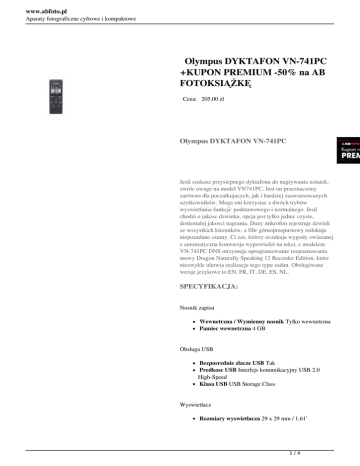 www.abfoto.pl Aparaty fotograficzne cyfrowe i kompaktowe Olympus DYKTAFON VN-741PC +KUPON PREMIUM -50% na AB FOTOKSIĄŻKĘ Cena: 205.00 zł Olympus DYKTAFON VN-741PC Jesli szukasz przystepnego dyktafonu do nagrywania notatek, zwróc uwage na model VN741PC. Jest on przeznaczony zarówno dla poczatkujacych, jak i bardziej zaawansowanych uzytkowników. Moga oni korzystac z dwóch trybów wyswietlania funkcji: podstawowego i normalnego. Jesli chodzi o jakosc dzwieku, opcja jest tylko jedna: czyste, doskonalej jakosci nagrania. Duzy mikrofon rejestruje dzwiek ze wszystkich kierunków, a filtr górnoprzepustowy redukuje niepozadane szumy. Ci zas, którzy oczekuja wygody zwiazanej z automatyczna konwersja wypowiedzi na tekst, z modelem VN-741PC DNS otrzymuja oprogramowanie rozpoznawania mowy Dragon Naturally Speaking 12 Recorder Edition, które niezwykle ulatwia realizacje tego typu zadan. Obslugiwane wersje jezykowe to EN, FR, IT, DE, ES, NL. SPECYFIKACJA: Nosnik zapisu Wewnetrzna / Wymienny nosnik Tylko wewnetrzna Pamiec wewnetrzna 4 GB Obsluga USB Bezposrednie zlacze USB Tak Predkosc USB Interfejs komunikacyjny USB 2.0 High-Speed Klasa USB USB Storage Class Wyswietlacz Rozmiary wyswietlacza 29 x 29 mm / 1.61' 1/4 www.abfoto.pl Aparaty fotograficzne cyfrowe i kompaktowe Rodzaj wyswietlacza Wyswietlacz z pelna punktowa matryca (108 x 84 punktów) Ustawienie wielkosci czcionki Tak Kolor wyswietlacza Bialy Obsluga urzadzenia Przelacznik HOLD Tak Przelacznik zasilania Tak Tryb zapisu Format zapisu MP3 128 kbps 65 godzin 64 kbps 131 godzin (mono) 8 kbps 1040 godzin (mono) Maksymalny czas nagrywania 1040 godzin (MP3, 8kbps) Tryby Odtwarzania Format odtwarzania MP3 Czestotliwosc próbkowania MP3 44.1 kHz 8 - 128 kbps Zakres przenoszonych czestotliwosci MP3 128 kbps / 40 - 17000 Hz 64 kbps / 40 - 15000 Hz 8 kbps / 40 - 3500 Hz Funkcja nagrywania Dzialanie Indeks Do 99 w jednym pliku Automatyczne nagrywanie VCVA (Uaktywnianie nagrywania glosem) Scenariusze nagrywania Spotkanie, Konferencja, Dyktowanie, Rozpoznawanie mowy, Nagrywanie z telefonu, Duplikacja Zaawansowane nagrywanie Filtr odcinajacy niskie czestotliwosci Funkcja odtwarzania Predkosc odtwarzania Regulowane (50 - 200%) 2/4 www.abfoto.pl Aparaty fotograficzne cyfrowe i kompaktowe Operacje na pliku Przewijanie do przodu / przewijanie do tylu, Szybkie przewijanie do przodu i do tylu Wybór plików Odtwarzanie pliku, Odtwarzanie folderu Funkcje powtarzania Powtarzalne odtwarzanie, Powtarzanie fragmentu A-B Wzbogacanie dzwieku Odtwarzanie scen Sposób organizacji danych Usuwanie Kasowanie pojedynczych plików, Kasuj wszystkie pliki Liczba folderów 5 Plików w folderze 200 Podzial pliku Tak (Tylko pliki MP3) Inne funkcje Sygnal dzwiekowy (dzwiek systemowy) Tak Oprogramowanie Stosowne oprogramowanie Audio Olympus Sonority (opcjonalnie) Interfejsy wejscia Czulosc / Wzmocnienie mikrofonu Wysokie/Niskie/Inteligentne Auto Interfejs PC USB Storage Class Zlacze mikrofonowe Tak Mikrofony Wbudowany mikrofon monofoniczny Interfejsy wyjscia Srednica glosnika Wbudowany okragly glosnik dynamiczny o srednicy ø 20 mm Maks. moc wyjsciowa 250 mW Zlacze sluchawkowe Tak Zasilanie Zasilanie Bateria: 2 x AAA Zywotnosc baterii alkalicznych Nagrywanie: 110 godzin (Tryb LP) Odtwarzanie: 90 godzin przez sluchawki 3/4 www.abfoto.pl Aparaty fotograficzne cyfrowe i kompaktowe Wymiary Wys. x szer. x gl. 111.5 x 39 x 18 mm Waga 77 g Wyglad zewnetrzny Kolor obudowy Czarny Material obudowy Tworzywo sztuczne Jezyki Wersje jezykowe menu EN, FR, DE, IT, ES, RU, PL, CS, SV, TR, NL, DA, CN Zabezpieczenie sprzetowe Blokowanie pojedynczych plików Tak System operacyjny i wymagania Windows Microsoft Windows Vista /7/8/8.1 Macintosh Mac OS X 10.5 - 10.9 Pomimo dołożenia wszelkich starań oraz zachowania należytej staranności nie możemy zagwarantować, iż prezentowane opisy wraz ze zdjęciami produktów są w pełni zgodne ze specyfikacją producenta i stanem faktycznym. Jednocześnie zastrzegamy sobie prawo do błędów i nie ponosimy odpowiedzialności za błędne podanie parametrów produktów, które mogą być podstawą do ewentualnych roszczeń. W razie jakichkolwiek wątpliwości lub chęci uzyskania dodatkowych informacji prosimy o kontakt z działem handlowym lub weryfikację w oparciu o stronę producenta. 4/4 Powered by TCPDF (www.tcpdf.org)