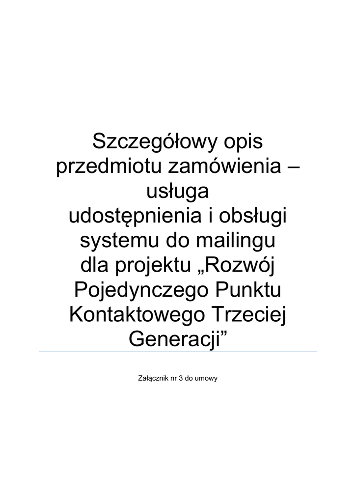 Szczegółowy opis przedmiotu zamówienia – usługa udostępnienia i obsługi systemu do mailingu dla projektu „Rozwój Pojedynczego Punktu Kontaktowego Trzeciej Generacji” Załącznik nr 3 do umowy Spis treści I. Opis Pojedynczego Punktu Kontaktowego (PPK) ........................................................... 2 II. Cel wysyłania wiadomości ..................................................................................................... 2 III. Przedmiot Zamówienia ............................................................................................................ 2 IV. Szczegółowy Opis Przedmiotu Zamówienia...................................................................... 3 1. Baza danych i domena ............................................................................................................ 3 2. Tworzenie i wysyłanie wiadomości...................................................................................... 4 3. Raportowanie ............................................................................................................................. 5 4. Wymagania dostępowe do platformy .................................................................................. 6 5. Wsparcie ze strony Wykonawcy ........................................................................................... 6 6. Zabezpieczenie powierzenia danych osobowych Wykonawcy .................................... 6 1 I. Opis Pojedynczego Punktu Kontaktowego (PPK) Celem funkcjonującej pod domenami www.biznes.gov.pl i www.businessinpoland.gov.pl platformy jest stworzenie Pojedynczego Punktu Kontaktowego - kompleksowego narzędzia dla przedsiębiorców z kraju i zagranicy, które w jednym miejscu oferuje dostęp do informacji i usług e-Administracji związanych z rozpoczęciem, wykonywaniem, w tym uzyskiwaniem koncesji, zezwoleń, licencji i zakończeniem działalności gospodarczej w Polsce. W serwisie www.biznes.gov.pl i www.businessinpoland.gov.pl prezentowane są następujące treści: 1. Informacyjne – opisy procedur, interpretacje prawne, wzory wniosków i formularzy, odpowiedzi na pytania, wizytówki urzędów; 2. Interakcyjne – możliwość zadania pytania do Centrum Pomocy, kreatory treści i procedur tzw. interaktywne poradniki przedsiębiorcy, możliwości przygotowania formularzy i wniosków on-line; 3. Transakcyjne – elektroniczna (on-line) możliwość wysłania wniosku do danego urzędu oraz dalsza realizacja procedur – odebranie pisma z urzędów i udzielenie odpowiedzi. II. Cel wysyłania wiadomości Celem dostarczania spersonalizowanych wiadomości tekstowych i graficznych za pomocą poczty elektronicznej do przedsiębiorców oraz użytkowników platform biznes.gov.pl i firma.gov.pl jest przekazywanie informacji z zakresu usług i treści udostępnianych na platformie Pojedynczego punktu kontaktowego oraz informacji związanych z prowadzeniem działalności gospodarczej, m. in. dotyczących terminów, wymaganych płatności zgodnie z kalendarzem przedsiębiorcy, terminów składania deklaracji i wniosków, itp. III. Przedmiot Zamówienia Przedmiotem Zamówienia jest świadczenie przez Wykonawcę usługi polegającej na udostępnieniu platformy i narzędzi niezbędnych do samodzielnego dostarczania przez Zamawiającego spersonalizowanych wiadomości tekstowych i graficznych za pomocą poczty elektronicznej do przedsiębiorców oraz użytkowników platform biznes.gov.pl i firma.gov.pl. Usługa ma być świadczona w okresie sześciu miesięcy od dnia zawarcia umowy. 2 IV. Szczegółowy Opis Przedmiotu Zamówienia Zamawiający dysponuje własną bazą przedsiębiorców, a wysyłane wiadomości będą miały charakter informacyjny (nie będą wysyłane komercyjne oferty handlowe). Zakres zamówienia obejmuje: - - import bazy przedsiębiorców i użytkowników, maksymalnie do 900 tysięcy rekordów, udostępnienie platformy i narzędzi potrzebnych do przygotowania i wysyłki pocztą elektroniczną na adresy wskazane w bazie adresów e-mailowych Zamawiającego wiadomości tekstowych i graficznych, wsparcie specjalistów ze strony Wykonawcy. Udostępniona przez Wykonawcę usługa powinna uwzględnić minimalne wymagania w następujących zakresach: 1. Baza danych i domena 1.1. Wielkość bazy 900 tysięcy odbiorców. Zakłada się, że w danym miesiącu będzie realizowana wysyłka od dwóch do pięciu wiadomości do określonych grup odbiorców. Każdorazowo liczba odbiorców wiadomości nie będzie większa niż 900 tysięcy. Możliwe jest kierowanie wiadomości do mniej licznych grup odbiorców. Wykonawca zapewni dostęp do platformy mailingowej, która umożliwi: - wgranie i zapisanie bazy odbiorców Zamawiającego z zewnętrznych źródeł w swoim systemie wysyłkowym na serwerze dedykowanym dla Zamawiającego (zapisanych w formacie .csv, .xls, .xlsx), - wykrywanie błędnych adresów pocztowych przy imporcie bazy, - tworzenie nieograniczonej liczby segmentów bazy Zamawiającego według własnych kryteriów i potrzeb, - automatyczną modyfikację/usuwanie odbiorców z listy w powodu niedostarczenia wiadomości, - wypisywanie się z listy subskrybentów, poprzez kliknięcie w link w stopce maila – automatyczne usuwanie odbiorców z listy. odbiorców przez zależności od 1.2. Zapewnienie dedykowanego adresu IP wyłącznie dla Zamawiającego do wysyłek wiadomości pocztowych, umożliwiającego jednoznaczne skojarzenie z nazwą domenową Zamawiającego. 3 1.3. Udostępnienie funkcjonalności tworzenia grup odbiorców opartych na ich zachowaniu w zrealizowanych kampaniach (np. odbiorca otworzył konkretnego maila, nie otworzył maila, otworzył maila i kliknął w link, nie otrzymał maila). 1.4. System antyspamowy - dedykowany adres IP powinien zostać wpisany na listę zaufanych dostawców wiadomości oraz zostać dodany do listy czołowych polskich dostawców usług poczty elektronicznej (m.in. onet.pl, wp.pl, o2.pl, Interia.pl, google