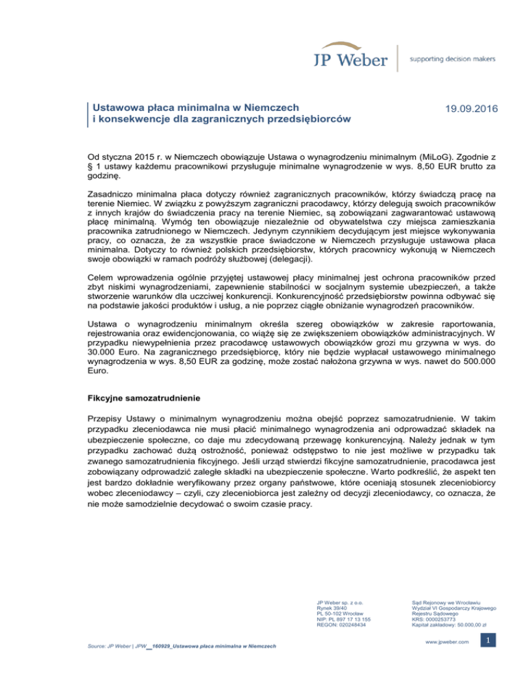 Ustawowa płaca minimalna w Niemczech i konsekwencje dla zagranicznych przedsiębiorców 19.09.2016 Od styczna 2015 r. w Niemczech obowiązuje Ustawa o wynagrodzeniu minimalnym (MiLoG). Zgodnie z § 1 ustawy każdemu pracownikowi przysługuje minimalne wynagrodzenie w wys. 8,50 EUR brutto za godzinę. Zasadniczo minimalna płaca dotyczy również zagranicznych pracowników, którzy świadczą pracę na terenie Niemiec. W związku z powyższym zagraniczni pracodawcy, którzy delegują swoich pracowników z innych krajów do świadczenia pracy na terenie Niemiec, są zobowiązani zagwarantować ustawową płacę minimalną. Wymóg ten obowiązuje niezależnie od obywatelstwa czy miejsca zamieszkania pracownika zatrudnionego w Niemczech. Jedynym czynnikiem decydującym jest miejsce wykonywania pracy, co oznacza, że za wszystkie prace świadczone w Niemczech przysługuje ustawowa płaca minimalna. Dotyczy to również polskich przedsiębiorstw, których pracownicy wykonują w Niemczech swoje obowiązki w ramach podróży służbowej (delegacji). Celem wprowadzenia ogólnie przyjętej ustawowej płacy minimalnej jest ochrona pracowników przed zbyt niskimi wynagrodzeniami, zapewnienie stabilności w socjalnym systemie ubezpieczeń, a także stworzenie warunków dla uczciwej konkurencji. Konkurencyjność przedsiębiorstw powinna odbywać się na podstawie jakości produktów i usług, a nie poprzez ciągłe obniżanie wynagrodzeń pracowników. Ustawa o wynagrodzeniu minimalnym określa szereg obowiązków w zakresie raportowania, rejestrowania oraz ewidencjonowania, co wiążę się ze zwiększeniem obowiązków administracyjnych. W przypadku niewypełnienia przez pracodawcę ustawowych obowiązków grozi mu grzywna w wys. do 30.000 Euro. Na zagranicznego przedsiębiorcę, który nie będzie wypłacał ustawowego minimalnego wynagrodzenia w wys. 8,50 EUR za godzinę, może zostać nałożona grzywna w wys. nawet do 500.000 Euro. Fikcyjne samozatrudnienie Przepisy Ustawy o minimalnym wynagrodzeniu można obejść poprzez samozatrudnienie. W takim przypadku zleceniodawca nie musi płacić minimalnego wynagrodzenia ani odprowadzać składek na ubezpieczenie społeczne, co daje mu zdecydowaną przewagę konkurencyjną. Należy jednak w tym przypadku zachować dużą ostrożność, ponieważ odstępstwo to nie jest możliwe w przypadku tak zwanego samozatrudnienia fikcyjnego. Jeśli urząd stwierdzi fikcyjne samozatrudnienie, pracodawca jest zobowiązany odprowadzić zaległe składki na ubezpieczenie społeczne. Warto podkreślić, że aspekt ten jest bardzo dokładnie weryfikowany przez organy państwowe, które oceniają stosunek zleceniobiorcy wobec zleceniodawcy – czyli, czy zleceniobiorca jest zależny od decyzji zleceniodawcy, co oznacza, że nie może samodzielnie decydować o swoim czasie pracy. JP Weber sp. z o.o. Rynek 39/40 PL 50-102 Wrocław NIP: PL 897 17 13 155 REGON: 020248434 Source: JP Weber | JPW _160929_Ustawowa płaca minimalna w Niemczech Sąd Rejonowy we Wrocławiu Wydział VI Gospodarczy Krajowego Rejestru Sądowego KRS: 0000253773 Kapitał zakładowy: 50.000,00 zł www.jpweber.com 1 Brak płacy minimalnej dla zagranicznych kierowców samochodów ciężarowych Należy wskazać, że Ustawa o wynagrodzeniu minimalnym dotyczy również pracowników zagranicznych przedsiębiorstw, którzy posiadają swoje miejsce pracy za granicą i krótkoterminowo pracują w Niemczech – odnosi się to do kierowców wykonujących tranzyt oraz przewozy kabotażowe. Zgodnie z wolą niemieckiego ustawodawcy zagraniczny kierowca samochodu ciężarowego powinien mieć prawo do otrzymania minimalnego wynagrodzenia za swój przejazd przez Niemcy. Ponieważ Komisja Europejska nie zgadzała się jednak z powyższym przepisem niemieckiego ustawodawcy, uruchomiła przed rokiem postępowanie wobec Niemiec w zakresie naruszenia zasad swobody przepływu usług wykonywanych przez kierowców ciężarówek przejeżdżających przez Niemcy tranzytem. Wg Komisji Europejskiej objęcie przepisami o płacy minimalnej ograniczałoby w nieproporcjonalnym stopniu wolność świadczenia usług i wolność przepływu dóbr w UE. W ten sposób kontrole związane z dotrzymywaniem zasad o płacy minimalnej mogłyby prowadzić do opóźnień na granicach. Podobne postępowanie Komisja Europejska uruchomiła również wobec Francji. Jeśli wszystkie kraje będą miały wspólny punkt widzenia, Komisja Europejska może nawet zainicjować sprawę wobec Francji i Niemiec przed Europejskim Trybunałem Sprawiedliwości. Istnieje zatem szeroka lista otwartych kwestii w zakresie prawa europejskiego, które wymagają wyjaśnienia. Do tego czasu nie będą wszczynane żadne postępowania w zakresie wykroczeń, a także zostają wstrzymane kontrole na granicach, mające na celu weryfikację stosowania Ustawy o wynagrodzeniu minimalnym. Nie ma także obowiązku przygotowywania oraz składania żadnych raportów czy planowania zatrudnienia dla zwykłego tranzytu. Warto jednak wskazać, że nie dotyczy to jednak kierowców ciężarówek, które są załadowywane i rozładowywane na terenie Niemiec. W przypadku ewentualnych pytań w powyższym zakresie jesteśmy oczywiście do Państwa dyspozycji. Magdalena Dubrownik - Winnicka Senior Associate, Attorney at Law +48 (71) 36 99 545 M.Dubrownik-Winnicka @jpweber.com Arthur Winczura Associate, +48 (71) 36 99 546 [email protected] Source: JP Weber | Ustawowa płaca minimalna w Niemczech i konsekwencje dla zagranicznych przedsiębiorców JPW_160929_Ustawowa płaca minimalna w Niemczech www.jpweber.com 2