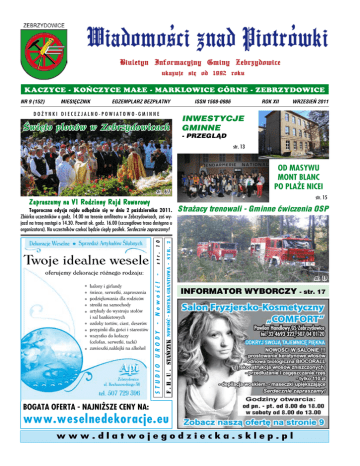 KOÖCZYCE MAŁE MAÈE - MARKLOWICE GÓRNE - ZEBRZYDOWICE KACZYCE - KOŃCZYCE (145) NR 92 (152) MIESIÊCZNIK EGZEMPLARZ bezp£atny BEZP£ATNY egzemplarz D o ż y n k i D i e c e z j a l n o - P o w i a t o w o - G m i nn e Unijny projekt Święto plonów w Zebrzydowicach w przedszkolu ISSN 1508-0986 Inwestycje gminne - przegląd str. 13 ROK XII wrzesień LUTY 2011 Rok XII IX Halowy Turniej Piãki Noēnej w Kaczycach str. 11 OD MASYWU DiecezjalneMONT Doæynki BLANC w tym roku w Zebrzydowicach PO PLAŻE NICEI str. 6-7 str. 16 Zapraszamy VI Rodzinny Rajd Rowerowy Gminne Przedszkolena Publiczne w Zebrzydowicach z oddziaäami w Marklowicach Gór- nowość NOWO¹» - kostka KOSTKA granitowa GRANITOWA - s St Tr R. 2 Strażacy konkurs fotograficzny „cztery pory roku” SzczegóÊy str. 5 W TYM NUMERZE: 9 WaÔne zmiany w opiece zdrowotnej - str. 13 9 Poradnik dla rodziców -str. str. 19 17 9 KÌcik kulinarny informator wyborczy - str.- str. 1719 F . H . U . Stañczyk STAÑCZYK S TtUuD d U DrYo -d Syo l a-r i uNmo nwo ow śe ćl a ! m-p y sI Oi o URO t rs t. r . 160 edycja rajdu w dzieci dniu na 2 rok października 2011. nych,Tegoroczna Kaczycach i Koþczycach Maäychodbędzie ogäasza, Ĕesię zapisy szkolny 2011/2012 odbödñ uczestników siö w marcu o2011 KartynazgÊoszeØ bÖdÌ dostÖpne w wymienionych Zbiórka godz.r. 14.00 terenie amfiteatru w Zebrzydowicach, zaś wyplacówkach od 01.03.2011 r. Przedok. zäoĔeniem karty (szczegółowa prosimy rodziców jazd na trasę nastąpi o 14.30. Powrót godz. 16.00 trasao zapoznanie dostępna u siö z zasadami Na rekrutacji (dostöpne w kaĔdej organizatora). uczestników czekać będzieplacówce). ciepły posiłek. Serdecznie zapraszamy! Na 11 wrzeÎnia tego roku zaplanowano str. w Ze15 brzydowicach uroczystoÎci zwiÌzane z tradycyjnymi DoÔynkami-Diecezjalnymi. Wezmñ w nich udziaäOSP oprócz trenowali Gminne ćwiczenia rolników równieĔ przedstawiciele wäadz koĈcielnych, samorzñdowych i paþstwowych. BOGATA oferta OFERTA - najniższe NAJNIÓSZE ceny CENY na: NA: Bogata www.weselnedekoracje.eu w w w . d l a t w o j e g o d z i e c k a . s k l eWiadomoœci p . p lznad Piotrówki 1 SkÊad jest czynny: od pn.-pt. 8.00 - 16.00 w soboty odjest 8.00czynny: do 13.00 Skład od pn.-pt. 7.00 - 16.00 www.fhustanczyk.pl w soboty od 7.00 do 13.00 www.fhustanczyk.pl GROSZEK ZWYKŁY EKO-GROSZEK - do pieców z podajnikiem - KWK Bobrek Węgiel: Orzech - Piast nowa Posezo daż Orzech--KWK Marcel ORZECH Piast wyprze ów MUŁ - KWK -Rydułtowy Groszek Ziemowit kształtownikbat 20% Ra FLOT - KWK Marcel znych Eko groszek - Bobrek żelaChwałowice FLOT - KWK Jankowice - Rydułtowy -Muł zasuwy, zamki, zawiasy, klamki i inne Flot - Marcel artykuły metalowe, drut do migo-mag Flot - Jankowice Transport przy zakupie 1 tony Transport przy zakupie tony opału na terenie gminy -1gratis! opału na terenie gminy - gratis! Oferujemy węgiel workowany Groszek - eko-groszek (na paletach) Oferujemy węgiel workowany i koks na paletach z rozładunkiem Groszek - eko-groszek (na paletach) za pomocą HDS-u! HDS-u! z rozładunkiem za pomocą PRAKTYCZNIEIIWYGODNIE WYGODNIE PRAKTYCZNIE Zasuwy, zamki, zawiasy, klamki i inne artykuły metalowe, drut do migo-mag Żagiel i Lukas - kamień czerwony - granulacja 8 do 16 Kostka granitowa - kostka szara - kostka rudo-szara - kostka czarna - kostka czerwona 2 Wiadomoœci znad Piotrówki 32 469 10 39 2 Wiadomoœci znad Piotrówki NA RATY GRANITOWY grYSY KOLOROWE - biały, różowy, zielony, szary Obrzeża granitowe 40 x 20 Obrzeża granitowe 100 x 20 Kamień murowy granitowy Zasypka granitowa Zamówienia telefoniczne 32 469 10 39 ZAMÓWIENIA TELEFONICZNE opał, piasek, kamień, . kostka granitowa itp U MACIERZOWCÓW w tym roku towarowe) i przez kilka nocy uzupełniają transport. Krewnych naszej gospodyni też wywieźli: dzieci osobno, mężczyzn osobno, a kobiety też osobno. My mieszkaliśmy około półtora kilometra od stacji, ale jęki, po prostu nieludzkie wycie tych ludzi, dochodziły aż do nas.... Pomóc im nie było jak, bo jak ktoś się zbliżył (bodajże z przegotowaną gorącą wodą) zaraz go patrol postrzelił. Odwieźli go na pół żywego do lasu, w śniegu zagrzebali i tam konał... Pani Helenie udało się ustrzec od wywózki. Jednak wielu z tych”pasażerów” nie dojechało na miejsce zsyłki. Umierali w drodze z głodu, chorób, ginęli za byle co, bo takie było widzimisię transportujących sowieckich żołnierzy. Polskich oficerów i funkcjonariuszy trzymano w obozach. Ciesząc się „złotą polską jesienią” nie możemy jednak wyrzucić z pamięci tamtych dni i miesięcy, pamiętajmy o tych, którym nie udało się wrócić do Polski. Pamiętajmy o naszych mieszkańcach, funkcjonariuszach polskiej policji i wojska, którzy zostali bezimiennych grobach w Katyniu i Kozielsku, Starobielsku i Charkowie, Ostaszkowie i Miednoje oraz w innych miejscach całej Rosji. Cześć ich pamięci! Helena Bartoszek Bieżący rok w działalności Koła Macierzy Ziemi Cieszyńskiej w Zebrzydowicach możemy chyba uznać za udany. Liczba członków naszego koła zwiększyła się w tym roku już o 14 osób. Majowa wystawa „Gmina Zebrzydowice na starej fotografii”przyciągnęła do Galerii nad Młyńszczokiem wielu zwiedzających. Byli to starsi i młodzi mieszkańcy naszych miejscowości. Jedni mieli okazję przypomnieć sobie dawniejsze lata, przyjaciół, zdarzenia itp. Młodzież, która może słyszała o nieistniejących już obiektach czy ważniejszych wydarzeniach, mogła je zobaczyć na zachowanych zdjęciach. Kolejna wystawa pozwoli nam przeżyć na nowo długie lata pontyfikatu Jana Pawła II. Spotkania z ciekawymi ludźmi dostarczają nam wiele wzruszeń. W lutym odwiedziła nas Bogdana Zakolska, w listopadzie Władysława Magiera opowie nam o kobietach cieszyńskich, o nowym szlaku turystycznym w Cieszynie. W maju gościliśmy delegację z zaprzyjaźnionego Koła Warmińsko – Mazurskiego w Olsztynie oraz z Pia