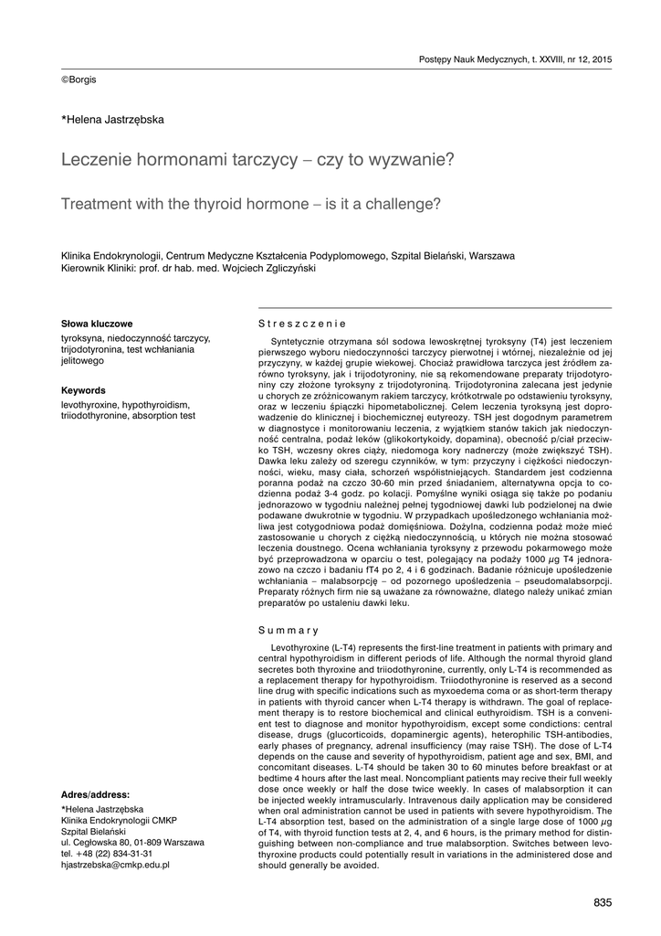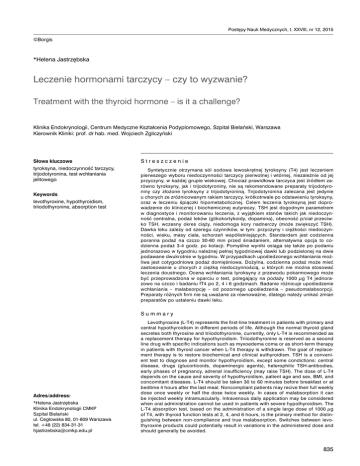 Postępy Nauk Medycznych, t. XXVIII, nr 12, 2015 ©Borgis *Helena Jastrzębska Leczenie hormonami tarczycy – czy to wyzwanie? Treatment with the thyroid hormone – is it a challenge? Klinika Endokrynologii, Centrum Medyczne Kształcenia Podyplomowego, Szpital Bielański, Warszawa Kierownik Kliniki: prof. dr hab. med. Wojciech Zgliczyński Słowa kluczowe Streszczenie tyroksyna, niedoczynność tarczycy, trijodotyronina, test wchłaniania jelitowego Syntetycznie otrzymana sól sodowa lewoskrętnej tyroksyny (T4) jest leczeniem pierwszego wyboru niedoczynności tarczycy pierwotnej i wtórnej, niezależnie od jej przyczyny, w każdej grupie wiekowej. Chociaż prawidłowa tarczyca jest źródłem zarówno tyroksyny, jak i trijodotyroniny, nie są rekomendowane preparaty trijodotyroniny czy złożone tyroksyny z trijodotyroniną. Trijodotyronina zalecana jest jedynie u chorych ze zróżnicowanym rakiem tarczycy, krótkotrwale po odstawieniu tyroksyny, oraz w leczeniu śpiączki hipometabolicznej. Celem leczenia tyroksyną jest doprowadzenie do klinicznej i biochemicznej eutyreozy. TSH jest dogodnym parametrem w diagnostyce i monitorowaniu leczenia, z wyjątkiem stanów takich jak niedoczynność centralna, podaż leków (glikokortykoidy, dopamina), obecność p/ciał przeciwko TSH, wczesny okres ciąży, niedomoga kory nadnerczy (może zwiększyć TSH). Dawka leku zależy od szeregu czynników, w tym: przyczyny i ciężkości niedoczynności, wieku, masy ciała, schorzeń współistniejących. Standardem jest codzienna poranna podaż na czczo 30-60 min przed śniadaniem, alternatywna opcja to codzienna podaż 3-4 godz. po kolacji. Pomyślne wyniki osiąga się także po podaniu jednorazowo w tygodniu należnej pełnej tygodniowej dawki lub podzielonej na dwie podawane dwukrotnie w tygodniu. W przypadkach upośledzonego wchłaniania możliwa jest cotygodniowa podaż domięśniowa. Dożylna, codzienna podaż może mieć zastosowanie u chorych z ciężką niedoczynnością, u których nie można stosować leczenia doustnego. Ocena wchłaniania tyroksyny z przewodu pokarmowego może być przeprowadzona w oparciu o test, polegający na podaży 1000 µg T4 jednorazowo na czczo i badaniu fT4 po 2, 4 i 6 godzinach. Badanie różnicuje upośledzenie wchłaniania – malabsorpcję – od pozornego upośledzenia – pseudomalabsorpcji. Preparaty różnych firm nie są uważane za równoważne, dlatego należy unikać zmian preparatów po ustaleniu dawki leku. Keywords levothyroxine, hypothyroidism, triiodothyronine, absorption test Summary Adres/address: *Helena Jastrzębska Klinika Endokrynologii CMKP Szpital Bielański ul. Cegłowska 80, 01-809 Warszawa tel. +48 (22) 834-31-31 [email protected] Levothyroxine (L-T4) represents the first-line treatment in patients with primary and central hypothyroidism in different periods of life. Although the normal thyroid gland secretes both thyroxine and triiodothyronine, currently, only L-T4 is recommended as a replacement therapy for hypothyroidism. Triiodothyronine is reserved as a second line drug with specific indications such as myxoedema coma or as short-term therapy in patients with thyroid cancer when L-T4 therapy is withdrawn. The goal of replacement therapy is to restore biochemical and clinical euthyroidism. TSH is a convenient test to diagnose and monitor hypothyroidism, except some condictions: central disease, drugs (glucorticoids, dopaminergic agents), heterophilic TSH-antibodies, early phases of pregnancy, adrenal insufficiency (may raise TSH). The dose of L-T4 depends on the cause and severity of hypothyroidism, patient age and sex, BMI, and concomitant diseases. L-T4 should be taken 30 to 60 minutes before breakfast or at bedtime 4 hours after the last meal. Noncompliant patients may recive their full weekly dose once weekly or half the dose twice weekly. In cases of malabsorption it can be injected weekly intramuscularly. Intravenous daily application may be considered when oral administration cannot be used in patients with severe hypothyroidism. The L-T4 absorption test, based on the administration of a single large dose of 1000 µg of T4, with thyroid function tests at 2, 4, and 6 hours, is the primary method for distinguishing between non-compliance and true malabsorption. Switches between levothyroxine products could potentially result in variations in the administered dose and should generally be avoided. 835 Helena Jastrzębska WSTĘP Syntetycznie otrzymana sól sodowa lewoskrętnej tyroksyny (L-T4), podawana doustnie, jest leczeniem standardowym przypadków niedoczynności tarczycy zarówno pierwotnej, jak i wtórnej, niezależnie od jej przyczyny, w różnych okresach życia takich jak ciąża, okres noworodkowy, dzieciństwo, w każdej grupie wiekowej, także u osób starszych ze schorzeniami współistniejącymi (1). Nie są rekomendowane preparaty suszonej tarczycy, trijodotyroniny czy złożone tyroksyny z trijodotyroniną. Zalecenie takie podaje szereg towarzystw naukowych, w tym ETA (European Thyroid Association), ATA (American Thyroid Association) i AACE (American Association of Clinical Endocrinologists) (2). WCHŁANIANIE TYROKSYNY Preparaty tyroksyny wchłaniają się w górnym odcinku przewodu pokarmowego, z czego 21% w dwunastnicy, 45% w górnym odcinku jelita cienkiego i 34% w dolnym odcinku jelita cienkiego, prowadząc do maksymalnego wzrostu stężenia tyroksyny w surowicy po 2-4 godzinach. Okres półtrwania hormonu wynosi 7 dni, dlatego stabilny poziom tyroksyny osiąga się przy podaży jednorazowo dziennie. Stopień wchłaniania tabletkowanego leku zależy od pH żołądka. Głodzenie zwiększa stopień wchłaniania, natomiast jedzenie i niektóre leki oraz zespoły złego wchłaniania – upośledzają. Przy podaży na czczo wchłanianiu ulega 70-80% podanej dawki. Uważa się, że zastosowanie żelatynowych kapsułek i kropli mogłoby zapewnić 100% wchłanianie, ponieważ w tej formie jest ono niezależne od pH 