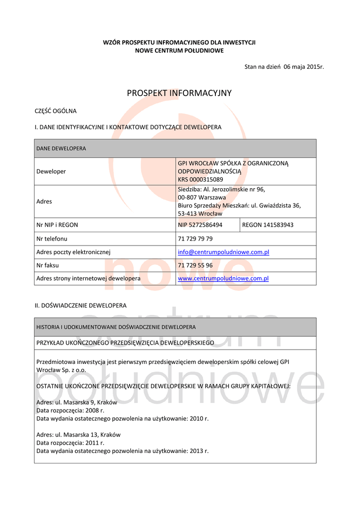 WZÓR PROSPEKTU INFROMACYJNEGO DLA INWESTYCJI NOWE CENTRUM POŁUDNIOWE Stan na dzień 06 maja 2015r. PROSPEKT INFORMACYJNY CZĘŚĆ OGÓLNA I. DANE IDENTYFIKACYJNE I KONTAKTOWE DOTYCZĄCE DEWELOPERA DANE DEWELOPERA Deweloper Adres GPI WROCŁAW SPÓŁKA Z OGRANICZONĄ ODPOWIEDZIALNOŚCIĄ KRS 0000315089 Siedziba: Al. Jerozolimskie nr 96, 00-807 Warszawa Biuro Sprzedaży Mieszkań: ul. Gwiaździsta 36, 53-413 Wrocław Nr NIP i REGON NIP 5272586494 REGON 141583943 Nr telefonu 71 729 79 79 Adres poczty elektronicznej [email protected] Nr faksu 71 729 55 96 Adres strony internetowej dewelopera www.centrumpoludniowe.com.pl II. DOŚWIADCZENIE DEWELOPERA HISTORIA I UDOKUMENTOWANE DOŚWIADCZENIE DEWELOPERA PRZYKŁAD UKOŃCZONEGO PRZEDSIĘWZIĘCIA DEWELOPERSKIEGO Przedmiotowa inwestycja jest pierwszym przedsięwzięciem deweloperskim spółki celowej GPI Wrocław Sp. z o.o. OSTATNIE UKOŃCZONE PRZEDSIĘWZIĘCIE DEWELOPERSKIE W RAMACH GRUPY KAPITAŁOWEJ: Adres: ul. Masarska 9, Kraków Data rozpoczęcia: 2008 r. Data wydania ostatecznego pozwolenia na użytkowanie: 2010 r. Adres: ul. Masarska 13, Kraków Data rozpoczęcia: 2011 r. Data wydania ostatecznego pozwolenia na użytkowanie: 2013 r. PRZYKŁAD INNEGO UKOŃCZONEGO PRZEDSIĘWZIĘCIA DEWELOPERSKIEGO W RAMACH GRUPY KAPITAŁOWEJ: Adres: ul. Słoneczna, Magdalenka Data rozpoczęcia: 2006 r. Data wydania ostatecznego pozwolenia na użytkowanie: 2010 r. Adres: Sevilla Distrito Sur, Hiszpania Data rozpoczęcia: 2006 r. Data wydania ostatecznego pozwolenia na użytkowanie: 2009 r. Adres: Malaga, Hiszpania Data rozpoczęcia: 2006 r. Data wydania ostatecznego pozwolenia na użytkowanie: 2009 r. Adres: Estepona (Malaga), Hiszpania Data rozpoczęcia: 2004 r. Data wydania ostatecznego pozwolenia na użytkowanie: 2007 r. Adres: Cordoba, Hiszpania Data rozpoczęcia: 2004 r. Data wydania ostatecznego pozwolenia na użytkowanie: 2007 r. Adres: Denia (Alicante), Hiszpania Data rozpoczęcia: 2004 r. Data wydania ostatecznego pozwolenia na użytkowanie: 2007 r. Adres: Benidor (Alicante), Hiszpania Data rozpoczęcia: 2007 r. Data wydania ostatecznego pozwolenia na użytkowanie: 2010 r. Czy przeciwko deweloperowi prowadzono (lub prowadzi się) postępowanie egzekucyjne na kwotę powyżej 100 000 zł? nie III. INFORMACJE DOTYCZĄCE NIERUCHOMOŚCI I PRZEDSIĘWZIĘCIA DEWELOPERSKIEGO INFORMACJE DOTYCZĄCE GRUNTU Adres i nr działki ewidencyjnej Wrocław, ul. Gwiaździsta, dz. Nr 62/ 4 , AM 14, obręb Południe Nr księgi wieczystej WR1K/00288400/6 Istniejące obciążenia hipoteczne nieruchomości lub wnioski o wpis w dziale czwartym księgi wieczystej Hipoteka umowna do kwoty 116.634.940,00 zł na zabezpieczenie kredytu wraz z należnymi odsetkami umownymi zwykłymi i podwyższonymi oraz odsetkami za opóźnienie, wszelkie inne roszczenia o świadczenia uboczne wynikające z umowy kredytu, tj. prowizje, opłaty i roszczenia o zwrot kosztów, umowa kredytu nr 14/0013 z dnia 29 maja 2014 r., wpisana na rzecz: mBank Hipoteczny Spółka Akcyjna z siedzibą w Warszawie, REGON 01495363400000 Przeznaczenie w planie: Usługi i zabudowa mieszkaniowa wielorodzinna Plan zagospodarowania przestrzennego dla sąsiednich działek Dopuszczalna wysokość zabudowy: W pasie o szerokości 6m wzdłuż ulic Gwiaździstej i Powstańców Śląskich do 24 m. Na pozostałej części terenu bez ograniczenia wynikającego z zapisów planu miejscowego, Dopuszczalny procent zabudowy działki: Dopuszczone jest zabudowanie 100% powierzchni sąsiednich działek z zastrzeżeniem, że dla zabudowy mieszkalnej wielorodzinnej minimalny udział powierzchni biologicznie czynnej ma wynosić 25%, dla innej zabudowy warunek ten nie jest wymagany. I. Na podstawie zapisów obowiązujących miejscowych planów Informacje zawarte w publicznie zagospodarowania przestrzennego, na terenach objętych dostępnych dokumentach ustaleniami planów w promieniu 1km od przedmiotowej dotyczących przewidzianych innych nieruchomości planowane są: inwestycji w promieniu 1 km od 1. na terenie położonym pomiędzy ulicami Powstańców przedmiotowej nieruchomości, w Śląskich a Gwiaździstą w obszarze obowiązywania szczególności o budowie lub miejscowego planu zagospodarowania przestrzennego rozbudowie dróg, budowie linii obejmującego również przedmiotową nieruchomość: szynowych oraz przewidzianych zabudowa biurowo – usługowa o dużej intensywności, korytarzach powietrznych, a także w tym budynki wysokie i wysokościowe wraz z znanych innych inwestycjach towarzysząca infrastrukturą; zabudowa mieszkalna komunalnych, w szczególności wielorodzinna; możliwa budowa linii tramwajowej oczyszczalniach ścieków, spalarniach wzdłuż ulicy Szczęśliwej; wzdłuż ulicy Powstańców śmieci, wysypiskach, cmentarzach Śląskich przebudowa chodnika oraz ścieżki rowerowej po zachodniej stronie ulicy, 2. pozostałe miejscowe plany zagospodarowania przestrzennego obowiązujące w promieniu 1km od przedmiotowej dopuszczają realizację: zabudowy mieszkalnej wielorodzinnej, usługowej, handlowej wraz z dopuszczeniem handlu wielkopowierzchniowego (powyżej 2000m2 powierzchni sprzedażowej), obiektów kultury, obiektów sportowych, obiektów sakralnych, obiektów służby zdrowia, infrastruktury towarzyszącej w/w zabudowie, w tym parkingi i drogi wewnętrzne; poszerzenia jezdni ulicy powstańców Śląskich na odcinku pomiędzy ul. Swobodną a torami kolejowymi; parkingów wielopoziomowych nadziemnych i podziemnych; rozbudowy wzdłuż ulicy Nasypowej oraz ul. Suchej torów kolejowych istniejącej linii kolejowej; budowę torowiska tramwajowego po zachodniej stronie ul. Borowskiej; przebudowę i modernizację istniejących dróg i ulic. W obszarach obowiązywania miejscowych planów zagospodarowania przestrzennego nie ma zakazu lokalizowania stacji przekaźnikowych telefonii komórkowej, II. Na podstawie decyzji ustalających lokalizacje inwestycji celu publicznego oraz ustalających warunki zabudowy dla innych inwesty