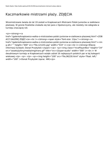 Radio Opole: http://radio.opole.pl/102,91294,kaczmarkowie-mistrzami-plazy-zdjecia Kaczmarkowie mistrzami plaży. ZDJĘCIA Wicemistrzowie świata do lat 19 zostali w Krapkowicach Mistrzami Polski Juniorów w siatkówce plażowej. W gronie finalistów znalazła się też para z Opolszczyzny, ale niestety nie odegrała w turnieju znaczącej roli. <p><strong><a href="/galerie/krapkowice-walka-o-mistrzostwo-polski-juniorow-w-siatkowce-plazowej.html">ZOB ACZ GALERIĘ ZDJĘĆ</a><br /></strong><span style="font-size: 12px;"><strong><a href="/galerie/krapkowice-walka-o-mistrzostwo-polski-juniorow-w-siatkowce-plazowej.html"><im g alt=" " height="400" src="file,121241.jpg" width="533" /></a><br /></strong>Więcej informacji – Donat Przybylski:</span></p> <p><img class="mcePlayerBox" height="24" src="assets/js/tiny/media/img/trans.gif" title="src=1|type=audio" width="300" /><br /> W dwudniowym turnieju w Krapkowicach wzięło udział 16 najlepszych polskich par w tej kategorii wiekowej.</p> <p> </p> <p><img height="100" src="file,96230.html" style="float: left;" width="100" />Donat Przybylski (oprac. WK)</p>
