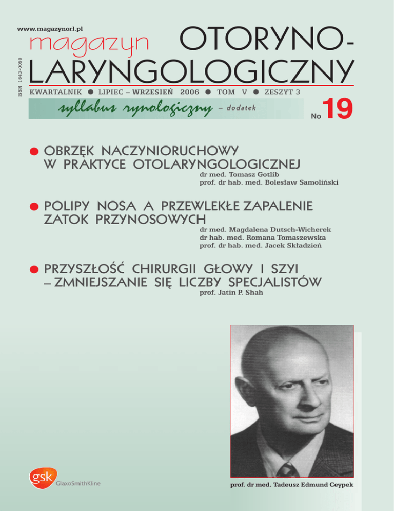 magazyn ISSN 1643-0050 www.magazynorl.pl OTORYNOLARYNGOLOGICZNY KWARTALNIK ● LIPIEC – WRZESIE¡ 2006 ● TOM V ● ZESZYT 3 syllabus rynologiczny – dodatek 19 No ● OBRZ¢K NACZYNIORUCHOWY W PRAKTYCE OTOLARYNGOLOGICZNEJ dr med. Tomasz Gotlib prof. dr hab. med. Boles∏aw Samoliƒski ● POLIPY NOSA A PRZEWLEK¸E ZAPALENIE ZATOK PRZYNOSOWYCH dr med. Magdalena Dutsch-Wicherek dr hab. med. Romana Tomaszewska prof. dr hab. med. Jacek Sk∏adzieƒ ● PRZYSZ¸OÂå CHIRURGII G¸OWY I SZYI – ZMNIEJSZANIE SI¢ LICZBY SPECJALISTÓW prof. Jatin P. Shah prof. dr med. Tadeusz Edmund Ceypek m a g a z y n OTORYNOLARYNGOLOGICZNY k w a r t a l n i k LIPIEC– WRZESIE¡ 2006 ● TOM V ● ZESZYT 3 (19) W NUMERZE TWORZYLI POLSKÑ LARYNGOLOGI¢ prof. dr med. Tadeusz Edmund Ceypek ...........................64 dr med. Stanis∏aw Zab∏ocki OBRZ¢K NACZYNIORUCHOWY W PRAKTYCE OTOLARYNGOLOGICZNEJ .............67 dr med. Tomasz Gotlib prof. dr hab. med. Boles∏aw Samoliƒski POLIPY NOSA A PRZEWLEK¸E ZAPALENIE ZATOK PRZYNOSOWYCH ........................................75 dr med. Magdalena Dutsch-Wicherek dr hab. med. Romana Tomaszewska prof. dr hab. med. Jacek Sk∏adzieƒ PRZYSZ¸OÂå CHIRURGII G¸OWY I SZYI – ZMNIEJSZANIE SI¢ LICZBY SPECJALISTÓW .......................83 prof. Jatin P. Shah syllabus rynologiczny – dodatek Komitet redakcyjny: redaktor naczelny – prof. dr hab. med. Antoni Krzeski sekretarz redakcji – dr med. Agnieszka Strzembosz redaktor – mgr Dorota Polewicz Patronat naukowy: Katedra i Klinika Otolaryngologii Akademii Medycznej w Warszawie Rada naukowa: przewodniczàcy: – prof. zw. dr hab. med. Grzegorz Janczewski cz∏onkowie: – prof. dr hab. med. Mieczys∏aw Chmielik – dr hab. med. Joanna Fruba – prof. zw. dr hab. med. Teresa Goêdzik-˚o∏nierkiewicz – dr hab. med. in˝. Krzysztof Kochanek – prof. dr hab. med. Barbara Maniecka-Aleksandrowicz – prof. dr hab. med. Kazimierz Niemczyk – prof. dr hab. med. Bo˝ena Tarchalska – prof. dr hab. med. Edward Zawisza Drodzy Czytelnicy, 42. Krajowy Zjazd PTORL-ChGiS przeszed∏ ju˝ do historii. Niewàtpliwie by∏o to wydarzenie w ˝yciu naszego Towarzystwa. Wysoki poziom merytoryczny, znakomita organizacja z poznaƒskim pietyzmem. Gratulujemy Organizatorom i dzi´kujemy za kawa∏ dobrej roboty. WÊród licznych wyk∏adów, sesji oraz sympozjów mia∏o miejsce wydarzenie, które przez wielu uczestników zapewne nie zosta∏o zauwa˝one, a moim zdaniem zas∏uguje na szczególnà uwag´. Otó˝ podczas uroczystoÊci otwarcia Zjazdu wr´czono Nagrody Naukowe im. prof. Jana Miodoƒskiego. Otrzyma∏y jà: dr med. Magdalena Dutsch-Wicherek z Krakowa, dr med. Iwona Gromek z Warszawy, dr med. Anna Galewicz-Zieliƒska z Warszawy, dr med. Katarzyna Starska z ¸odzi. Gratuluj´ wszystkim Paniom. Zastanawiajàce jest, ˝e w czasach masowej emigracji zarobkowej m∏odych lekarzy, wymuszanej przez obowiàzujàcy system opieki zdrowotnej, sà równie˝ osoby, które pracujàc w kraju aktywnie realizujà si´ równie˝ w obszarze prowadzenia prac naukowych. I znajdujà na to czas i fundusze, i okazuje si´, ˝e mo˝na tak wiele osiàgnàç. To wszystko zas∏uguje na najwy˝szy szacunek. Opracowanie graficzne: M-art, Jolanta Merc, tel. 739 88 24 © Wydawca: Wydawnictwo EGERIA B. Krzeska prof. dr hab. med. Antoni Krzeski przy wspó∏pracy Adres korespondencyjny: Magazyn Otorynolaryngologiczny 02-218 Warszawa 124, skr. poczt. 60 Warszawa, lipiec 2006 r. Wszelkie prawa zastrze˝one. Kopiowanie w cz´Êci lub w ca∏oÊci bez uzyskania zezwolenia wydawcy jest zabronione. Fotografia na ok∏adce – patrz strona 64. www.magazynorl.pl 63 TWORZYLI POLSKÑ LARYNGOLOGI¢ TADEUSZ EDMUND CEYPEK (1904–1990) Urodzi∏ si´ we Lwowie, syn Tadeusza, prawnika, i Kazimiery z d. Malewskiej. Nauki pobiera∏ w Gimnazjum Realnym w Wiedniu (1914–1915), Gimnazjum Realnym Tow. Szko∏y Ludowej w Bia∏ej Âlàskiej (1915–1918), a ukoƒczy∏ w lwowskim VIII Gimnazjum Matematyczno-Przyrodniczym Êwiadectwem dojrza∏oÊci w 1923 r. W latach 1918–1923 nale˝a∏ do XI Lwowskiej Dru˝yny Harcerskiej. Od grudnia 1918 do maja 1919 r. bra∏ udzia∏ w walkach w obronie Lwowa. W 1923 r. rozpoczà∏ studia na Wydziale Lekarskim Uniwersytetu Jana Kazimierza we Lwowie, który ukoƒczy∏ dyplomem lekarza 30. 05. 1931 r. W czasie studiów nale˝a∏ do organizacji Wzajemna Pomoc Medyków oraz Konwentu Obotricia. Od listopada 1925 r. pracowa∏ jako m∏odszy asystent demonstrator w Zak∏adzie Farmakologii DoÊwiadczalnej Uniwersytetu Jana Kazimierza 1.10.1931 r. objà∏ stanowisko asystenta, a w 1934 r. starszego asystenta Kliniki Otolaryngologicznej UJK, gdzie pracowa∏ do 21.09.1939 r. W maju i czerwcu 1932 r., jako stypendysta Funduszu Kultury Narodowej, przebywa∏ w celach naukowych w Klinice Otolaryngologicznej u prof. M. Hajka i w Klinice Chorób Wewn´trznych u prof. F. Wenckebacha w Wiedniu. Od 1.09.1931 r. kierowa∏ w Klinice UJK pracownià rentgenologicznà, a od 1935 r. prowadzi∏ w klinice oddzia∏ gruêlicy górnych dróg oddechowych. W latach 1934–1940 by∏ konsultantem w Lecznicy Lwowskiego Tow. Walki z Gruêlicà w Ho∏osku Wielkiem ko∏o Lwowa oraz kierownikiem Poradni Otolaryngologicznej Polikliniki Powszechnej. W latach 1938–1939 pracowa∏ w Opiece Zdrowotnej Lwowskich Szkó∏ Akademickich. Uchwa∏à Rady Wydzia∏u Lekarskiego UJK z 18.10.1939 r. zosta∏ habilitowany na docenta otolaryngologii na podstawie pracy pt. Leczenie miejscowe gruêlicy górnych dróg 64 m a g a z y n OTORYNOLARYNGOLOGICZNY oddechowych. Habilitacja zosta∏a zatwierdzona przez Ministerstwo OÊwiaty PRL 6.11.1947 r. z przeniesieniem na Wydzia∏ Lekarski Uniwersytetu we Wroc∏awiu. Podczas okupacji sowieckiej by∏ asystentem Kliniki Otolaryngologii Lwowskiego Paƒstwowego Instytutu Medycznego, a podczas okupacji niemieckiej asystentem w Paƒstwowych Medycznych Kursach Fachowych. Bra∏ udzia∏ w ruchu oporu, b´dàc cz∏onkiem