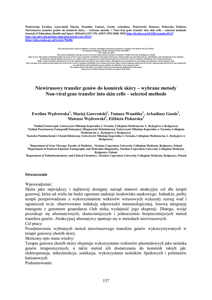 Wędrowska Ewelina, Gawroński Maciej, Wandtke Tomasz, Goede Arkadiusz, Wędrowski Mateusz, Piskorska Elżbieta. Niewirusowy transfer genów do komórek skóry – wybrane metody = Non-viral gene transfer into skin cells – selected methods. Journal of Education, Health and Sport. 2016;6(1):157-170. eISSN 2391-8306. DOI http://dx.doi.org/10.5281/zenodo.45147 http://ojs.ukw.edu.pl/index.php/johs/article/view/45147 https://pbn.nauka.gov.pl/works/704486 The journal has had 7 points in Ministry of Science and Higher Education parametric evaluation. Part B item 755 (23.12.2015). 755 Journal of Education, Health and Sport eISSN 2391-8306 7 © The Author (s) 2016; This article is published with open access at Licensee Open Journal Systems of Kazimierz Wielki University in Bydgoszcz, Poland Open Access. This article is distributed under the terms of the Creative Commons Attribution Noncommercial License which permits any noncommercial use, distribution, and reproduction in any medium, provided the original author(s) and source are credited. This is an open access article licensed under the terms of the Creative Commons Attribution Non Commercial License (http://creativecommons.org/licenses/by-nc/4.0/) which permits unrestricted, non commercial use, distribution and reproduction in any medium, provided the work is properly cited. This is an open access article licensed under the terms of the Creative Commons Attribution Non Commercial License (http://creativecommons.org/licenses/by-nc/4.0/) which permits unrestricted, non commercial use, distribution and reproduction in any medium, provided the work is properly cited. The authors declare that there is no conflict of interests regarding the publication of this paper. Received: 15.12.2015. Revised 12.01.2016. Accepted: 25.01.2016. Niewirusowy transfer genów do komórek skóry – wybrane metody Non-viral gene transfer into skin cells – selected methods Ewelina Wędrowska1, Maciej Gawroński1, Tomasz Wandtke1, Arkadiusz Goede1, Mateusz Wędrowski2, Elżbieta Piskorska3 1 Zakład Genoterapii, Uniwersytet Mikołaja Kopernika w Toruniu, Collegium Medicum im. L. Rydygiera w Bydgoszczy Zakład Pozytonowej Tomografii Emisyjnej i Diagnostyki Molekularnej, Uniwersytet Mikołaja Kopernika w Toruniu, Collegium Medicum im. L. Rydygiera w Bydgoszczy 3 Katedra Patobiochemii i Chemii Klinicznej, Uniwersytet Mikołaja Kopernika w Toruniu, Collegium Medicum im. L. Rydygiera w Bydgoszczy 2 1 Department of Gene Therapy, Faculty of Medicine, Nicolaus Copernicus University Collegium Medicum, Bydgoszcz, Poland Department of Positron Emission Tomography and Molecular Diagnostics, Nicolaus Copernicus University Collegium Medicum, Bydgoszcz, Poland 3 Department of Pathobiochemistry and Clinical Chemistry, Nicolaus Copernicus University Collegium Medicum, Bydgoszcz, Poland 2 Streszczenie Wprowadzenie: Skóra jako największy i najłatwiej dostępny narząd stanowi atrakcyjny cel dla terapii genowej, która od wielu lat budzi ogromne nadzieje środowiska naukowego. Jednakże, próby terapii przeprowadzone z wykorzystaniem wektorów wirusowych wykazały szereg wad i ograniczeń m.in. obserwowano indukcję odpowiedzi immunologicznej, losową integrację transgenu z genomem gospodarza i/lub niską wydajność jego ekspresji. Dlatego, wciąż poszukuje się alternatywnych, skuteczniejszych i jednocześnie bezpieczniejszych metod transferu genów. Atrakcyjnej alternatywy upatruje się w metodach niewirusowych. Cel pracy: Przedstawienie wybranych metod niewirusowego transferu genów wykorzystywanych w terapii genowej chorób skóry. Skrócony opis stanu wiedzy: Terapia genowa chorób skóry obejmuje wykorzystanie wektorów plazmidowych jako nośnika genów terapeutycznych, a także metod ich dostarczania do komórek takich jak: elektroporacja, mikroiniekcja, sonikacja, wykorzystanie nośników lipidowych i polimerów kationowych. Podsumowanie: 157 Niewirusowe metody transferu genów oferują pewne zalety włączając niską toksyczność, brak infekcyjności oraz łatwość i niskie koszty produkcji w porównaniu z technikami wirusowymi. Niewirusowe metody wydają się być obiecującym narzędziem terapii genowej chorób skóry w szczególności nowotworów tego narządu. Słowa kluczowe: plazmid, transfer genów, skóra, wirus, terapia genowa. Summary Introduction: Skin, the largest and most accessible organ of the human body is considered as an ideal gene therapy target. However, various types of viral vectors used in classical gene therapy have a number of disadvantages, such as possibility of immune response induction, random integration of inserts into the host genome or low expression efficiency. Therefore, there is an urgent need for alternative, non-viral methods of gene transfer. Aim of the study: To present methods for non-viral gene transfer used in gene therapy of skin diseases. Short description of knowledge state: Gene therapy for skin diseases include the usage of plasmid vectors as a carrier for therapeutic genes and different methods for their delivery into cells such as: electroporation, microinjection, sonication, lipid carriers and cationic polymers. Summary: Non-viral gene transfer methods offer some advantages including lower toxicity, noninfectious properties, ease of production and low costs as compared to viral techniques. Nonviral approaches are the promising tool in gene therapy of skin diseases, in particular in skin cancer ceases. Key words: plasmids, gene transfer, skin, viruses, gene therapy. Wprowadzenie Skóra to największy i najbardziej dostępny organ ludzkiego ciała. Z racji łatwości wykonywania na niej wielu zabiegów np. iniekcji, przeszczepiania zmodyfikowanych genetycznie komórek, a także możliwości łatwego monitorowania przebiegu leczenia, stanowi niezwykle atrakcyjny cel dla omawianych w publikacji technik terapii genowej. Niewątpliwym atutem badań na skórze, jest także zadowalający profil bezpieczeństwa wprowadzanych w