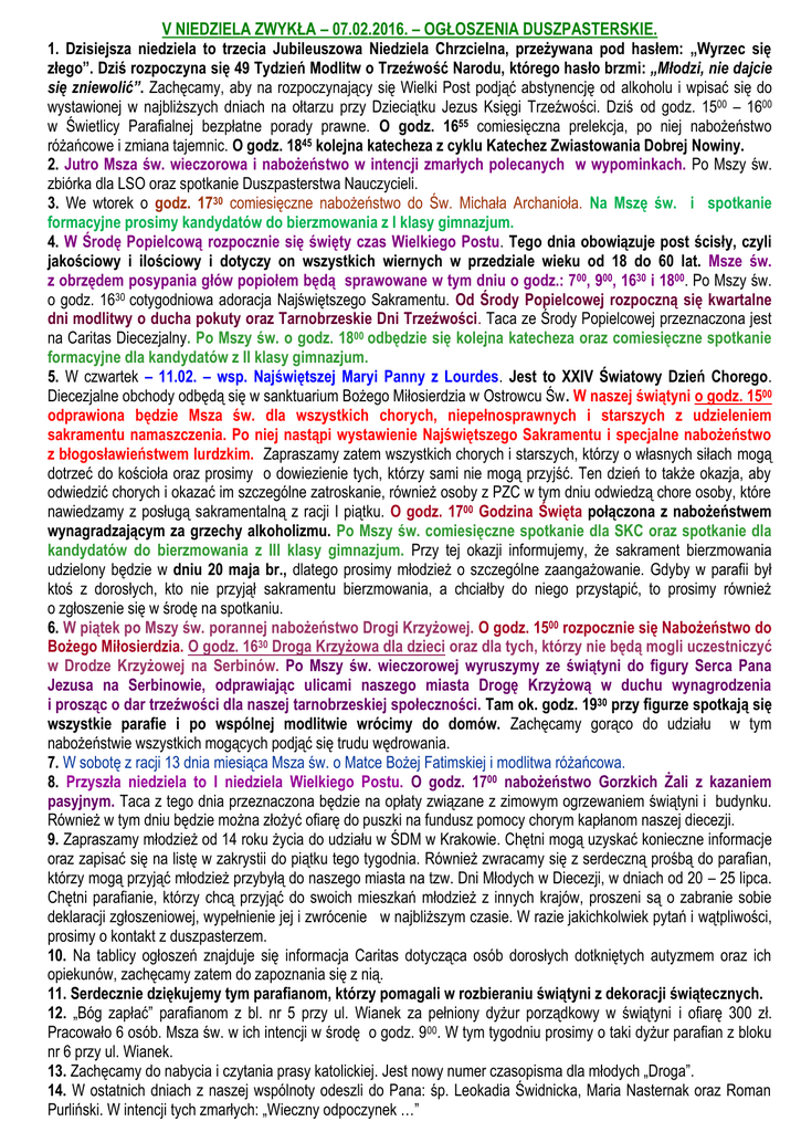v niedziela zwykła – 07.02.2016. – ogłoszenia duszpasterskie.