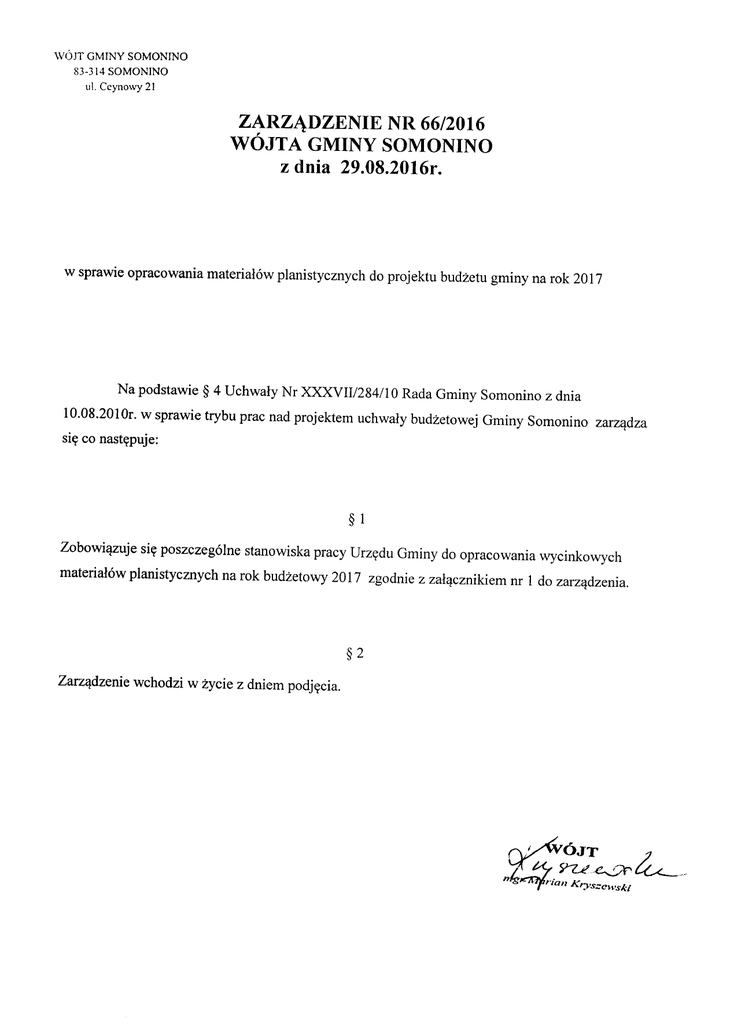 1O.08.201Or. w sprawie trybu prac nad projektem uchwały budżetowej Gminy Somonino zarządza