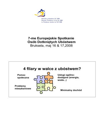 7-me Europejskie Spotkanie Osób Dotkniętych Ubóstwem Bruksela, maj 16 & 17,2008 4 filary w walce z ubóstwem? Pomoc społeczna Problemy mieszkaniowe Usługi ogólnodostępne (energia, woda...) Minimalny dochód Siódme Europejskie Spotkanie Osób dotkniętych Ubóstwem Bruksela 16 - 17 maja 2008 Wstęp Pierwsze Europejskie Spotkanie osób dotkniętych ubóstwem odbyło się z inicjatywy Belgii w 2001 roku, aby już na stałe wejść do unijnego kalendarza w roku 2003. W tym roku 16 i 17 maja osoby doświadczone biedą spotkały się w Brukselii po raz siódmy. Przyjechało tam 124 delegatów z 26 państw. Na ich zaproszenie przybyło na Spotkanie do Pałacu Egmont 90 gości z ministerstw, instytucji europejskich , organizacji pozarządowych, pracowników akademickich i przedstawicieli związków zawodowych. Słoweńska Prezydentura Europejska zaproponowała na tegoroczne Spotkanie cztery następujace tematy : usługi socjalne, mieszkalnictwo, minimum socjalne i usługi świadczone w interesie ogólnym (woda, elektryczność, gaz, transport). Te kluczowe filary walki z biedą łączą się ze sobą jak części puzlowej łamigłówki. W swoich krajach delegaci przygotowywali się na Spotkanie odpowiadając w ramach każdego z czterech tematów, na takie oto trzy proste pytania: • Co dobrze funkcjonuje? • Co funkcjonuje źle? • W jaki sposób można poprawić istniejąca sytuację? Po zakończeniu sesji plenarnej otwierającej 7-me Spotkanie delegaci podzieleni zostali na tematyczne grupy warsztatowe, w których przedstawili przygotowane wcześniej tematy do dyskusji. W czasie prac grupowych, sorządzano raporty, które zawierały rekomendacje delegatów. Skróty raportów zostały przedstawione na końcowej sesji plenarnej. Następnie dyskutowano i komentowano wnioski na zasadnicze tematy. Pełny raport ze Spotkania w Brukselii zawiera główne przesłania delegatów, rezultaty wcześniejszych spotkań oraz oficjalne wystąpienia w czasie sesji plenarnych jak również dyskusję końcową nad przedstawionymi tematami oraz przemówienia z końcowej sesji plenarnej. Treść 7-ego Spotkania: Pani Vesna LESKOSEK ze Słowenii, reprezentująca Wydział Spraw Socjalnych Uniwersytetu w Ljubljanie jako prezydent 7-ego Spotkania Osób Doświadczonych Biedą przywitała uczestników a następnie wprowadziła słuchaczy w cztery zasadnicze tematy. Usługi Socjalne wyznaczają określaną politykę rządową na szczeblu krajowym lub regionalnym. Ustawy mogą hamować lub ułatwiać dostęp do usług socjalnych i programów. Dostęp fizyczny jest w tym względzie istotny, tak jak na przykład łatwy dojazd, bliskość placówek, ich wyposażenie architektoniczne itd. Zatem ważna jest dostępność społeczna do tych placówek ze względu na określone grupy społeczne, które z nich korzystają. Innym ważnym aspektem dostępności do usług socjalnych są bariery biurokratyczne, które odzwierciedlają ograniczanie praw społecznych. Innym jeszcze czynnikiem jest to jak osoby korzystające z tych placówek są traktowane. Dlaczego uważa się ludzi biednych za problem socjalny, czy są widziani jako nieaktywni, mało inteligentni, niezdolni do kierowania własnym życiem i brania za nie odpowiedzialności? Czy też jest przeciwnie: są zachęcani do rozwijania swoich zdolności i potencjału. Czy usługi socjalne są po to aby znosić bariery umożliwiając tym samym włączenie społeczne czy traktuje się tam z szacunkiem klientów? Coraz częściej usługi socjalne są sprywatyzowane. Oznacza to, że nie mogą być dostępne dla wszystkich w taki sam sposób, zatem zysk staje się priorytetem a nie godność osoby ludzkiej . Dochód Minimalny jest zasadniczym narzędziem w walce z biedą gdyż określa normy godnego życia. Z tego powodu, pojawia się szeroka dyskusja nad tym, czym jest godne życie i jak powinno być ono gwarantowane. Prawo do udziału w zyskach wywalczyli sobie kiedyś robotnicy i dlatego właśnie zysk państwa powinien być uczciwie rozdzielany.A ludzie , którzy z różnych powodów nie mogą obecnie zagwarantować sobie godnego życia, mają prawo z tego zysku korzystać. Ta sprawa jest często błędnie rozumiana; dlatego słyszy się opinie, że ludzie uzależniając się od zasiłków tracą chęć do poszukiwania pracy. Taki punkt widzenia, może powodować ograniczanie zasiłków socjalnych czy nawet ich likwidację, aby w ten sposób wywierać presję na ludziach by szukali pracy. A doświadczenie pokazuje, że jest przeciwnie: ograniczanie zasiłków socjalnych powoduje zwiększanie się biedy a nie wzrost zatrudnienia. Rozwój ekonomiczny i kulturowy podnosi poprzeczkę określającą standardy godnego życia, do którego każdy ma prawo niezależnie od tego czy pracuje. Nikt nie jest biedny z wyboru. Zatem przyczyny biedy, leżą w strukturach jakie wyznacza polityka rządowa. Z tego powodu poszczególne kraje ponoszą odpowiedzialność za godne życie swoich obywateli. Wprowadzenie dochodu minimalnego jest dobrym narzędziem do realizacji tego celu. Jednocześnie należy podkreślić, że coraz większe grupy społeczne są wyjęte z tej formy opieki socjalnej. Takimi grupami są migranci, emigranci bez prawa pobytu, bezdomni oraz inne osoby, których sytuacja jest z jakiegoś powodu nieuregulowana. Mieszkalnictwo nie oznacza jedynie posiadanie dachu nad głową ale miejsca do zamieszkania, które gwarantuje bezpieczeństwo i stabilne życie. Mieszkanie jest przestrzenią prywatną, która powinna być gwarancją godnego życia; miejscem na odbudowanie sił, na odpoczynek, korzystanie z rozrywki ale także przestrzenią gdzie podtrzymywana jest więź społeczna i rodzinna, gdzie pielęgnowana jest tradycja dzięki przechowywanym w niej pamiątkom. Taki dom tworzy klimat bezpieczeństwa i pozwala na to, aby stale nie koncentrować się tylko na tym jak przeżyć. Trzeba mieć zatem możliwość korzystania z wody, elektryczności i ogrzewania w taki spos