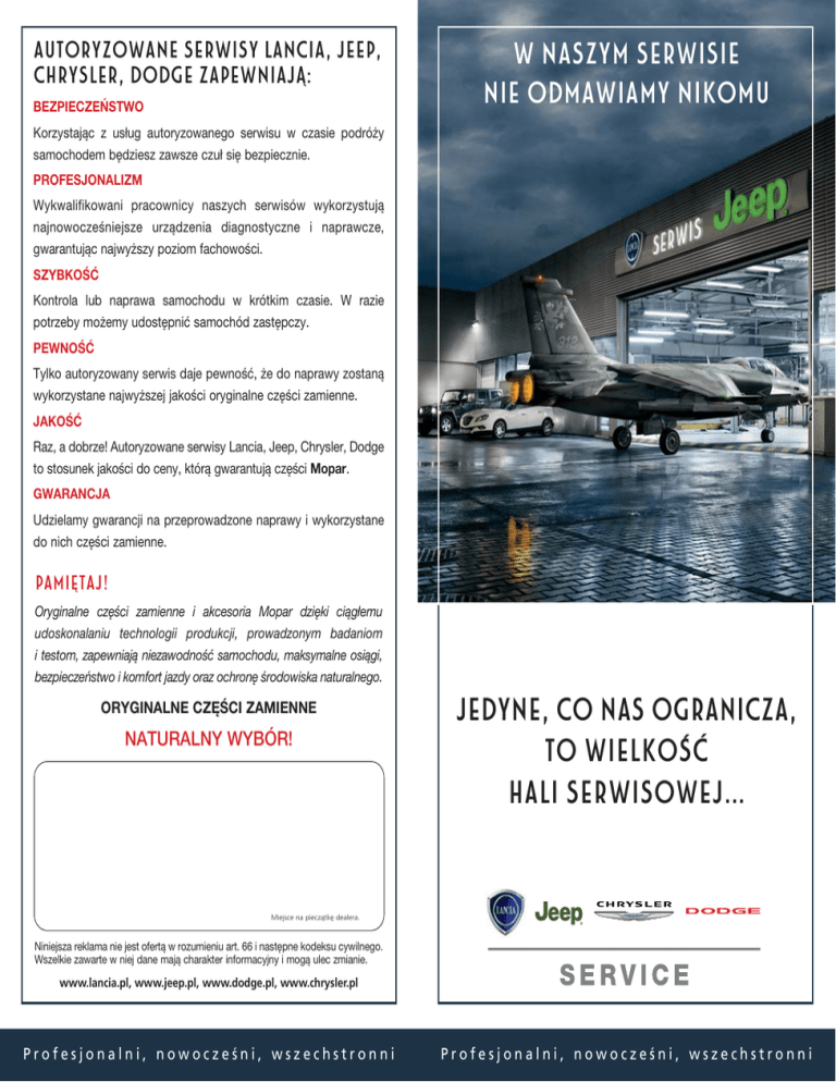 Autoryzowane Serwisy Lancia, Jeep, Chrysler, Dodge ZAPEWNIAJĄ: BEZPIECZEŃSTWO w naszym serwisie nie odmawiamy nikomu Korzystając z usług autoryzowanego serwisu w czasie podróży samochodem będziesz zawsze czuł się bezpiecznie. PROFESJONALIZM Wykwalifikowani pracownicy naszych serwisów wykorzystują najnowocześniejsze urządzenia diagnostyczne i naprawcze, gwarantując najwyższy poziom fachowości. SZYBKOŚĆ Kontrola lub naprawa samochodu w krótkim czasie. W razie potrzeby możemy udostępnić samochód zastępczy. PEWNOŚĆ Tylko autoryzowany serwis daje pewność, że do naprawy zostaną wykorzystane najwyższej jakości oryginalne części zamienne. JAKOŚĆ Raz, a dobrze! Autoryzowane serwisy Lancia, Jeep, Chrysler, Dodge to stosunek jakości do ceny, którą gwarantują części Mopar. GWARANCJA Udzielamy gwarancji na przeprowadzone naprawy i wykorzystane do nich części zamienne. Pamiętaj! Oryginalne części zamienne i akcesoria Mopar dzięki ciągłemu udoskonalaniu technologii produkcji, prowadzonym badaniom i testom, zapewniają niezawodność samochodu, maksymalne osiągi, bezpieczeństwo i komfort jazdy oraz ochronę środowiska naturalnego. ORYGINALNE CZĘŚCI ZAMIENNE NATURALNY WYBÓR! jedyne, co nas ogranicza, to wielkość hali serwisowej... Miejsce na pieczątkę dealera. Niniejsza reklama nie jest ofertą w rozumieniu art. 66 i następne kodeksu cywilnego. Wszelkie zawarte w niej dane mają charakter informacyjny i mogą ulec zmianie. www.lancia.pl, www.jeep.pl, www.dodge.pl, www.chrysler.pl Profesjonalni, nowocześni, wszechstronni Profesjonalni, nowocześni, wszechstronni