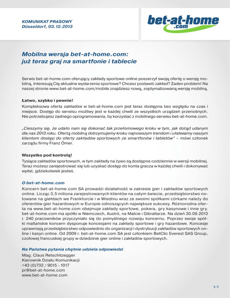 OBJAVA ZA TISK KOMUNIKAT PRASOWY 29. avgust 2012 Düsseldorf, 03.12.2013 Mobilna wersja bet-at-home.com: już teraz graj na smartfonie i tablecie Serwis bet-at-home.com oferujący zakłady sportowe online poszerzył swoją ofertę o wersję mobilną. Interesują Cię aktualne wydarzenia sportowe? Chcesz postawić zakład? Żaden problem! Na naszej stronie www.bet-at-home.com/mobile znajdziesz nową, zoptymalizowaną wersję mobilną. Łatwo, szybko i pewnie! Kompleksowa oferta zakładów w bet-at-home.com jest teraz dostępna bez względu na czas i miejsce. Dostęp do serwisu możliwy jest w każdej chwili ze wszystkich urządzeń przenośnych. Nie potrzebujesz żadnego oprogramowania, by korzystać z mobilnego serwisu bet-at-home.com. „Cieszymy się, że udało nam się dokonać tak przełomowego kroku w tym, jak dotąd udanym dla nas 2013 roku. Ofertą mobilną dotrzymujemy kroku najnowszym trendom i ułatwiamy naszym klientom dostęp do oferty zakładów sportowych ze smartfonów i tabletów” – mówi członek zarządu firmy Franz Ömer. Wszystko pod kontrolą! Tysiące zakładów sportowych, w tym zakłady na żywo są dostępne codziennie w wersji mobilnej. Teraz możesz zarejestrować się lub uzyskać dostęp do konta gracza w każdej chwili i dokonywać wpłat, gdziekolwiek jesteś. O bet-at-home.com Koncern bet-at-home.com SA prowadzi działalność w zakresie gier i zakładów sportowych online. Licząc 3,5 miliona zarejestrowanych klientów na całym świecie, przedsiębiorstwo notowane na giełdach we Frankfurcie i w Wiedniu wraz ze swoimi spółkami córkami należy do oferentów gier hazardowych w Europie odnoszących największe sukcesy. Różnorodna oferta na www.bet-at-home.com obejmuje zakłady sportowe, pokera, gry kasynowe i inne gry. bet-at-home.com ma spółki w Niemczech, Austrii, na Malcie i Gibraltarze. Na dzień 30.09.2013 r. 240 pracowników przyczyniało się do pomyślnego rozwoju koncernu. Poprzez swoje spółki maltańskie koncern dysponuje koncesjami na zakłady sportowe i gry hazardowe. Koncesje uprawniają przedsiębiorstwo odpowiednio do organizacji i dystrybucji zakładów sportowych online i kasyn online. Od 2009 r. bet-at-home.com SA jest członkiem BetClic Everest SAS Group, czołowej francuskiej grupy w dziedzinie gier online i zakładów sportowych. Na Państwa pytania chętnie udziela odpowiedzi Mag. Claus Retschitzegger Kierownik Działu Komunikacji +43 (0)732 / 9015 - 1017 [email protected] www.bet-at-home.com 1/1