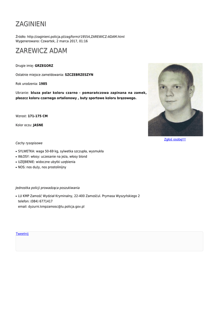 ZAGINIENI Źródło: http://zaginieni.policja.pl/zag/form/r19554,ZAREWICZ-ADAM.html Wygenerowano: Czwartek, 2 marca 2017, 01:16 ZAREWICZ ADAM Drugie imię: GRZEGORZ Ostatnie miejsce zameldowania: SZCZEBRZESZYN Rok urodzenia: 1985 Ubranie: bluza polar koloru czarno - pomarańczowa zapinana na zamek, płaszcz koloru czarnego ortalionowy , buty sportowe koloru brązowego. Wzrost: 171-175 CM Kolor oczu: JASNE Cechy rysopisowe ● SYLWETKA: waga 50-69 kg, sylwetka szczupła, wysmukła ● WŁOSY: włosy: uczesanie na jeża, włosy blond ● UZĘBIENIE: widoczne ubytki uzębienia ● NOS: nos duży, nos prostolinijny Jednostka policji prowadząca poszukiwania ● LU KMP Zamość Wydział Kryminalny, 22-400 Zamośćul. Prymasa Wyszyńskiego 2 telefon: (084) 6771417 email: [email protected] Tweetnij Zgłoś osobę!!!
