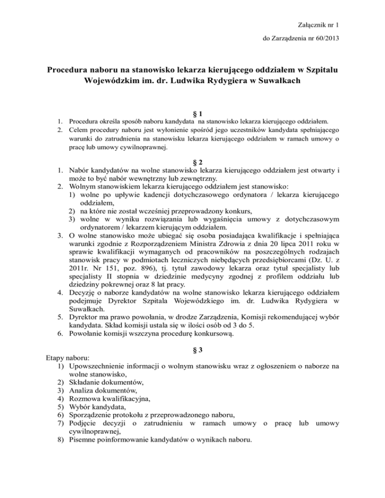 Załącznik nr 1 do Zarządzenia nr 60/2013 Procedura naboru na stanowisko lekarza kierującego oddziałem w Szpitalu Wojewódzkim im. dr. Ludwika Rydygiera w Suwałkach §1 1. Procedura określa sposób naboru kandydata na stanowisko lekarza kierującego oddziałem. 2. Celem procedury naboru jest wyłonienie spośród jego uczestników kandydata spełniającego warunki do zatrudnienia na stanowisku lekarza kierującego oddziałem w ramach umowy o pracę lub umowy cywilnoprawnej. §2 1. Nabór kandydatów na wolne stanowisko lekarza kierującego oddziałem jest otwarty i może to być nabór wewnętrzny lub zewnętrzny. 2. Wolnym stanowiskiem lekarza kierującego oddziałem jest stanowisko: 1) wolne po upływie kadencji dotychczasowego ordynatora / lekarza kierującego oddziałem, 2) na które nie został wcześniej przeprowadzony konkurs, 3) wolne w wyniku rozwiązania lub wygaśnięcia umowy z dotychczasowym ordynatorem / lekarzem kierującym oddziałem. 3. O wolne stanowisko może ubiegać się osoba posiadająca kwalifikacje i spełniająca warunki zgodnie z Rozporządzeniem Ministra Zdrowia z dnia 20 lipca 2011 roku w sprawie kwalifikacji wymaganych od pracowników na poszczególnych rodzajach stanowisk pracy w podmiotach leczniczych niebędących przedsiębiorcami (Dz. U. z 2011r. Nr 151, poz. 896), tj. tytuł zawodowy lekarza oraz tytuł specjalisty lub specjalisty II stopnia w dziedzinie medycyny zgodnej z profilem oddziału lub dziedziny pokrewnej oraz 8 lat pracy. 4. Decyzję o naborze kandydatów na wolne stanowisko lekarza kierującego oddziałem podejmuje Dyrektor Szpitala Wojewódzkiego im. dr. Ludwika Rydygiera w Suwałkach. 5. Dyrektor ma prawo powołania, w drodze Zarządzenia, Komisji rekomendującej wybór kandydata. Skład komisji ustala się w ilości osób od 3 do 5. 6. Powołanie komisji wszczyna procedurę konkursową. §3 Etapy naboru: 1) Upowszechnienie informacji o wolnym stanowisku wraz z ogłoszeniem o naborze na wolne stanowisko, 2) Składanie dokumentów, 3) Analiza dokumentów, 4) Rozmowa kwalifikacyjna, 5) Wybór kandydata, 6) Sporządzenie protokołu z przeprowadzonego naboru, 7) Podjęcie decyzji o zatrudnieniu w ramach umowy o pracę lub umowy cywilnoprawnej, 8) Pisemne poinformowanie kandydatów o wynikach naboru. 1. 2. 3. 4. 1. 2. 3. 4. 5. 6. 7. §4 Ogłoszenie o naborze na wolne stanowisko lekarza kierującego oddziałem następuje poprzez: 1) Umieszczenie na tablicy ogłoszeń w budynku szpitala, 2) Umieszczenie na stronie internetowej szpitala, 3) Przekazanie informacji do oddziałów szpitalnych. Informacja o naborze kandydatów zawiera: 1) Nazwę i adres jednostki, 2) Określenie wolnego stanowiska i nazwa komórki organizacyjnej, 3) Określenie wymagań stawianych kandydatowi w zakresie jego kwalifikacji zawodowych oraz wymogów związanych ze sprawowaniem funkcji kierowniczej, 4) Wykaz wymaganych dokumentów: a) Podanie o przyjęcie na stanowisko lekarza kierującego oddziałem, b) Dokumenty stwierdzające kwalifikacje zawodowe wymagane do zajmowanego stanowiska, dokument potwierdzający prawo wykonywania zawodu, c) Opisany przez kandydata przebieg pracy zawodowej, d) Inne dokumenty, w szczególności potwierdzające dorobek i kwalifikacje zawodowe kandydata, e) Kopie dokumentów powinny być poświadczone za zgodność z orginałem, na prośbę Komisji kandydat jest obowiązany przedstawić orginały dokumentów, f) Zaświadczenie o niekaralności, g) Dokument potwierdzający prowadzenie działalności gospodarczej oraz dokument potwierdzający wpis do rejestru podmiotów wykonujących działalność leczniczą - w przypadku zawarcia umowy cywilnoprawnej. 5) Termin i miejsce składania dokumentów. Dokumenty, o których mowa w ust. 2 pkt.4, kandydaci składają do Sekretariatu SZW w Suwałkach w kopercie, na której kandydat umieszcza swoje imię i nazwisko oraz adres i numer telefonu kontaktowego, a także adnotację o treści: „ Nabór na stanowisko lekarza kierującego oddziałem …….” ( należy podać nazwę oddziału). Kandydat ubiegający się o stanowisko lekarza kierującego oddziałem składa oświadczenie, że wyraża zgodę na przetwarzanie danych osobowych w celach przeprowadzenia naboru na dane stanowisko. §5 Po upływnie terminu składania dokumentów komisja powołana Zarządzeniem Dyrektora SZW w Suwałkach dokonuje analizy złożonych ofert pod względem spełniania prze nich wymogów formalnych określonych w ogłoszeniu oraz wymogów kwalifikacyjnych określonych w stosownych przepisach. Wynikiem analizy dokumentów jest wstępne określenie możliwości zawarcia z kandydatem umowy o pracę lub umowy cywilnoprawnej na wolne stanowisko lekarza kierującego oddziałem. Z kandydatami spełniającymi wymogi formalne i kwalifikacyjne przeprowadzana jest rozmowa kwalifikacyjna, której celem jest nawiązanie bezpośredniego kontaktu z kandydatem, zapoznanie się z jego kwalifikacjami i doświadczeniem zawodowym oraz umiejętnością pracy z zespołami ludzkimi. Członkowie komisji zobowiązani są do obiektywnej i rzetelnej oceny każdego kandydata oraz zachowania w tajemnicy informacji zawartych w dokumentach uczestników konkursu i przebiegu rozmowy kwalifikacyjnej. Komisja wybiera kandydata na stanowisko lekarza kierującego oddziałem w drodze tajnego głosowania bezwzględną większością głosów. Po zakończonych rozmowach kwalifikacyjnych sporządza się protokół, podpisany przez członków komisji, w którym to członkowie rekomendują wybranego kandydata. Dyrektor nie jest związany z rekomendacją Komisji i ostateczna decyzja należy do jego kompetencji. 8. Po przeprowadzonym naborze kandydaci otrzymują pisemną informację. 9. Dokumenty kandydata, który został zatrudniony dołącza się do jego dokumentacji osobowej. 10. Dokumenty pozostałych osób przechowuje się przez okres 6 miesięcy, a następnie w przypadku ich nie odebrania, niszczy. §6 1. Nabór na wolne stanowisko lekarza kierującego oddzia