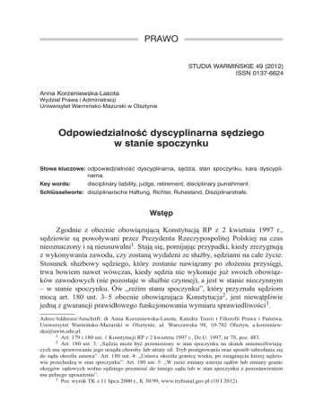 PRAWO STUDIA WARMIŃSKIE 49 (2012) ISSN 0137-6624 Anna Korzeniewska-Lasota Wydział Prawa i Administracji Uniwersytet Warmińsko-Mazurski w Olsztynie Odpowiedzialność dyscyplinarna sędziego w stanie spoczynku Słowa kluczowe: odpowiedzialność dyscyplinarna, sędzia, stan spoczynku, kara dyscyplinarna. Key words: disciplinary liability, judge, retirement, disciplinary punishment. Schlüsselworte: disziplinarische Haftung, Richter, Ruhestand, Disziplinarstrafe. Wstęp Zgodnie z obecnie obowi¹zuj¹c¹ Konstytucj¹ RP z 2 kwietnia 1997 r., sêdziowie s¹ powo³ywani przez Prezydenta Rzeczypospolitej Polskiej na czas nieoznaczony i s¹ nieusuwalni1. Staj¹ siê, pomijaj¹c przypadki, kiedy zrezygnuj¹ z wykonywania zawodu, czy zostan¹ wydaleni ze s³u¿by, sêdziami na ca³e ¿ycie. Stosunek s³u¿bowy sêdziego, który zostanie nawi¹zany po z³o¿eniu przysiêgi, trwa bowiem nawet wówczas, kiedy sêdzia nie wykonuje ju¿ swoich obowi¹zków zawodowych (nie pozostaje w s³u¿bie czynnej), a jest w stanie nieczynnym w stanie spoczynku. Ów re¿im stanu spoczynku, który przyzna³a sêdziom moc¹ art. 180 ust. 35 obecnie obowi¹zuj¹ca Konstytucja2, jest niew¹tpliwie jedn¹ z gwarancji prawid³owego funkcjonowania wymiaru sprawiedliwoci3. Adres/Addresse/Anschrift: dr Anna Korzeniewska-Lasota, Katedra Teorii i Filozofii Prawa i Pañstwa, Uniwersytet Warmiñsko-Mazurski w Olsztynie, ul. Warszawska 98, 10-702 Olsztyn, [email protected]. 1 Art. 179 i 180 ust. 1 Konstytucji RP z 2 kwietnia 1997 r., Dz.U. 1997, nr 78, poz. 483. 2 Art. 180 ust. 3: Sêdzia mo¿e byæ przeniesiony w stan spoczynku na skutek uniemo¿liwiaj¹cych mu sprawowanie jego urzêdu choroby lub utraty si³. Tryb postêpowania oraz sposób odwo³ania siê do s¹du okrela ustawa. Art. 180 ust. 4: Ustawa okrela granicê wieku, po osi¹gniêciu której sêdziowie przechodz¹ w stan spoczynku. Art. 180 ust. 5: W razie zmiany ustroju s¹dów lub zmiany granic okrêgów s¹dowych wolno sêdziego przenosiæ do innego s¹du lub w stan spoczynku z pozostawieniem mu pe³nego uposa¿enia. 3 Por. wyrok TK z 11 lipca 2000 r., K 30/99, www.trybunal.gov.pl (10 I 2012). 288 Anna Korzeniewska-Lasota Prawo Stan spoczynku sêdziego to swego rodzaju odpowiednik emerytury czy renty pozosta³ych, poza prokuratorami, grup zawodowych. Jest to instrument, który ma zabezpieczaæ sêdziom odpowiednie, godne warunki materialne, po zakoñczeniu s³u¿by czynnej, przy jednoczesnym obwarowaniu rygorem odpowiedzialnoci dyscyplinarnej. Sêdzia w stanie spoczynku, mimo ¿e nie wykonuje ju¿ obowi¹zków zawodowych (nie orzeka), to nadal pozostaje w stosunku s³u¿bowym, z którego wynikaj¹ dla niego okrelone przywileje, jak i zobowi¹zania, a ich naruszenie mo¿e skutkowaæ swoistego rodzaju odpowiedzialnoci¹ represyjn¹, jak¹ jest odpowiedzialnoæ dyscyplinarna4. I to w³anie przes³anki wszczêcia takiego postêpowania, jego bieg, jak te¿ konsekwencje poszczególnych mo¿liwych orzeczeñ w stosunku do sêdziów w stanie spoczynku, bêd¹ przedmiotem poni¿szych rozwa¿añ. Przejście w stan spoczynku Podstawy prawne przejcia sêdziów s¹dów powszechnych w stan spoczynku okrela Konstytucja RP z 2 kwietnia 1997 r. i ustawa z 27 lipca 2001 r. Prawo o ustroju s¹dów powszechnych5. Akty te okrelaj¹ zarówno obligatoryjne, jak i fakultatywne przes³anki przejcia w stan spoczynku. I tak sêdzia s¹du powszechnego w stan spoczynku mo¿e przejæ lub zostaæ przeniesiony. Sêdzia przechodzi w stan spoczynku zasadniczo z dniem ukoñczenia 65. roku ¿ycia, chyba ¿e w ustawowym terminie (nie póniej ni¿ na szeæ miesiêcy przed ukoñczeniem 65. roku ¿ycia) z³o¿y ministrowi sprawiedliwoci owiadczenie o woli dalszego zajmowania stanowiska i przedstawi zawiadczenie stwierdzaj¹ce jego zdolnoæ, ze wzglêdu na stan zdrowia, do dalszego pe³nienia obowi¹zków sêdziego. Swoje stanowisko sêdzia mo¿e jednak¿e zajmowaæ nie d³u¿ej ni¿ do ukoñczenia 70. roku ¿ycia. Ustawodawca umo¿liwia przejcie w stan spoczynku równie¿ wczeniej. Kobieta, która przepracowa³a na stanowisku sêdziego lub prokuratora nie mniej ni¿ 25 lat, mo¿e bowiem przejæ w stan spoczynku po ukoñczeniu 55 lat, a mê¿czyzna, który przepracowa³ na stanowisku sêdziego lub prokuratora nie mniej ni¿ 30 lat, po ukoñczeniu lat 606. 4 O wzajemnej relacji miêdzy odpowiedzialnoci¹ dyscyplinarn¹ a karn¹ zob. A. Bojañczyk, Z problematyki relacji miêdzy odpowiedzialnoci¹ dyscyplinarn¹ i karn¹ (na przyk³adzie odpowiedzialnoci dyscyplinarnej zawodów prawniczych), Pañstwo i Prawo 9 (2004), s. 17-32. 5 Dz.U. 2001, nr 98, poz. 1070. 6 Art. 69 ustawy z 27 lipca 2001 r. Prawo o ustroju s¹dów powszechnych (dalej: u.s.p.) Dz.U. 2001, nr 98, poz. 1070. Odpowiedzialność dyscyplinarna sędziego w stanie spoczynku 289 Studia Warmińskie 49 (2012) Sêdziego obligatoryjnie przenosi siê w stan spoczynku7, je¿eli z powodu choroby lub utraty si³, uznany zosta³ przez lekarza orzecznika Zak³adu Ubezpieczeñ Spo³ecznych za trwale niezdolnego do pe³nienia obowi¹zków sêdziego8, fakultatywnie na wniosek kolegium w³aciwego s¹du, je¿eli na skutek uniemo¿liwiaj¹cych sêdziemu sprawowanie jego urzêdu choroby lub utraty si³, nie pe³ni³ s³u¿by przez okres roku albo w razie zmiany ustroju s¹dów lub zmiany granic okrêgów s¹dowych9. Z wyj¹tkiem ostatniej sytuacji (sêdzia ma bowiem prawo powróciæ na poprzednio zajmowane albo otrzymaæ stanowisko równorzêdne poprzednio zajmowanemu, je¿eli usta³y przyczyny bêd¹ce podstaw¹ jego przeniesienia), stan spoczynku sêdziego trwa zasadniczo a¿ do mierci. W tym czasie sêdzia w stanie spoczynku, jak ju¿ wy¿ej wspomniano, nadal pozostaje w stosunku s³u¿bowym. Zmianie ulega jednak¿e treæ tego stosunku. Sêdzia nie posiada ju¿ w³adzy jurysdykcyjnej oraz wynikaj¹cych z niej praw i obowi¹zków. Przesłanki odpowiedzialności dyscyplinarnej Sêdzia w stanie spoczynku, w myl ustawy Prawo o ustroju s¹dów powszechnych, pod