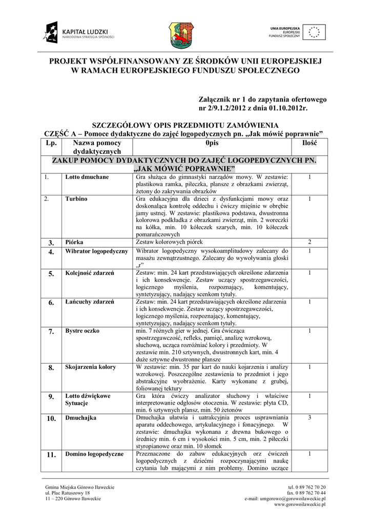 PROJEKT WSPÓŁFINANSOWANY ZE ŚRODKÓW UNII EUROPEJSKIEJ W RAMACH EUROPEJSKIEGO FUNDUSZU SPOŁECZNEGO Załącznik nr 1 do zapytania ofertowego nr 2/9.1.2/2012 z dnia 01.10.2012r. SZCZEGÓŁOWY OPIS PRZEDMIOTU ZAMÓWIENIA CZĘŚĆ A – Pomoce dydaktyczne do zajęć logopedycznych pn. „Jak mówić poprawnie” Lp. Nazwa pomocy 0pis Ilość dydaktycznych ZAKUP POMOCY DYDAKTYCZNYCH DO ZAJĘĆ LOGOPEDYCZNYCH PN. „JAK MÓWIĆ POPRAWNIE” 1. Lotto dmuchane 2. Turbino 3. 4. Piórka Wibrator logopedyczny 5. Kolejność zdarzeń 6. Łańcuchy zdarzeń 7. Bystre oczko 8. Skojarzenia kolory 9. Lotto dźwiękowe Sytuacje 10. Dmuchajka 11. Domino logopedyczne Gmina Miejska Górowo Iławeckie ul. Plac Ratuszowy 18 11 – 220 Górowo Iławeckie Gra służąca do gimnastyki narządów mowy. W zestawie: plastikowa ramka, piłeczka, plansze z obrazkami zwierząt, żetony do zakrywania obrazków Gra edukacyjna dla dzieci z dysfunkcjami mowy oraz doskonaląca kontrolę oddechu i ćwiczy mięśnie w obrębie jamy ustnej. W zestawie: plastikowa podstawa, dwustronna kolorowa podkładka z obrazkami zwierząt, min. 2 woreczki na kółka, min. 10 kółeczek szarych, min. 10 kółeczek pomarańczowych Zestaw kolorowych piórek Wibrator logopedyczny wysokoamplitudowy zalecany do masażu zewnątrzustnego. Zalecany do wywoływania głoski „r” Zestaw: min. 24 kart przedstawiających określone zdarzenia i ich konsekwencje. Zestaw uczący spostrzegawczości, logicznego myślenia, rozpoznający, komentujący, syntetyzujący, nadający scenkom tytuły. Zestaw: min. 24 kart przedstawiających określone zdarzenia i ich konsekwencje. Zestaw uczący spostrzegawczości, logicznego myślenia, rozpoznający, komentujący, syntetyzujący, nadający scenkom tytuły. min. 7 różnych gier w jednej. Gra ćwicząca spostrzegawczość, refleks, pamięć, analizę wzrokową, słuchową, ucząca rozróżniać kolory i przedmioty. W zestawie min. 210 sztywnych, dwustronnych kart, min. 4 duże sztywne dwustronne plansze W zestawie: min. 35 par kart do nauki kojarzenia i analizy wzrokowej. Poszczególne zestawienia to przedmiot i jego abstrakcyjne wyobrażenie. Karty wykonane z grubej, foliowanej tektury Gra która ćwiczy analizator słuchowy i właściwe interpretowanie odgłosów otoczenia. W zestawie: płyta CD, min. 6 sztywnych plansz, min. 50 żetonów Dmuchajka ułatwia i uatrakcyjnia proces usprawniania aparatu oddechowego, artykulacyjnego i fonacyjnego. W zestawie: dmuchajka wykonana z drewna bukowego o średnicy min. 6 cm i wysokości min. 5 cm, min. 2 piłeczki styropianowe oraz min. 10 słomek Przeznaczone do zabaw edukacyjnych orz ćwiczeń logopedycznych z dziećmi rozpoczynającymi naukę czytania lub mającymi z nim problemy. Domino uczące 1 1 2 1 1 1 1 1 1 3 1 tel. 0 89 762 70 20 fax. 0 89 762 70 44 e-mail: [email protected] www.gorowoilaweckie.pl 12. Domino logopedyczne 13. Domino logopedyczne 14. Domino logopedyczne 15. Zestaw kontrolny PUS 16. Chrząszcz z Żarzyna 17. Chyża Żmija Syk - Syk 18. Kruk z Kruklanki 19. Miała Baba Koguta 20. Syczki – zabawy z głoskami s, z, c, dz 22. Ciszki – zabawy z głoskami ś, ź, ć, dź 23. Kapki i Wafki – zabawy z głoskami k, g, f, w 24. Rerki – zabawy z głoskami r, l 25. Miks ciszków, syczków, szumków 26. Zeszyt ćwiczeń logopedycznych Zeszyt ćwiczeń logopedycznych 27. 28. Pustefix – bańki mydlane rozróżniania głosek oraz ich prawidłowej wymowy. W zestawie: min. 27 par obrazków ilustrujących przedmioty, zwierzęta i osoby których nazwy rozpoczynają się głoskami opozycyjnymi L - J Przeznaczone do zabaw edukacyjnych orz ćwiczeń logopedycznych z dziećmi rozpoczynającymi naukę czytania lub mającymi z nim problemy. Domino uczące rozróżniania głosek oraz ich prawidłowej wymowy. W zestawie: min. 27 par obrazków ilustrujących przedmioty, zwierzęta i osoby których nazwy rozpoczynają się głoskami opozycyjnymi L - R Przeznaczone do zabaw edukacyjnych orz ćwiczeń logopedycznych z dziećmi rozpoczynającymi naukę czytania lub mającymi z nim problemy. Domino uczące rozróżniania głosek oraz ich prawidłowej wymowy. W zestawie: min. 27 par obrazków ilustrujących przedmioty, zwierzęta i osoby których nazwy rozpoczynają się głoskami opozycyjnymi Ż(RZ) - Z Przeznaczone do zabaw edukacyjnych orz ćwiczeń logopedycznych z dziećmi rozpoczynającymi naukę czytania lub mającymi z nim problemy. Domino uczące rozróżniania głosek oraz ich prawidłowej wymowy. W zestawie: min. 27 par obrazków ilustrujących przedmioty, zwierzęta i osoby których nazwy rozpoczynają się głoskami opozycyjnymi J - R Poręczne zamykane pudełeczko, w którym znajduje się min. 12 ponumerowanych klocków. Książeczka zawierająca materiał ćwiczeniowy doskonalenia słuchu fonemowego oraz czytania i pisania. Książeczka zawierająca materiał ćwiczeniowy doskonalenia słuchu fonemowego oraz czytania i pisania. Książeczka zawierająca materiał ćwiczeniowy doskonalenia słuchu fonemowego oraz czytania i pisania. Książeczka zawierająca materiał ćwiczeniowy doskonalenia słuchu fonemowego oraz czytania i pisania. Opracowanie przeznaczone dla dzieci które mają wadę wymowy: seplenienie, zawierające: rysunki, wycinanki, zaznaczanie ilości powtórzeń. Książeczka formatu A 4, min. 40 stron. Opracowanie przeznaczone dla dzieci które mają wadę wymowy: seplenienie, zawierające: rysunki, wycinanki, zaznaczanie ilości powtórzeń. Książeczka formatu A 4, min. 40 stron. Opracowanie przeznaczone dla dzieci które mają wadę wymowy: seplenienie, zawierające: rysunki, wycinanki, zaznaczanie ilości powtórzeń. Książeczka formatu A 4, min. 40 stron. Opracowanie przeznaczone dla dzieci które mają wadę wymowy: seplenienie, zawierające: rysunki, wycinanki, zaznaczanie ilości powtórzeń. Książeczka formatu A 4, min. 40 stron. Opracowanie przeznaczone dla dzieci które mają wadę wymowy: seplenienie, zawierające: rysunki, w
