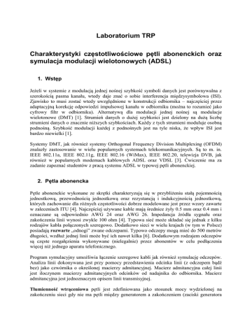 Laboratorium TRP Charakterystyki częstotliwościowe pętli abonenckich oraz symulacja modulacji wielotonowych (ADSL) 1. Wstęp Jeżeli w systemie z modulacją jednej nośnej szybkość symboli danych jest porównywalna z szerokością pasma kanału, wtedy daje znać o sobie interferencja międzysymbolowa (ISI). Zjawisko to musi zostać wtedy uwzględnione w konstrukcji odbiornika – najczęściej przez adaptacyjną korekcję odpowiedzi impulsowej kanału w odbiorniku (można to rozumieć jako cyfrowy filtr w odbiorniku). Alternatywą dla modulacji jednej nośnej są modulacje wielotonowe (DMT) [1]. Strumień danych o dużej szybkości jest dzielony na dużą liczbę strumieni danych o znacznie niższych szybkościach. Każdy z tych strumieni moduluje osobną podnośną. Szybkość modulacji każdej z podnośnych jest na tyle niska, że wpływ ISI jest bardzo niewielki [1]. Systemy DMT, jak również systemy Orthogonal Frequency Division Multiplexing (OFDM) znalazły zastosowanie w wielu popularnych systemach telekomunikacyjnych. Są to m. in. IEEE 802.11a, IEEE 802.11g, IEEE 802.16 (WiMax), IEEE 802.20, telewizja DVB, jak również w popularnych modemach kablowych ADSL oraz VDSL [3]. Ćwiczenie ma za zadanie zapoznać studentów z pracą systemu ADSL w typowej pętli abonenckiej. 2. Pętla abonencka Pętle abonenckie wykonane ze skrętki charakteryzują się w przybliżeniu stałą pojemnością jednostkową, przewodnością jednostkową oraz rezystancją i indukcyjnością jednostkową, których zachowanie dla różnych częstotliwości dobrze modelowane jest przez wzory zawarte w zaleceniach ITU [4]. Najczęściej używane kable mają średnice żyły 0.5 mm oraz 0.4 mm i oznaczane są odpowiednio AWG 24 oraz AWG 26. Impedancja źródła sygnału oraz zakończenia linii wynosi zwykle 100 ohm [4]. Typowa sieć może składać się jednak z kilku rodzajów kabla połączonych szeregowo. Dodatkowo sieci w wielu krajach (w tym w Polsce) posiadają rozwarte „odnogi” zwane odczepami. Typowo odczepy mogą mieć do 500 metrów długości, wzdłuż jednej linii może być ich nawet kilka [6]. Dodatkowym rodzajem odczepów są częste rozgałęzienia wykonywane (nielegalnie) przez abonentów w celu podłączenia więcej niż jednego aparatu telefonicznego. Program symulacyjny umożliwia łączenie szeregowe kabli jak również symulację odczepów. Analiza linii dokonywana jest przy pomocy przedstawienia odcinka linii (z odczepem bądź bez) jako czwórnika o określonej macierzy admitancyjnej. Macierz admitancyjna całej linii jest iloczynem macierzy admitancyjnych odcinków od nadajnika do odbiornika. Macierz admitancyjna jest jednoznaczym opisem linii transmisyjnej. Tłumienność wtrąceniowa pętli jest zdefiniowana jako stosunek mocy wydzielonej na zakończeniu sieci gdy nie ma pętli między generatorem a zakończeniem (zaciski generatora są dołączone do zacisków opornika obciążającego) do mocy wydzielonej na zakończeniu sieci gdy między zaciskami generatora i zaciskami odbiornika jest pętla abonencka. Najczęściej podaje się ją w dB. Prędkość fazowa fali w pętli jest zdefiniowana jako 2f , vf gdzie f to częstotliwość a jest stałą fazową (urojoną częścią stałej propagacji gamma). Prędkość fazowa jest funkcją częstotliwości. Znając prędkość fazową można określić długość fali w pętli przy pomocy wzoru vf . f Jest to długość fali, która odpowiada danej częstotliwości f. Wpływ odczepów na tłumienność linii. Posługując się wzorami na impedancję wejściową linii można pokazać, że impedancja odczepu wyraża się wzorem: Z we jZ c ctg ( l ) , gdzie Z c oznacza impedancję charakterystyczną linii a l jest długością. Impedancja ta przy argumencie ctg równym , 3 ,5 itd. dąży do zera. Powoduje to znaczne osłabienie fali 2 2 2 pożądanej, która przenosi informację do odbiornika. Na charakterystyce tłumienności wtrąceniowej linii od częstotliwości widoczne jest to jako charakterystyczny skok tłumienności. 3. Modulacja OFDM (DMT) W modemach ADSL wykorzystuje się modulację DMT (ang. discrete multitone), która jest dolnopasmową wersją modulacji OFDM (ang. orthogonal frequency division multiplexing). Modulacja OFDM polega na tym, że zamiast modulować jedną nośną sygnałem o dużej prędkości modulacji R, moduluje się N nośnych sygnałami o szybkości modulacji R/N. Modulowanie z niższą szybkością prowadzi do tego, że sygnał jest bardziej odporny na interferencje miedzysymbolową (ISI – ang. inter-symbol interference). Dodatkową cechą modulacji OFDM, która wyróżnia ją od zwykłego FDM jest fakt, że odstęp częstotliwościowy pomiędzy nośnymi OFDM jest równy 1/Tb, gdzie Tb jest czasem trwania jednego symbolu OFDM. Widma nośnych OFDM po zmodulowaniu mają charakter funkcji sin(x)/x i nachodzą na siebie, jednak w taki sposób, że w miejscu maksimum widma jednej nośnej, gęstość widmowa pozostałych nośnych jest zerowa i sygnały z różnych nośnych nie zakłócają się nawzajem. Przypomina to nieco transmisję w paśmie podstawowym z impulsami kształtowanymi filtrem typu podniesiony cosinus. Nośne OFDM mogą być modulowane niezależnie, przy pomocy modulacji amplitudy i kąta czyli np. PSK, QAM. Modulacja OFDM ma niejako wbudowane w siebie następujące zalety: Łatwość przetwarzania sygnału – wszystko odbywa się cyfrowo (przetwarzanie typu software) Wykorzystanie modulacji wielowartościowych nie jest problemem – polega jedynie na zwiększeniu alfabetu symboli na każdej podnośnej Zwartość pasma – kształt pasma sygnału OFDM jest niemal prostokątny, stąd łatwo go multipleksować częstotliwościowo z innymi sygnałami bez użycia filtrów Łatwy podział pasma na downlink i uplink Łatwość monitoringu dzięki przeznaczeniu wybranych podnośnych na tzw. piloty lub do przesyłania sekwencji treningowych Optymalny dobór mocy poszczególnych podnośnych i wartoś