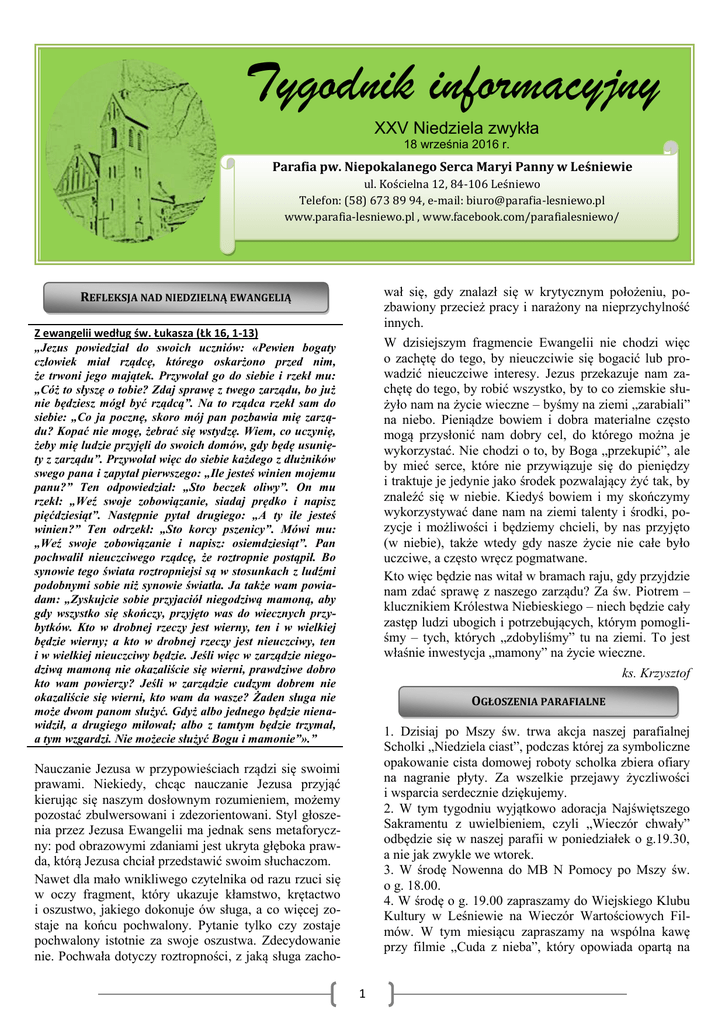 Tygodnik informacyjny XXV Niedziela zwykła 18 września 2016 r. Parafia pw. Niepokalanego Serca Maryi Panny w Leśniewie ul. Kościelna 12, 84-106 Leśniewo Telefon: (58) 673 89 94, e-mail: [email protected] www.parafia-lesniewo.pl , www.facebook.com/parafialesniewo/ wał się, gdy znalazł się w krytycznym położeniu, pozbawiony przecież pracy i narażony na nieprzychylność innych. REFLEKSJA NAD NIEDZIELNĄ EWANGELIĄ Z ewangelii według św. Łukasza (Łk 16, 1-13) „Jezus powiedział do swoich uczniów: «Pewien bogaty człowiek miał rządcę, którego oskarżono przed nim, że trwoni jego majątek. Przywołał go do siebie i rzekł mu: „Cóż to słyszę o tobie? Zdaj sprawę z twego zarządu, bo już nie będziesz mógł być rządcą”. Na to rządca rzekł sam do siebie: „Co ja pocznę, skoro mój pan pozbawia mię zarządu? Kopać nie mogę, żebrać się wstydzę. Wiem, co uczynię, żeby mię ludzie przyjęli do swoich domów, gdy będę usunięty z zarządu”. Przywołał więc do siebie każdego z dłużników swego pana i zapytał pierwszego: „Ile jesteś winien mojemu panu?” Ten odpowiedział: „Sto beczek oliwy”. On mu rzekł: „Weź swoje zobowiązanie, siadaj prędko i napisz pięćdziesiąt”. Następnie pytał drugiego: „A ty ile jesteś winien?” Ten odrzekł: „Sto korcy pszenicy”. Mówi mu: „Weź swoje zobowiązanie i napisz: osiemdziesiąt”. Pan pochwalił nieuczciwego rządcę, że roztropnie postąpił. Bo synowie tego świata roztropniejsi są w stosunkach z ludźmi podobnymi sobie niż synowie światła. Ja także wam powiadam: „Zyskujcie sobie przyjaciół niegodziwą mamoną, aby gdy wszystko się skończy, przyjęto was do wiecznych przybytków. Kto w drobnej rzeczy jest wierny, ten i w wielkiej będzie wierny; a kto w drobnej rzeczy jest nieuczciwy, ten i w wielkiej nieuczciwy będzie. Jeśli więc w zarządzie niegodziwą mamoną nie okazaliście się wierni, prawdziwe dobro kto wam powierzy? Jeśli w zarządzie cudzym dobrem nie okazaliście się wierni, kto wam da wasze? Żaden sługa nie może dwom panom służyć. Gdyż albo jednego będzie nienawidził, a drugiego miłował; albo z tamtym będzie trzymał, a tym wzgardzi. Nie możecie służyć Bogu i mamonie”».” W dzisiejszym fragmencie Ewangelii nie chodzi więc o zachętę do tego, by nieuczciwie się bogacić lub prowadzić nieuczciwe interesy. Jezus przekazuje nam zachętę do tego, by robić wszystko, by to co ziemskie służyło nam na życie wieczne – byśmy na ziemi „zarabiali” na niebo. Pieniądze bowiem i dobra materialne często mogą przysłonić nam dobry cel, do którego można je wykorzystać. Nie chodzi o to, by Boga „przekupić”, ale by mieć serce, które nie przywiązuje się do pieniędzy i traktuje je jedynie jako środek pozwalający żyć tak, by znaleźć się w niebie. Kiedyś bowiem i my skończymy wykorzystywać dane nam na ziemi talenty i środki, pozycje i możliwości i będziemy chcieli, by nas przyjęto (w niebie), także wtedy gdy nasze życie nie całe było uczciwe, a często wręcz pogmatwane. Kto więc będzie nas witał w bramach raju, gdy przyjdzie nam zdać sprawę z naszego zarządu? Za św. Piotrem – klucznikiem Królestwa Niebieskiego – niech będzie cały zastęp ludzi ubogich i potrzebujących, którym pomogliśmy – tych, których „zdobyliśmy” tu na ziemi. To jest właśnie inwestycja „mamony” na życie wieczne. ks. Krzysztof OGŁOSZENIA PARAFIALNE 1. Dzisiaj po Mszy św. trwa akcja naszej parafialnej Scholki „Niedziela ciast”, podczas której za symboliczne opakowanie cista domowej roboty scholka zbiera ofiary na nagranie płyty. Za wszelkie przejawy życzliwości i wsparcia serdecznie dziękujemy. 2. W tym tygodniu wyjątkowo adoracja Najświętszego Sakramentu z uwielbieniem, czyli „Wieczór chwały” odbędzie się w naszej parafii w poniedziałek o g.19.30, a nie jak zwykle we wtorek. 3. W środę Nowenna do MB N Pomocy po Mszy św. o g. 18.00. 4. W środę o g. 19.00 zapraszamy do Wiejskiego Klubu Kultury w Leśniewie na Wieczór Wartościowych Filmów. W tym miesiącu zapraszamy na wspólna kawę przy filmie „Cuda z nieba”, który opowiada opartą na Nauczanie Jezusa w przypowieściach rządzi się swoimi prawami. Niekiedy, chcąc nauczanie Jezusa przyjąć kierując się naszym dosłownym rozumieniem, możemy pozostać zbulwersowani i zdezorientowani. Styl głoszenia przez Jezusa Ewangelii ma jednak sens metaforyczny: pod obrazowymi zdaniami jest ukryta głęboka prawda, którą Jezusa chciał przedstawić swoim słuchaczom. Nawet dla mało wnikliwego czytelnika od razu rzuci się w oczy fragment, który ukazuje kłamstwo, krętactwo i oszustwo, jakiego dokonuje ów sługa, a co więcej zostaje na końcu pochwalony. Pytanie tylko czy zostaje pochwalony istotnie za swoje oszustwa. Zdecydowanie nie. Pochwała dotyczy roztropności, z jaką sługa zacho1 Zobowiązania formacyjne takie jak codzienna modlitwa, regularne spotkania ze słowem Bożym, modlitwa małżeńska czy dialog małżeński, uczą małżonków spełniania w swojej rodzinie funkcji kapłańskiej, nauczycielskiej i królewskiej, o których mówią dokumenty Kościoła . Należy tutaj zaznaczyć, że im wcześniej (chodzi o staż małżeński i wiek dzieci) małżonkowie wejdą na drogę formacji Domowego Kościoła, tym łatwiej im spełniać posługę na rzecz swojej rodziny. Małe dzieci wychowywane w klimacie świadomej wspólnoty chrześcijańskiej w sposób naturalny wzrastają we wierze, ucząc się Boga przez wspólną modlitwę rodzinną, potem lekturę Słowa Bożego, swoiste kręgi biblijne w rodzinie, modlitwę Liturgią Godzin. Możliwość zadawania pytań związanych z wiarą, na równi z pytaniami z innych dziedzin życia, poczucie akceptacji i miłości, świadomość miłości Pana Boga – są ogromnym zapleczem siły i równowagi dla dziecka, gdy zaczyna wchodzić w czas dorastania i odkrywan