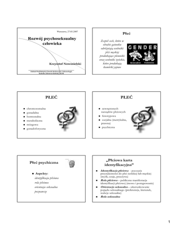 Warszawa, 27.03.2007 Płeć Rozwój psychoseksualny człowieka Zespół cech, które w obrębie gatunku odróŜniają osobniki płci męskiej produkujące plemniki oraz osobniki Ŝeńskie, które produkują komórki jajowe Krzysztof Nowosielski Zakład Profilaktyki Chorób Kobiecych i Seksuologii, Katedra Zdrowia Kobiety, SUM PŁEĆ PŁEĆ chromosomalna gonadalna hormonalna metaboliczna mózgowa gonadoforyczna „Płciowa karta identyfikacyjna” Płeć psychiczna Aspekty: identyfikacja płciowa rola płciowa orientacja seksualna poznawcze zewnętrznych narządów płciowych fenotypowa socjalna (metrykalna, prawna) psychiczna Identyfikacja płciowa - poczucie przynaleŜności do płci Ŝeńskiej lub męskiej (myśli, czuje, przeŜywa) Rola płciowa – publiczna manifestacja identyfikacji płciowej (mowa i postępowanie) Orientacja seksualna – ukierunkowanie popędu seksualnego (preferencje, kierunek, reakcje seksualne) Rola seksualna 1 Identyfikacja płciowa Rola płciowa całkowita częściowa świadoma nieświadoma wewnętrzna zewnętrzna trwała nietrwała Wszystkie te rzeczy, które dama osoba mówi lub robi, aby pokazać, Ŝe ma status chłopca lub dziewczyny, męŜczyzny lub kobiety. Określenie to obejmuje erotyzm, ale nie ogranicza się do niego. Interseksualizm a hermafrodytyzm Rola płciowa a seksualna Gender-identity/role Seksualność Seksualność – cechą seksualności kaŜdego człowieka jest tendencja do preferowania określonych partnerów oraz określonych forma aktywności seksualnej. Wzorce preferencji są odrębne dla kaŜdego osobnika. KaŜdy człowiek wykazuje róŜny stopień ambiseksualności. Identyfikacja i rola płciowa tworzą jedną całość - identyfikacja/rola płciowa (I/R-P) Identyfikacja ≠ deklaracja jestem kobietą/męŜczyzną Męskość/kobiecość Z historii… Zaburzenia identyfikacji płciowej Sigmund Freud – 1905- teoria seksualizmu dziecięcego Alicja Miller – 1983 – modyfikacja teorii Freuda M. Mead – 1955 – dzieciństwo w kulturach świata W. Levis – reakcje seksualne w 1. rŜ. Nie ma ostrych granic pomiędzy zaburzeniami identyfikacji płciowej, roli płciowej i orientacji płciowej. Jedne zaburzenia mogą wykazywać cechy innych zaburzeń. 2 Z historii… H. Bakwin – 1973 – erotyczne uczucia w dzieciństwie L. Constantin – 1981 – monografia o seksualności dzieci (pierwsza w historii) B. Calderone -1983- reaktywność w wieku płodowym (masturbacja płodu) Psychoanaliza Freuda - definicje id (ono) – prymitywne popędy nieświadome ego (ja) – „ja” realne – osobowość kontrolująca id, świadome ja, równowaga zaspokajania/hamowania popędów superego (sumienie) – „ja” idealne Psychoanaliza Freuda - definicje WYMIARY LIBIDO Psychoanaliza Freuda - definicje id (ono) – prymitywne popędy nieświadome ego (ja) – „ja” realne – osobowość kontrolująca id, świadome ja, równowaga zaspokajania/hamowania popędów superego (sumienie) – „ja” idealne Psychoanaliza Freuda - definicje LIBIDO Popęd seksualny będący głównym źródłem energii seksualnej człowieka Psychoanaliza Freuda – rozwój libido Fazy rozwoju: pregenitalna – do 1. rŜ biologiczny (przyjemności związane z oralna – 1. rŜ pobudzaniem okolic ciała) psychiczny społeczny analna – 2-3. rŜ genitalna (falliczna) – 4. i 5. rŜ Nastawienie na własne ciało 3 Psychoanaliza Freuda – rozwój libido Fazy rozwoju: kompleks Edypa kompleks Elektry i kastracyjny Nastawienie na najbliŜsze otoczenie Psychoanaliza Freuda – kompleks kastracyjny PrzezwycięŜenie kompleksu: - Psychoanaliza Freuda – rozwój libido Fazy rozwoju: godzi się ma nadzieję, Ŝe będzie go jeszcze miała zwrot ku ojcu by jej to odtworzył brak penisa – kara za masturbacje tłumi pragnienia seksualne, traci nadzieję, odrzuca miłość matki pragnie by mieć dziecko z ojcem masturbacja i zachowania typowo męskie Psychoanaliza Freuda – rozwój libido Fazy rozwoju: stłumienie i wyparcie kompleksów do latencja nieśwadomości formowanie się sumienia pociąg seksualny do płci odmiennej jako zagroŜenie (negatywne uczucia) identyfikacja z rodzicem tej samej płci dojrzewanie Psychoanaliza Freuda – rozwój libido Psychoanaliza Freuda – zaburzenia Wniosek: FIKSACJA Zaburzenia kształtowania się libido – zaburzenia seksualności u dorosłych „Atawizmy” – pozostałości etapów rozwojowych u dorosłych REGRESJA Wniosek: Okolica genitalna jest dominująca Przewaga okolicy genitalnej w zakresie seksualności 4 Psychoanaliza Freuda – potrzeba miłości 1. Przejście od miłości biernej do aktywnej dorosły jako narzędzie do zaspokajania potrzeb przejście od instrumentalnego traktowania do podmiotowego (rodzic traktowany jako podmiot prawie równy sobie) Psychoanaliza Freuda – potrzeba miłości 2. Przejście od idealizacji obiektu miłości do spostrzegania go w realnym świetle rodzic wszechmogący postrzeganie wszystkiego w 2. barwach – czerń/biel (nieuwzględnianie złoŜoności natury człowieka) przejście do widzenia rodziców w realnym świetle Psychoanaliza Freuda – potrzeba miłości 3. Przejście od miłości ambiwalentnej do obiektu uczuć do harmonijnej Psychoanaliza Freuda – potrzeba miłości 4. Zmiana obiekty uczuć partner jako indywidualna jednostka, a nie substytut rodzica patologia: przypisywanie partnerowi roli rodzica świadome lub podświadome (np. karmienie miłość i nienawiść naprzemiennie powstaje ambiwalencja wyrównana (dostrzeganie dobrych i złych stron) Psychoanaliza Freuda – potrzeba miłości 5. Przejście od introjekcji i identyfikacji do traktowania osoby – obiektu uczuć – jako odrębnego i odmiennego człowieka introjekcja – włączanie innej osoby do własnego „ja” utoŜsamianie się dziecka z matką poczucie bycia rodzicem podobna reakcja w Ŝyciu dorosłym ale cel inny!!! Psychoanaliza Freuda – miłość dojrzała odrębność od obiektu uczuć miłość harmonij