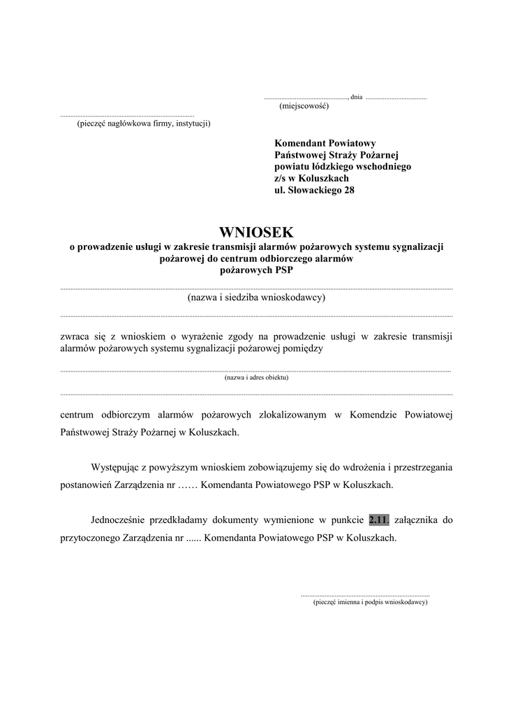 ................................................., dnia .................................... (miejscowość) ............................................................................... (pieczęć nagłówkowa firmy, instytucji) Komendant Powiatowy Państwowej Straży Pożarnej powiatu łódzkiego wschodniego z/s w Koluszkach ul. Słowackiego 28 WNIOSEK o prowadzenie usługi w zakresie transmisji alarmów pożarowych systemu sygnalizacji pożarowej do centrum odbiorczego alarmów pożarowych PSP ....................................................................................................................................................................................................................................... (nazwa i siedziba wnioskodawcy) ....................................................................................................................................................................................................................................... zwraca się z wnioskiem o wyrażenie zgody na prowadzenie usługi w zakresie transmisji alarmów pożarowych systemu sygnalizacji pożarowej pomiędzy ...................................................................................................................................................................................................................................... (nazwa i adres obiektu) ....................................................................................................................................................................................................................................... centrum odbiorczym alarmów pożarowych zlokalizowanym w Komendzie Powiatowej Państwowej Straży Pożarnej w Koluszkach. Występując z powyższym wnioskiem zobowiązujemy się do wdrożenia i przestrzegania postanowień Zarządzenia nr …… Komendanta Powiatowego PSP w Koluszkach. Jednocześnie przedkładamy dokumenty wymienione w punkcie 2.11. załącznika do przytoczonego Zarządzenia nr ...... Komendanta Powiatowego PSP w Koluszkach. ............................................................................ (pieczęć imienna i podpis wnioskodawcy) wzór nr 2 Procedura współpracy z Komendantem Powiatowym PSP w Koluszkach a Operatorem: ……………………………………………………………………..……………..………….. (nazwa Operatora – dużymi literami) oraz właścicielami, zarządcami lub użytkownikami monitorowanych obiektów. ……………. Data opracowania: 2013 r. Procedura nr: Tytuł opracowania: Cel procedury: Pojęcia podstawowe PROCEDURA OBSŁUGI ALARMÓW POŻAROWYCH Kolejność postępowania Centrum Odbiorcze Alarmów Pożarowych, SWD –ST, Centrum Monitorowania Operatora Systemu (CMOS), SPI (System Prezentacji Informacji), SK (Stanowisko Kierowania KM/P PSP w miejscowości) 1. Obsługę alarmów pożarowych wpływających do SK zapewnia jego całodobowa obsada. SK pełni funkcję Centrum Odbiorczego Alarmów Pożarowych. 2. Potwierdzenie przyjęcia alarmu pożarowego poprzez służbę SK odbywa się za pomocą aplikacji SWD-ST jako SPI. 3. Dyspozycja sił i środków odbywa się zgodnie z opracowanymi przez PSP procedurami dysponowania sił i środków do zdarzeń. 4. Obsługa CMOS potwierdza prawidłowość przyjęcia alarmu pożarowego przez SK poprzez wykonanie połączenia telefonicznego i uzyskanie potwierdzenia, że alarm pożarowy wpłynął i jest obsługiwany przez obsadę SK. Numery, na które Operator potwierdza alarm pożarowy to w kolejności: Algorytm postępowania: ……………………. (stacjonarny) – główny, …………………….. (komórka) – w przypadku braku dostępności ww. 5. W przypadku powzięcia przez Operatora informacji, że alarm pożarowy nie dotarł do SK, Operator telefonicznie przekazuje informacje niezbędne do natychmiastowego zadysponowania sił i środków na miejsce zdarzenia. 6. Nie ma możliwości odwołania alarmu pożarowego, który wpłynął do SK. 7. Za nieuzasadnione wezwanie odpowiadają w zakresach swej odpowiedzialności Abonent i Operator według odrębnych przepisów w tym Kodeksu Wykroczeń. Osoby uprawnione do stosowania procedur: Imię, nazwisko: Stanowisko: Zakres uprawnienia Funkcjonariusz Obsada SK Obsługa SK 1. pełniący służbę w SK KP PSP w Koluszkach 2. Pracownicy Centrum Monitorowania Operatora Systemu Operator CMOS Obsługa CMOS Uwagi: Sporządził: Zatwierdził Podpis: KP PSP w Koluszkach Podpis: 1 wzór nr 3 Procedura współpracy z Komendantem Powiatowym PSP w Koluszkach a Operatorem: ……………………………………………………………………………..……………….. (nazwa Operatora – dużymi literami) Data opracowania: Tytuł opracowania: oraz właścicielami, zarządcami lub użytkownikami monitorowanych obiektów. …………………… 2013 r. Procedura nr: Cel procedury: Pojęcia podstawowe Procedura czasowego odwołania transmisji alarmu pożarowego i powrotnego włączenia ww. transmisji oraz trybu postępowania na wypadek prac konserwacyjnych SSP w obiekcie w tym wykaz osób uprawnionych do ww. czynności. Kolejność postępowania Zgłoszenie, czasowe odłączenie transmisji, Centrum Monitorowania Operatora Systemu (CMOS), Stanowisko Kierowania PSP (SK), osoby uprawnione. 1. Operator przesyła zgłoszenie ( wzór nr 3.1) na adres: email: [email protected] lub fax: 44 714 08 90 Po jego przesłaniu Operator potwierdza prawidłowość przyjęcia zgłoszenia przez SK na podstawie wykonania połączenia telefonicznego i uzyskania potwierdzenia, że zgłoszenie wpłynęło. Zgłoszenie należy przesłać przed planowanym wyłączeniem obiektu. Numery, na które Operator potwierdza przesłanie zgłoszenia to: Algorytm postępowania: ……………………. (stacjonarny) – główny, …………………….. (komórka) – w przypadku braku dostępności ww. 2. Powrotne włączenie transmisji odbywa się an