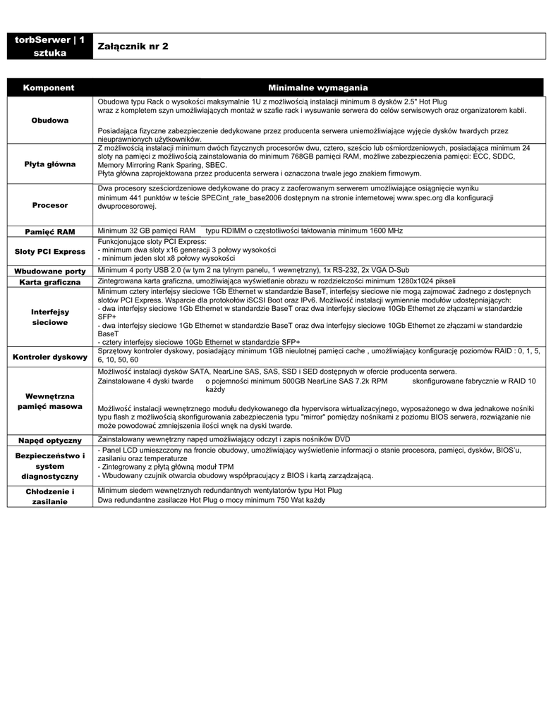 torbSerwer | 1 sztuka Komponent Obudowa Płyta główna Procesor Pamięć RAM Sloty PCI Express Wbudowane porty Karta graficzna Interfejsy sieciowe Kontroler dyskowy Wewnętrzna pamięć masowa Napęd optyczny Bezpieczeństwo i system diagnostyczny Chłodzenie i zasilanie Załącznik nr 2 Minimalne wymagania Obudowa typu Rack o wysokości maksymalnie 1U z możliwością instalacji minimum 8 dysków 2.5" Hot Plug wraz z kompletem szyn umożliwiających montaż w szafie rack i wysuwanie serwera do celów serwisowych oraz organizatorem kabli. Posiadająca fizyczne zabezpieczenie dedykowane przez producenta serwera uniemożliwiające wyjęcie dysków twardych przez nieuprawnionych użytkowników. Z możliwością instalacji minimum dwóch fizycznych procesorów dwu, cztero, sześcio lub ośmiordzeniowych, posiadająca minimum 24 sloty na pamięci z możliwością zainstalowania do minimum 768GB pamięci RAM, możliwe zabezpieczenia pamięci: ECC, SDDC, Memory Mirroring Rank Sparing, SBEC. Płyta główna zaprojektowana przez producenta serwera i oznaczona trwale jego znakiem firmowym. Dwa procesory sześciordzeniowe dedykowane do pracy z zaoferowanym serwerem umożliwiające osiągnięcie wyniku minimum 441 punktów w teście SPECint_rate_base2006 dostępnym na stronie internetowej www.spec.org dla konfiguracji dwuprocesorowej. Minimum 32 GB pamięci RAM typu RDIMM o częstotliwości taktowania minimum 1600 MHz Funkcjonujące sloty PCI Express: - minimum dwa sloty x16 generacji 3 połowy wysokości - minimum jeden slot x8 połowy wysokości Minimum 4 porty USB 2.0 (w tym 2 na tylnym panelu, 1 wewnętrzny), 1x RS-232, 2x VGA D-Sub Zintegrowana karta graficzna, umożliwiająca wyświetlanie obrazu w rozdzielczości minimum 1280x1024 pikseli Minimum cztery interfejsy sieciowe 1Gb Ethernet w standardzie BaseT, interfejsy sieciowe nie mogą zajmować żadnego z dostępnych slotów PCI Express. Wsparcie dla protokołów iSCSI Boot oraz IPv6. Możliwość instalacji wymiennie modułów udostępniających: - dwa interfejsy sieciowe 1Gb Ethernet w standardzie BaseT oraz dwa interfejsy sieciowe 10Gb Ethernet ze złączami w standardzie SFP+ - dwa interfejsy sieciowe 1Gb Ethernet w standardzie BaseT oraz dwa interfejsy sieciowe 10Gb Ethernet ze złączami w standardzie BaseT - cztery interfejsy sieciowe 10Gb Ethernet w standardzie SFP+ Sprzętowy kontroler dyskowy, posiadający minimum 1GB nieulotnej pamięci cache , umożliwiający konfigurację poziomów RAID : 0, 1, 5, 6, 10, 50, 60 Możliwość instalacji dysków SATA, NearLine SAS, SAS, SSD i SED dostępnych w ofercie producenta serwera. Zainstalowane 4 dyski twarde o pojemności minimum 500GB NearLine SAS 7.2k RPM skonfigurowane fabrycznie w RAID 10 każdy Możliwość instalacji wewnętrznego modułu dedykowanego dla hypervisora wirtualizacyjnego, wyposażonego w dwa jednakowe nośniki typu flash z możliwością skonfigurowania zabezpieczenia typu "mirror" pomiędzy nośnikami z poziomu BIOS serwera, rozwiązanie nie może powodować zmniejszenia ilości wnęk na dyski twarde. Zainstalowany wewnętrzny napęd umożliwiający odczyt i zapis nośników DVD - Panel LCD umieszczony na froncie obudowy, umożliwiający wyświetlenie informacji o stanie procesora, pamięci, dysków, BIOS’u, zasilaniu oraz temperaturze - Zintegrowany z płytą główną moduł TPM - Wbudowany czujnik otwarcia obudowy współpracujący z BIOS i kartą zarządzającą. Minimum siedem wewnętrznych redundantnych wentylatorów typu Hot Plug Dwa redundantne zasilacze Hot Plug o mocy minimum 750 Wat każdy Karta zarządzająca Niezależna od zainstalowanego systemu operacyjnego, zintegrowana z płytą główną posiadająca port RJ45 lub jako dodatkowa karta rozszerzeń (Zamawiający dopuszcza zastosowanie karty instalowanej w slocie PCI Express jednak nie może ona powodować zmiejszenia minimalnej ilości wymaganych slotów w serwerze), posiadająca minimalną funkcjonalność : - komunikacja poprzez dedykowany interfejs RJ45 - podstawowe zarządzanie serwerem poprzez protokół IPMI 2.0, SNMP, VLAN tagging - wbudowana diagnostyka - wbudowane narzędzia do instalacji systemów operacyjnych - dostęp poprzez interfejs graficzny Web karty oraz z linii poleceń - monitorowanie zasilania oraz zużycia energii przez serwer w czasie rzeczywistym z możliwością graficznej prezentacji - lokalna oraz zdalna konfiguracja serwera - zdalna instalacja systemów operacyjnych - wsparcie dla IPv4 i IPv6 - zapis zrzutu ekranu z ostatniej awarii - integracja z Active Directory - wirtualna konsola z dostępem do myszy i klawiatury - udostępnianie wirtualnej konsoli - autentykacja poprzez publiczny klucz (dla SSH) - możliwość obsługi poprzez dwóch administratorów równocześnie - wysyłanie do administratora powiadomienia o awarii lub zmianie konfiguracji sprzętowej - automatyczne przywracanie ustawień serwera,kart sieciowych, BIOS, wersji firmware w przypadku awarii i wymiany któregoś z komponentów (w tym kontrolera RAID, kart sieciowych, płyty głównej) zapisanych na dedykowanej pamięci flash wbudowanej na karcie zarządzającej - możliwość partycjonowania wbudowanej pamięci flash na minimum dwie partycje po 4GB każda Pięć lat gwarancji realizowanej w miejscu instalacji sprzętu, z czasem reakcji do następnego dnia roboczego od przyjęcia zgłoszenia, możliwość zgłaszania awarii w trybie 24x7x365 poprzez ogólnopolską linię telefoniczną producenta. W przypadku awarii, dyski twarde pozostają własnością Zamawiającego. Gwarancja Certyfikaty Firma serwisująca musi posiadać ISO 9001:2000 na świadczenie usług serwisowych oraz posiadać autoryzacje producenta serwera ( będzie to weryfikowane na etapie realizowania umowy ). Możliwość telefonicznego i elektronicznego sprawdzenia konfiguracji sprzętowej serwera oraz warunków gwarancji po podaniu numeru seryjnego bezpośrednio u producenta oraz poprzez stronę internetową producenta lub jego przedstawi