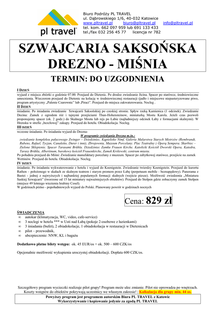 Biuro Podróży PL TRAVEL ul. Dąbrowskiego 1/6, 40-032 Katowice www.pltravel.pl [email protected] [email protected] tel. kom. 662 097 959 lub 691 133 433 tel./fax 032 256 45 77 licencja nr 782 SZWAJCARIA SAKSOŃSKA DREZNO - MIŚNIA TERMIN: DO UZGODNIENIA I DZIEŃ wyjazd z miejsca zbiórki o godzinie 07.00. Przejazd do Dietenic. Po drodze zwiedzanie Jicina. Spacer po starówce, średniowieczne umocnienia. Wieczorem przejazd do Dietenic na kolację w średniowiecznej restauracji (jadło i miejscowe niepasteryzowane piwo, program artystyczny „Palenie Czarownic” lub ,Piraci”. Przejazd do miejsca zakwaterowania. Nocleg . II DZIEŃ śniadanie. Po śniadaniu zwiedzanie Szwajcarii Saksońskiej po czeskiej stronie. Spływ rzeką Kamienica (1 odcinek). Zwiedzanie Decina: Zamek z ogrodem róż i tajnymi przejściami Thun-Hohensteinow, miniaturką Mostu Karola. Jeżeli czas pozwoli proponujemy spacer (ok. 2 godz.) do Skalnego Mostu lub rejs po Łabie (najładniejszy odcinek Łaby z formacjami skalnymi). W Hrensku w strefie „bezcłowej” zakupy. Przejazd do hotelu. Obiadokolacja. Nocleg. III DZIEŃ wczesne śniadanie. Po śniadaniu wyjazd do DreznaW programie zwiedzania Drezna m.in.: zwiedzanie kompleksu pałacowego Zwinger – Dziedziniec, Kąpielisko Nimf, Galeria Malarstwa Starych Mistrzów (Rembrandt, Rubens, Rafael, Tycjan, Canaletto, Durer i inni), Zbrojownia, Muzeum Porcelany. Plac Teatralny z Operą Sempera. Skarbiec – Zielone Sklepienie. Spacer Tarasami Brühla. Dziedziniec Zamku Frauen Kirche. Katolicki Kościół Dworski Opera, Katedra, Tarasy Brühla, Albertinum, barokowy kościół Frauenkirche, Zamek Królewski, centrum miasta. Po południu przejazd do Miśni: Zwiedzanie manufaktury porcelany z muzeum. Spacer po zabytkowej starówce, przejście na zamek Wettinów. Przejazd do hotelu. Obiadokolacja. Nocleg. IV DZIEŃ śniadanie. Po śniadaniu wykwaterowanie z hotelu i wyjazd do Koenigstein. Zwiedzanie twierdzy Koenigstein. Przejazd do kurortu Rathen – położonego w skałach ze skalnym teatrem i starym promem przez Łabę (perpetuum mobile - beznapędowy). Panorama z Bastei - jednej z najwyższych i najbardziej popularnych formacji skalnych (wejście piesze). Możliwość zwiedzenia „Miniatura Saskiej Szwajcarii” (tworzone od 15 lat miniatury najważniejszych obiektów). Przejazd do Stolpen gdzie zobaczymy zamek Stolpen (miejsce 49 letniego wiezienia hrabiny Cosel). W godzinach późno - popołudniowych wyjazd do Polski. Planowany powrót w godzinach nocnych Cena: 829 zł ŚWIADCZENIA • autokar (klimatyzacja, WC, video, cafe-service) • 3 noclegi w hotelu *** w Usti nad Łabą (pokoje 2-osobowe z łazienkami) • 3 śniadania (bufet), 2 obiadokolacje, 1 obiadokolacja w restauracji w Dietenicach • pilot – przewodnik, • ubezpieczenie: NNW, KL i bagażu Dodatkowo płatne bilety wstępu: ok. 45 EUR/os + ok. 500 – 600 CZK/os Opcjonalnie możliwość wykupienia uroczystej obiadokolacji. Dopłata 600 CZK/os. Szczegółowy program wycieczki realizuje pilot grupy! Program może ulec zmianie. Pilot nie oprowadza po wnętrzach. Koszty wstępów do obiektów pokrywają uczestnicy we własnym zakresie! | Kalkulacja dla grupy min. 44 os. Powyższy program jest programem autorskim Biura PL TRAVEL z Katowic Wykorzystywanie i kopiowanie jedynie za zgodą PL TRAVEL