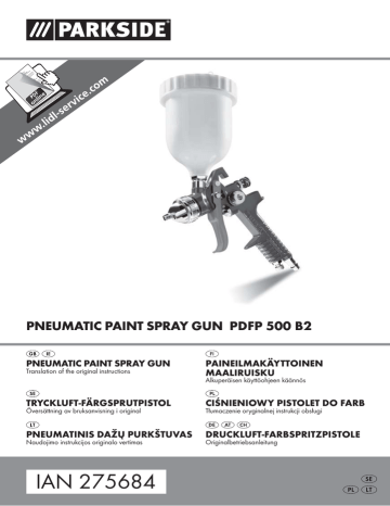 PNEUMATIC PAINT SPRAY GUN PDFP 500 B2 PNEUMATIC PAINT SPRAY GUN Translation of the original instructions PAINEILMAKÄYTTOINEN MAALIRUISKU Alkuperäisen käyttöohjeen käännös TRYCKLUFT-FÄRGSPRUTPISTOL CIŚNIENIOWY PISTOLET DO FARB PNEUMATINIS DAŽŲ PURKŠTUVAS DRUCKLUFT-FARBSPRITZPISTOLE Översättning av bruksanvisning i original Naudojimo instrukcijos originalo vertimas IAN 275684 Tłumaczenie oryginalnej instrukcji obsługi Originalbetriebsanleitung Before reading, unfold the page containing the illustrations and familiarise yourself with all functions of the device. Käännä ennen lukemista kuvallinen sivu esiin ja tutustu seuraavaksi laitteen kaikkiin toimintoihin. Vik ut bildsidan och ha den till hands när du läser igenom anvisningarna och gör dig bekant med apparatens / maskinens funktioner. Przed przeczytaniem proszę rozłożyć stronę z ilustracjami, a następnie proszę zapoznać się z wszystkimi funkcjami urządzenia. Prieš skaitydami atsiverskite lapą su paveikslėliais ir susipažinkite su visomis prietaiso funkcijomis. Klappen Sie vor dem Lesen die Seite mit den Abbildungen aus und machen Sie sich anschließend mit allen Funktionen des Gerätes vertraut. GB / IE FI SE PL LT DE / AT / CH Translation of the original instructions Alkuperäisen käyttöohjeen käännös Översättning av bruksanvisning i original Tłumaczenie oryginalnej instrukcji obsługi Naudojimo instrukcijos originalo vertimas Originalbetriebsanleitung Page Sivu Sidan Strona Seite Seite 1 9 17 25 35 43 A B C D Contents GB IE Introduction . . . . . . . . . . . . . . . . . . . . . . . . . . . . . . . . . . . . . . . . . . . . . . . . . . . . . . 2 Intended use . . . . . . . . . . . . . . . . . . . . . . . . . . . . . . . . . . . . . . . . . . . . . . . . . . . . . . . . . . . . . . . . Features . . . . . . . . . . . . . . . . . . . . . . . . . . . . . . . . . . . . . . . . . . . . . . . . . . . . . . . . . . . . . . . . . . . Package contents . . . . . . . . . . . . . . . . . . . . . . . . . . . . . . . . . . . . . . . . . . . . . . . . . . . . . . . . . . . . Technical details . . . . . . . . . . . . . . . . . . . . . . . . . . . . . . . . . . . . . . . . . . . . . . . . . . . . . . . . . . . . . 2 2 2 2 Safety information . . . . . . . . . . . . . . . . . . . . . . . . . . . . . . . . . . . . . . . . . . . . . . . . 3 Original accessories/auxiliary equipment . . . . . . . . . . . . . . . . . . . . . . . . . . . . . . . . . . . . . . . . . 3 Safety instructions for fine spray systems . . . . . . . . . . . . . . . . . . . . . . . . . . . . . . . . . . . . . . . . . . 4 Operation . . . . . . . . . . . . . . . . . . . . . . . . . . . . . . . . . . . . . . . . . . . . . . . . . . . . . . . 4 HVLP properties . . . . . . . . . . . . . . . . . . . . . . . . . . . . . . . . . . . . . . . . . . . . . . . . . . . . . . . . . . . . . Connecting the device . . . . . . . . . . . . . . . . . . . . . . . . . . . . . . . . . . . . . . . . . . . . . . . . . . . . . . . . Preparing the surface . . . . . . . . . . . . . . . . . . . . . . . . . . . . . . . . . . . . . . . . . . . . . . . . . . . . . . . . . Switching the appliance on/off . . . . . . . . . . . . . . . . . . . . . . . . . . . . . . . . . . . . . . . . . . . . . . . . . Setting the paint jet pattern . . . . . . . . . . . . . . . . . . . . . . . . . . . . . . . . . . . . . . . . . . . . . . . . . . . . Adjusting the paint flow . . . . . . . . . . . . . . . . . . . . . . . . . . . . . . . . . . . . . . . . . . . . . . . . . . . . . . . Adjusting the airflow. . . . . . . . . . . . . . . . . . . . . . . . . . . . . . . . . . . . . . . . . . . . . . . . . . . . . . . . . . 4 4 5 5 5 5 6 Maintenance and cleaning. . . . . . . . . . . . . . . . . . . . . . . . . . . . . . . . . . . . . . . . . . 6 Disposal . . . . . . . . . . . . . . . . . . . . . . . . . . . . . . . . . . . . . . . . . . . . . . . . . . . . . . . . . 7 Warranty . . . . . . . . . . . . . . . . . . . . . . . . . . . . . . . . . . . . . . . . . . . . . . . . . . . . . . . . 7 Service . . . . . . . . . . . . . . . . . . . . . . . . . . . . . . . . . . . . . . . . . . . . . . . . . . . . . . . . . . 8 Importer . . . . . . . . . . . . . . . . . . . . . . . . . . . . . . . . . . . . . . . . . . . . . . . . . . . . . . . . 8 Translation of the original Conformity Declaration . . . . . . . . . . . . . . . . . . . . . . 8 PDFP 500 B2 1 GB IE PNEUMATIC PAINT SPRAY GUN PDFP 500 B2 Introduction Congratulations on the purchase of your new appliance. You have selected a high-quality product. The operating instructions are part of this product. They contain important information about safety, usage and disposal. Before using the product, please familiarise yourself with all operating and safety instructions. Use the product only as described and for the range of applications specified. Please also pass these operating instructions on to any future owner. Intended use This compressed air-powered appliance is designed solely for the application/spraying of solvent-based and water-soluble paints, glazes, foundation, clear varnishes, vehicle paints, stains, wood preservatives, pesticides, oils and disinfectants. The appliance is not suitable for working with emulsions or latex paints, lye, acidic coatings, granular and gritty spray materials or spray- or drip-resistant materials. Any other usage of or modification to the appliance is deemed to be improper and carries a significant risk of accidents. The manufacturer accepts no responsibility for damage(s) resulting from improper usage. This appliance is intended for domestic use only. Symbols on the compressed air tool: WARNING! Read the operating instructions before use. Features Venting Flow cup lid Flow cup Stroke limiter screw (paint flow-rate control) Control for round/broad jet Compressed-air connection Airflow control Trigger Nozzle head Needle Spring Brush Filter Inner screw thread (flow cup) Package contents 1 pneumatic paint spray gun PDFP 500 B2 1 