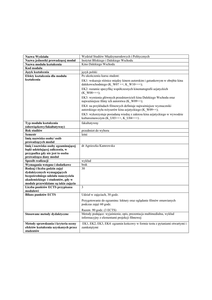 Nazwa Wydziału Nazwa jednostki prowadzącej moduł Nazwa modułu kształcenia Kod modułu Język kształcenia Efekty kształcenia dla modułu kształcenia Wydział Studiów Międzynarodowych i Politycznych Instytut Bliskiego i Dalekiego Wschodu Kino Dalekiego Wschodu Typ modułu kształcenia (obowiązkowy/fakultatywny) Rok studiów Semestr Imię nazwisko osoby/ osób prowadzących moduł Imię i nazwisko osoby egzaminującej bądź udzielającej zaliczenia, w przypadku gdy nie jest to osoba prowadząca dany moduł Sposób realizacji Wymagania wstępne i dodatkowe Rodzaj i liczba godzin zajęć dydaktycznych wymagających bezpośredniego udziału nauczyciela akademickiego i studentów, gdy w module przewidziane są takie zajęcia Liczba punktów ECTS przypisana modułowi Bilans punktów ECTS fakultatywny język polski Po ukończeniu kursu student: EK1: wskazuje różnice między kinem autorskim i gatunkowym w obrębie kina dalekowschodniego (K_W07 ++; K_W10+++); EK2: rozumie specyfikę współczesnych kinematografii azjatyckich (K_W08+++); EK3: wymienia głównych przedstawicieli kina Dalekiego Wschodu oraz najważniejsze filmy ich autorstwa (K_W09++); EK4: na przykładach filmowych definiuje najważniejsze wyznaczniki autorskiego stylu reżyserów kina azjatyckiego (K_W09++); EK5: wykorzystuje posiadaną wiedzę z zakresu kina azjatyckiego w wywodzie kulturoznawczym (K_U03+++, K_U04+++) . przedmiot do wyboru letni dr Agnieszka Kamrowska wykład brak 30 3 Udział w zajęciach, 30 godz. Przygotowanie do egzaminu: lektury oraz oglądanie filmów omawianych podczas zajęć 60 godz. Stosowane metody dydaktyczne Metody sprawdzania i kryteria oceny efektów kształcenia uzyskanych przez studentów Razem 90 godz. (3 ECTS) Metody podające: wyjaśnienie, opis, prezentacja multimedialna, wykład informacyjny z elementami projekcji filmowej EK1, EK2, EK3, EK4: egzamin końcowy w formie testu z pytaniami otwartymi i zamkniętymi Forma i warunki zaliczenia modułu, w tym zasady dopuszczenia do egzaminu, zaliczenia, a także forma i warunki zaliczenia poszczególnych zajęć wchodzących w zakres danego modułu Treści modułu kształcenia Wykaz literatury podstawowej i uzupełniającej, obowiązującej do zaliczenia danego modułu Wymiar, zasady i forma odbywania praktyk, w przypadku gdy program kształcenia przewiduje praktyki Warunkiem zaliczenia kursu jest udział w zajęciach oraz uzyskanie pozytywnej oceny z egzaminu końcowego. Kino Korei Południowej - wprowadzenie historyczne Koreańscy autorzy: Park Chan-wook, Kim Ki-duk Kino Japonii: wprowadzenie historyczne – okres mistrzowski i nowa fala 4. Twarze nowego kina japońskiego: Takeshi Kitano, Takashi Miike 4. J-horror: kulturowe, literackie i filmowe korzenie japońskiej odmiany horroru oraz jego główni przedstawiciele: Hideo Nakata i Takashi Shimizu 5. Kino Chin – rys historyczny: cztery generacje reżyserów chińskiego kina 6. Chińskie kino piątego pokolenia: Chen Kaige, Zhang Yimou 7. Szósta generacja chińskich filmowców: Wang Xiaoshuai, Zhang Yuan, Jia Zhangke, Lou Ye 8. Kino Hongkongu: rys historyczny 9. Autorska twórczość Wonga Kar-waia 10. Kino Tajwanu – rys historyczny 11. Nowe kino Tajwanu: Tsaï Ming-liang, Edward Yang, Hou Hsiao-hsien, Ang Lee Literatura podstawowa: A. Helman, A. Kamrowska (red.), Autorzy kina azjatyckiego, Kraków: Wydawnictwo Rabid 2010. A. Helman, Odcienie czerwieni. Twórczość filmowa Zhanga Yimou, Gdańsk: Słowo Obraz Terytoria 2010. P. Kletowski, Śmierć jest moim zwycięstwem, Kino Takeshi Kitano, Kraków: Wydawnictwo Rabid 2001. P. Kletowski, P. Marecki (red.), Nowe nawigacje II. Azja – Cyberpunk – Kino niezależne, Kraków: Wydawnictwo Rabid 2003. „Kwartalnik Filmowy” nr 51/2005. „Studia Filmoznawcze”- Kino Azji, nr 28/2007. brak 1. 2. 3.
