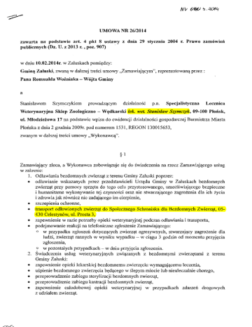 UMOWA NR 26/2014 zawarta na podstawie art. 4 pkt 8 ustawy z dnia 29 stycznia 2004 r. Prawo zamówień publicznych (Dz. U. z 2013 r., poz. 907) w dniu 10.02.2014r. w Załuskach pomiędzy: Gminą Załuski, zwaną w dalszej treści umowy „Zamawiającym", reprezentowaną przez : Pana Romualda Woźniaka - Wójta Gminy a Stanisławem Szymczykiem prowadzącym działalność p.n. Specjalistyczna Lecznica Weterynaryjna Sklep Zoologiczno - Wędkarski lek. wet. Stanisław Szymczyk, 09-100 Płońsk, ul. Młodzieżowa 17 na podstawie wpisu do ewidencji działalności gospodarczej Burmistrza Miasta Płońska z dnia 2 grudnia 2009r. pod numerem 1531, REGON 130015653, zwanym w dalszej treści umowy „Wykonawcą". §1 Zamawiający zleca, a Wykonawca zobowiązuje się do świadczenia na rzecz Zamawiającego usług w zakresie: 1. Odławiania bezdomnych zwierząt z terenu Gminy Załuski poprzez: • odławianie wskazanych przez przedstawicieli Urzędu Gminy w Załuskach bezdomnych zwierząt przy pomocy sprzętu do tego celu przystosowanego, umożliwiającego bezpieczne i humanitarne wykonywanie tej czynności oraz nie stwarzającego zagrożenia dla ich życia i zdrowia jak również nie zadającego im cierpienie, • szczepienia ochronne, • transport odłowionych zwierząt do Społecznego Schroniska dla Bezdomnych Zwierząt, 05430 Celestynów, ul. Prosta 3, • zapewnienie w razie potrzeby opieki weterynaryjnej podczas odławiania i transportu, • podejmowanie reakcji na telefoniczne zgłoszenie Zamawiającego: ° w przypadku zgłoszeń dotyczących zwierząt agresywnych, stwarzający zagrożenie dla ludzi, zwierząt rannych w wyniku wypadku - w ciągu 3 godzin od momentu przyjęcia zgłoszenia, ° w pozostałych przypadkach - w dniu przyjęcia zgłoszenia. 2. Świadczenia usług weterynaryjnych związanych z bezdomnymi zwierzętami z terenu Gminy Załuski: • zapewnienie opieki lekarskiej bezdomnemu zwierzęciu wymagającemu leczenia • uśpienie bezdomnego zwierzęcia będącego w ślepym miocie lub nieuleczalnie chorego, • przeprowadzenie zabiegu sterylizacji bezdomnych zwierząt, • przeprowadzenie zabiegu kastracji bezdomnych zwierząt, • zapewnienie całodobowej opieki weterynaryjnej w przypadkach zdarzeń drogowych z udziałem zwierząt. Zamawiający wymaga aby usługi wymienione w niniejszej umowie zostały wykonane zgodnie z przepisami ustawy z dnia 21 sierpnia 1997 r. o ochronie zwierząt (t.j. Dz. U. z 2003 r. Nr 106, poz. 1002 ze zm.), wraz z rozporządzeniem Rady (WE) Nr 1/2005 z dnia 22 grudnia 2004 r. w sprawie ochrony zwierząt podczas transportu i związanych z tym działań oraz zmieniającym dyrektywy 64/432/EWG i 93/119/WE oraz rozporządzenie (WE) nr 1255/97 (Dz. Urz. UE L 3 z 05.01.2005, str.l), rozporządzenia Ministra Spraw Wewnętrznych i Administracji z dnia 26 sierpnia 1998 r. w sprawie zasad i warunków wyłapywania bezdomnych zwierząt (Dz. U. z 1998 r. Nr 116, poz. 753). §3 Za wykonywanie przedmiotu umowy ustala się następujące ceny jednostkowe z tytułu: • odławiania bezdomnych zwierząt w wysokości: 460,00 zł netto + 36,80 zł (8 % VAT) = 496,80 zł • szczepienia ochronnego w wysokości: 50,00 zł netto + 4,00 zł (8% VAT) = 54,00 zł • transportu odłowionych zwierząt do schroniska dla bezdomnych zwierząt w wysokości: 90,00 zł netto + 7,20 zł (8 % VAT) = 97,20 zł • opłaty schroniskowej w Społecznym Schronisku dla Bezdomnych Zwierząt w Celestynowie w wysokości: - osobnik dorosły - 1 200,00 zł/szt. netto + 96,00 zł (8 % VAT) = 1296,00 zł - szczeniak - 600 zł/szt. netto + 48,00 zł (8 % VAT) = 648,00 zł (Razem koszty odłowienia i umieszczenia w schronisku: - osobnik dorosły - 1 800,00 zł/szt. + 8 %VAT = 1 944,00 zł brutto/szt. - szczeniak 1 200,00 zł/szt. + 8% VAT = 1 296,00 zł brutto/szt.) • zapewnienia opieki lekarskiej bezdomnemu zwierzęciu wymagającemu leczenia w zależności od ceny usług weterynaryjnych aktualnie obowiązujących w lecznicy, • uśpienia bezdomnego zwierzęcia będącego w ślepym miocie lub nieuleczalnie chorego w zależności od ceny usług weterynaryjnych aktualnie obowiązujących w lecznicy, • przeprowadzenia zabiegu sterylizacji bezdomnych zwierząt w zależności od ceny usług weterynaryjnych aktualnie obowiązujących w lecznicy, • przeprowadzenia zabiegu kastracji bezdomnych zwierząt w zależności od ceny usług weterynaryjnych aktualnie obowiązujących w lecznicy, • zapewnienia całodobowej opieki weterynaryjnej w przypadkach zdarzeń drogowych z udziałem zwierząt w zależności od ceny usług weterynaryjnych aktualnie obowiązujących w lecznicy, • w przypadku zapewnienia adopcji bezdomnych zwierząt z terenu Gminy Załuski koszt odłowienia bezdomnych zwierząt, transport, szczepienia ochronne oraz zabiegi sterylizacji będą łącznie w kwocie: - osobnik dorosły - 1 800,00 zł/szt. + 8 %VAT = 1 944,00 zł brutto/szt. - szczeniak - 1 200,00 zł/szt. + 8% VAT = 1 296,00 zł brutto/szt. §4 1. Rozliczenie za świadczone usługi będzie następować wg faktycznie wykonanych usług po cenach jednostkowych. Zamawiający wypłaci należność za wykonanie usług wymienionych w § 3 w terminie do 14 dni od chwili złożenia przez Wykonawcę faktury. Złożona faktura powinna zawierać usługi wymienione w § 3. W przypadku odłowienia psa i dostarczenia do schroniska Wykonawca dodatkowo dołączy do rachunku dowód dostawy do schroniska. 2. Zamawiający zastrzega, aby ostatnia faktura została wystawiona do 10 grudnia 2014r. Zamawiający zastrzega sobie prawo kontroli realizacji przez Wykonawcę usług będących przedmiotem umowy, a Wykonawca zobowiązuje się poddać tej kontroli w każdej fazie jej wykonania. §6 1. Umowę zawiera się na okres od dnia 1 stycznia 2014 r. do 31 grudnia 2014 r. 2. Umowa może być rozwiązana przez każdą ze stron z zachowaniem 3 miesięcznego okresu wypowiedzenia ze skutkiem rozwiązującym na koniec miesiąca kalendarzowego. 3. Umowa może by