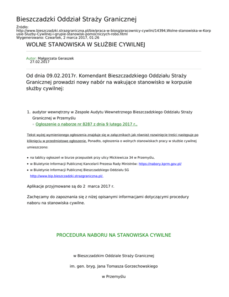 Bieszczadzki Oddział Straży Granicznej Źródło: http://www.bieszczadzki.strazgraniczna.pl/bie/praca-w-biosg/pracownicy-cywilni/14394,Wolne-stanowiska-w-Korp usie-Sluzby-Cywilnej-i-grupie-stanowisk-pomocniczych-robo.html Wygenerowano: Czwartek, 2 marca 2017, 01:26 WOLNE STANOWISKA W SŁUŻBIE CYWILNEJ Autor: Małgorzata Geraszek 27.02.2017 Od dnia 09.02.2017r. Komendant Bieszczadzkiego Oddziału Straży Granicznej prowadzi nowy nabór na wakujące stanowisko w korpusie służby cywilnej: 1. audytor wewnętrzny w Zespole Audytu Wewnetrznego Bieszczadzkiego Oddziału Straży Granicznej w Przemyślu ❍ Ogłoszenie o naborze nr 8287 z dnia 9 lutego 2017 r., Tekst wyżej wymienionego ogłoszenia znajduje się w załącznikach jak również rozwinięcie treści następuje po kliknięciu w przedmiotowe ogłoszenie. Ponadto, ogłoszenia o wolnych stanowiskach pracy w służbie cywilnej umieszczono: ● na tablicy ogłoszeń w biurze przepustek przy ulicy Mickiewicza 34 w Przemyślu, ● w Biuletynie Informacji Publicznej Kancelarii Prezesa Rady Ministrów: https://nabory.kprm.gov.pl/ ● w Biuletynie Informacji Publicznej Bieszczadzkiego Oddziału SG http://www.bip.bieszczadzki.strazgraniczna.pl/. Aplikacje przyjmowane są do 2 marca 2017 r. Zachęcamy do zapoznania się z niżej opisanymi informacjami dotyczącymi procedury naboru na stanowiska cywilne. PROCEDURA NABORU NA STANOWISKA CYWILNE w Bieszczadzkim Oddziale Straży Granicznej im. gen. bryg. Jana Tomasza Gorzechowskiego w Przemyślu Komórką organizacyjną odpowiedzialną za organizowanie naboru pracowników cywilnych jest: Wydział Kadr i Szkolenia Bieszczadzkiego Oddziału Straży Granicznej ul. Mickiewicza 34, 37-700 Przemyśl kontakt telefoniczny 16 673 22 54 od poniedziałku do piątku w godz.7:30-15:30 STANOWISKA W SŁUŻBIE CYWILNEJ: Nabór na stanowiska w Korpusie Służby Cywilnej odbywa się zgodnie z przepisami ustawy z dnia 21.11.2008 r. o Służbie Cywilnej (t.j. Dz.U. z 2014 r., poz. 1111 z późn. zm.) oraz w oparciu o Decyzją Nr 191 Komendanta Bieszczadzkiego Oddziału Straży Granicznej z dnia 18 września 2015 r. w sprawie naboru do służby cywilnej Bieszczadzkiego Oddziału Straży Granicznej. Ogłoszenia o wolnych stanowiskach pracy w służbie cywilnej umieszczane są w: ● miejscach ogólnie dostępnych w Komendzie Bieszczadzkiego Oddziału SG (m. in. tablica ogłoszeń na biurze przepustek przy ulicy Mickiewicza 34 w Przemyślu); ● Biuletynie Informacji Publicznej Kancelarii Prezesa Rady Ministrów: https://nabory.kprm.gov.pl/ ● Biuletynie Informacji Publicznej Bieszczadzkiego Oddziału SG: http://www.bip.bieszczadzki.strazgraniczna.pl/ Serwis Służby Cywilnej STANOWISKA W GRUPIE STANOWISK POMOCNICZYCH, ROBOTNICZYCH I OBSŁUGI: Nabór na stanowiska w grupie stanowisk pomocniczych, robotniczych i obsługi odbywa się zgodnie z Decyzją Nr 190 Komendanta Bieszczadzkiego Oddziału Straży Granicznej z dnia 18 września 2015 r. w sprawie naboru kandydatów na stanowiska nienależące do korpusu służby cywilnej w Bieszczadzkiego Oddziału Straży Granicznej, poprzez ogłoszenie informacji o wolnych stanowiskach pracy w: ● miejscach ogólnie dostępnych w Komendzie Bieszczadzkiego Oddziału SG (m. in. tablica ogłoszeń na biurze przepustek przy ulicy Mickiewicza 34 w Przemyślu) ● Powiatowym Urzędzie Pracy ● na stronie internetowej Bieszczadzkiego Oddziału SG: http://www.bieszczadzki.strazgraniczna.pl/ Informacje telefoniczne udzielane są od poniedziałku do piątku w godz. 7:30 - 15:30 pod nr tel. (016) 673 2254 oraz 673 2875 ZAŁĄCZNIKI DO STRONY Ogłoszenie o naborze nr 8287 z dnia 09.02.2017r. - audytor wewnętrzny (pdf, 46.44 KB) Data publikacji 10.02.2017 12:53 Ogłoszenie o naborze nr 5 z dnia 5 października 2016 r. - Sprzątaczka Placówki SG kat. III w Stuposianach Bieszczadzkiego Oddziału Straży Granicznej w Przemyślu (pdf, 847.97 KB) Data publikacji 05.10.2016 13:43 Decyzja Nr 190 z dnia 18.09.2015 r. (pdf, 3.8 MB) Data publikacji 10.02.2016 16:02 Decyzja nr 191 z dnia 18.09.2015 r. (pdf, 3.88 MB) Data publikacji 10.02.2016 16:03 Oświadczenie (pdf, 373.17 KB) Data publikacji 10.11.2016 13:38
