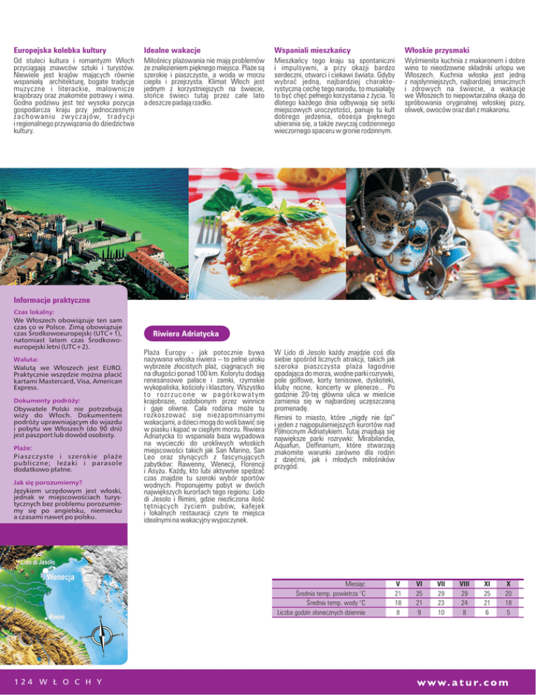 Europejska kolebka kultury Idealne wakacje Wspaniali mieszkañcy W³oskie przysmaki Od stuleci kultura i romantyzm W³och przyci¹gaj¹ znawców sztuki i turystów. Niewiele jest krajów maj¹cych równie wspania³¹ architekturê, bogate tradycje muzyczne i literackie, malownicze krajobrazy oraz znakomite potrawy i wina. Godna podziwu jest te¿ wysoka pozycja gospodarcza kraju przy jednoczesnym z a c h o w a n i u z w y c z a j ó w, t r a d y c j i i regionalnego przywi¹zania do dziedzictwa kultury. Mi³oœnicy pla¿owania nie maj¹ problemów ze znalezieniem piêknego miejsca. Pla¿e s¹ szerokie i piaszczyste, a woda w morzu ciep³a i przejrzysta. Klimat W³och jest jednym z korzystniejszych na œwiecie, s³oñce œwieci tutaj przez ca³e lato a deszcze padaj¹ rzadko. Mieszkañcy tego kraju s¹ spontaniczni i impulsywni, a przy okazji bardzo serdeczni, otwarci i ciekawi œwiata. Gdyby wybraæ jedn¹, najbardziej charakterystyczn¹ cechê tego narodu, to musia³aby to byæ chêæ pe³nego korzystania z ¿ycia. To dlatego ka¿dego dnia odbywaj¹ siê setki miejscowych uroczystoœci, panuje tu kult dobrego jedzenia, obsesja piêknego ubierania siê, a tak¿e zwyczaj codziennego wieczornego spaceru w gronie rodzinnym. Wyœmienita kuchnia z makaronem i dobre wino to nieodzowne sk³adniki urlopu we W³oszech. Kuchnia w³oska jest jedn¹ z najs³ynniejszych, najbardziej smacznych i zdrowych na œwiecie, a wakacje we W³oszech to niepowtarzalna okazja do spróbowania oryginalnej w³oskiej pizzy, oliwek, owoców oraz dañ z makaronu. Informacje praktyczne Czas lokalny: We Włoszech obowiązuje ten sam czas co w Polsce. Zimą obowiązuje czas Środkowoeuropejski (UTC+1), natomiast latem czas Środkowoeuropejski letni (UTC+2). Waluta: Walutą we Włoszech jest EURO. Praktycznie wszędzie można płacić kartami Mastercard, Visa, American Express. Dokumenty podró¿y: Obywatele Polski nie potrzebują wizy do Włoch. Dokumentem podróży uprawniającym do wjazdu i pobytu we Włoszech (do 90 dni) jest paszport lub dowód osobisty. Pla¿e: Piaszczyste i szerokie plaże publiczne; leżaki i parasole dodatkowo płatne. Jak siê porozumiemy? Językiem urzędowym jest włoski, jednak w miejscowościach turystycznych bez problemu porozumiemy się po angielsku, niemiecku a czasami nawet po polsku. Riwiera Adriatycka Pla¿a Europy - jak potocznie bywa nazywana w³oska riwiera – to pe³ne uroku wybrze¿e z³ocistych pla¿, ci¹gn¹cych siê na d³ugoœci ponad 100 km. Kolorytu dodaj¹ renesansowe pa³ace i zamki, rzymskie wykopaliska, koœcio³y i klasztory. Wszystko to rozrzucone w pagórkowatym krajobrazie, ozdobionym przez winnice i gaje oliwne. Ca³a rodzina mo¿e tu rozkoszowaæ siê niezapomnianymi wakacjami, a dzieci mog¹ do woli bawiæ siê w piasku i k¹paæ w ciep³ym morzu. Riwiera Adriatycka to wspania³a baza wypadowa na wycieczki do urokliwych w³oskich miejscowoœci takich jak San Marino, San Leo oraz s³yn¹cych z fascynuj¹cych zabytków: Rawenny, Wenecji, Florencji i Asy¿u. Ka¿dy, kto lubi aktywnie spêdzaæ czas znajdzie tu szeroki wybór sportów wodnych. Proponujemy pobyt w dwóch najwiêkszych kurortach tego regionu: Lido di Jesolo i Rimini, gdzie niezliczona iloœæ têtni¹cych ¿yciem pubów, kafejek i lokalnych restauracji czyni te miejsca idealnymi na wakacyjny wypoczynek. W Lido di Jesolo ka¿dy znajdzie coœ dla siebie spoœród licznych atrakcji, takich jak szeroka piaszczysta pla¿a ³agodnie opadaj¹ca do morza, wodne parki rozrywki, pole golfowe, korty tenisowe, dyskoteki, kluby nocne, koncerty w plenerze... Po godzinie 20-tej g³ówna ulica w mieœcie zamienia siê w najbardziej uczêszczan¹ promenadê. Rimini to miasto, które nigdy nie œpi” ” kurortów nad i jeden z najpopularniejszych Pó³nocnym Adriatykiem. Tutaj znajduj¹ siê najwiêksze parki rozrywki: Mirabilandia, Aquafun, Delfinarium, które stwarzaj¹ znakomite warunki zarówno dla rodzin z dzieæmi, jak i m³odych mi³oœników przygód. Lido di Jesolo Wenecja Rimini 124 W Ł O C H Y Miesi¹c Œrednia temp. powietrza °C Œrednia temp. wody °C Liczba godzin s³onecznych dziennie V 21 18 8 VI 25 21 9 VII 29 23 10 VIII 29 24 8 XI 25 21 6 X 20 18 5 Kraj pe³en s³oñca i piêkna, zamieszkany przez pogodnych i ¿yczliwych ludzi… szczególnie atrakcyjny pod wzglêdem klimatu, sztuki, kultury i kuchni. Kraj b³êkitnego morza, malowniczych krajobrazów, wyœmienitych win, mody, historii i niezwyk³ych renesansowych budowli. Prócz sk¹panych s³oñcem pla¿ W³ochy oferuj¹ rajskie zatoki, wspania³¹ kuchniê i kosmopolityczne miasta przyci¹gaj¹ce wielu turystów z ca³ego œwiata. R I W I E R A A D R I A T Y C K A 1425 PLN 1539 PLN ceny z rabatem promocyjnym prywatna pla¿a bliskoœæ Piazza Milano dla rodzin z dzieæmi Hotel Beach 2 Lokalizacja: Lido di Jesolo, centralna czêœæ miejscowoœci, ok. 80 m od piaszczystej pla¿y; ok. 30 m od ruchliwej promenady i Piazza Milano, gdzie odbywaj¹ siê wieczorne animacje dla turystów; w pobli¿u liczne sklepy, bary i restauracje Hotel: ca³kowicie wyremontowany 5-piêtrowy obiekt o ³adnym wystroju wnêtrz, z goœcinn¹ i kameraln¹ atmosfer¹; do dyspozycji goœci: przytulny hol recepcyjny, restauracja z barem i tarasem Liczba pokoi: 30 - standardowo urz¹dzone z ³azienk¹ (WC, prysznic), klimatyzacja indywidualna, TV, telefon, sejf, balkon. Pokoje 2-osobowe w wiêkszoœci z mo¿liwoœci¹ 1 lub 2 dostawek dla dzieci. Sport/rozrywka: prywatna pla¿a hotelowa (le¿aki i parasol bezp³atnie), animacje sportowe na pla¿y, w okolicy liczne tawerny i dyskoteki z wieczornymi show, drink bary Dzieci: k¹cik zabaw z TV, DVD i zabawkami Wy¿ywienie: 2 posi³ki: œniadania - bufet, obiadokolacje – serwowane Kategoria lokalna: *** Nasza opinia: kameralny hotel z rodzinną atmosferą, położony niedaleko prywatnej plaży to idealne miejsce wypoczynku dla całej rodziny. To doskonała lokalizacja dla ceniących sobie przede wszystkim bezpośredni dostęp do w