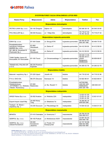 DYSTRYBUTORZY OLEJU OPAŁOWEGO LOTOS RED Nazwa Firmy Miejscowość Adres Województwo Telefon Fax Województwo dolnośląskie PETRO-LAWA Sp. z o.o. 55-140 Żmigród Dębno 1A dolnośląskie 65 546 39 18 65 545 30 80 PHU MULLER Sp.J. 58-530 Kowary ul. 1 Maja 82a dolnośląskie 75 718 27 32; 75 761 35 34 75 718 27 32 Województwo kujawsko-pomorskie ESKA Sp. z o.o. Przedsiebiorstwo Handlowo-Usługowe MARES Sp. z o.o. SP- BIS M. Smoliński R. Piotrowski Sp.J. 87-340 Osiek ul. Strzygi 87/6 kujawsko-pomorskie 56 494 80 93; 600 267 496 56 494 70 00 87-800 Włocławek ul. Zielna 47 kujawsko-pomorskie 54 412 59 00 54 412 58 03 87-800 Włocławek ul. Zielna 47 kujawsko-pomorskie 54 412 58 00 54 412 58 03 ul. Chrzanowskiego 11 kujawsko-pomorskie 56 648 13 48; 56 645 39 41; odział Bydgoszcz 605822220 56 659 98 87 kujawsko-pomorskie 54 265 53 79 54 265 53 79 TANK Spółka Jawna W. Konczalski, M. Konczalski 87-100 Toruń TRANS-KOL PALIWA SP. Z O.O. 88-230 Piotrków Kujawski Województwo łódzkie Batorski i wspólnicy Sp.J. 97-225 Ujazd Józefin 40 łódzkie 44 719 22 40 44 719 33 36 P.H.U. EKO-OIL 98-270 Złoczew Kamasze 14 łódzkie 43 822 86 61 43 822 86 61 łódzkie 447381096; 446 835 400; 668822630; 605 325 169 446 835 431 12 631 61 61 Przedsiębiorstwo Wielobranżowe 97-500 „WTÓRMEX” S.J. Elżbieta Radomsko i Marek Rochowscy ul. Św. Rozalii 11 Województwo małopolskie ARGE Paliwa Sp z o.o. 30-552 Kraków ul. Wielicka 22A małopolskie 12 631 61 00; 12 631 61 24; 12 631 61 50 Export-Import Józef Maj 34-400 Nowy Targ ul. Składowa 7a małopolskie 18 264 80 19 609 820 296 Tankpol - R. Mosio i wspólnicy Sp. J. 33-230 Szczucin ul. Piłsudskiego 54 małopolskie 14 644 02 22 Województwo mazowieckie BENZOL 07-410 Ostrołęka ul. Graniczna 7 mazowieckie 29 760 35 35; 500 065 913 GERPOL Sp. z o.o. 06-100 Pułtusk ul. Mickiewicza 45/51 mazowieckie 23 691 92 20; 600 946 736 GERPOL Sp. z o.o. oddział Konstancin 05-520 KonstancinJeziorna ul. Prosta 121 Kawęczynek mazowieckie 22 727 55 98; 668 843 966; 602 630 360 14 644 01 54 GERPOL Sp. z o.o., oddział Drobin 09-210 Drobin Warszewka mazowieckie 23 679 19 29; 24 260 11 39; 604 997 576 PETROENERGIA Sprzedaż Paliw Sławomir Zaręba 05-110 Jabłonna ul. Chotomowska 51 mazowieckie 22 782 40 90 22 782 57 90 PETROLIS Sp. z o.o. 26-670 Pionki Kieszek 52 mazowieckie 48 384 80 24 48 384 80 24 07-200 Wyszków ul. Serocka 11a mazowieckie 29 74 24 396 29 74 30 281 06-420 GołyminOśrodek mazowieckie 602 246 491 23 671 60 01 Przedsiębiorstwo Budowlano- Handlowe "Z. Niziński" Stacja Paliw Waldemar Krzysztof Cejmer ul. Szosa Ciechanowska 4 Województwo podlaskie Przedsiębiorstwo Handlowo- Sprzętowe Budownictwa "Transbud Ełk" Przedsiębiorstwo Handlowo- Sprzętowe Budownictwa "Transbud Ełk" PTHU Pryma 1 Hanna Gosk 16-500 Sejny ul. Łąkowa 5 podlaskie 87 516 34 34 87 516 34 34 16-400 Suwałki ul. Północna 27 podlaskie 87 667 59 79 87 667 59 79 18-400 Łomża Al. Legionów 141 D podlaskie 86 218 21 47; 86 218 55 53 86 218 55 53 Województwo pomorskie 82-500 Kwidzyn Rozpędziny 1D pomorskie 55 262 86 60; 55 262 93 96; 602 68 48 18 83-110 Tczew Czatkowy 21a pomorskie 58 531 24 43; 607 985 000 58 531 24 43 wew. 26 83-420 Liniewo ul. Łąkowa 1 pomorskie 58 687 82 03; 695 582 715 58 687 82 04 Hurtownia Paliw i Olejów KORIM-OIL 89-600 Chojnice Karolewo 20 pomorskie 52 397 43 30; 606 408 798; 662 208 761 OKTAN Brzeski Grzenkowicz Sp. z o.o. 76-200 Słupsk Boh. Westerplatte 7 pomorskie 59 811 34 78; 58 684 51 21 PHU Malnaft Sp. z o.o. 82-200 Malbork ul. Łąkowa 1 pomorskie 55 272 22 60; 55 272 87 64 Duet Kwidzyn Sp.J. DYSTRYBUCJA PALIW Sp. z o.o. Firma UsługowoHandlowa "Maja" Jacek Knitter 58 811 34 77 Województwo śląskie BEMAR Sp. z o.o. 44-101 Gliwice ul. Świętokrzyska 2 śląskie 32 231 50 40 32 231 78 36 EKO-AGB P.H.U. 44-230 CzerwionkaLeszczyny ul. Szyb Zachodni 8 śląskie 32 431 85 46 Zakład UsługowoHandlowy " Mixpol" Michulec Paweł 34-325 Łodygowice ul. Kasztanowa 33 śląskie 33 863 39 56 33 863 39 56 Województwo świętokrzyskie ARON Sp. z o.o. 25-852 Kielce ul. Chorzowska 22 świętokrzyskie 41 346 83 10; 604 605 757 41 346 53 60 REGESTA S.A. 28-400 Pińczów ul. 3- go Maja 40 świętokrzyskie 41 357 22 79 41 357 50 03 2 Województwo warmińsko-mazurskie FALCO Mazurkiewicz, Gwiazda, Sp.j. Przedsiębiorstwo Handlowo- Sprzętowe Budownictwa "Transbud Ełk" Przedsiębiorstwo Handlowo- Sprzętowe Budownictwa "Transbud Ełk" Przedsiębiorstwo Handlowo- Sprzętowe Budownictwa "Transbud Ełk" Przedsiębiorstwo Handlowo- UsługoweStacja Paliw" Duet" Tracom Sp. z o.o. 10-602 Olsztyn, Barczewo Terminal Paliw Łęgajny k/ Barczewa warmińskomazurskie 89 514 45 26; 89 514 86 00 89 514 45 26 12-200 Pisz ul. Wojska Polskiego 35 warmińskomazurskie 87 423 45 12 87 423 45 12 19-300 Ełk ul. Łukasiewicza 1 warmińskomazurskie 87 621 74 23 87 621 60 77 19-400 Olecko ul. Wojska Polskiego 9 warmińskomazurskie 87 520 14 37 87 520 14 37 14-200 Iława ul. Lubawska 5 warmińskomazurskie 89 648 32 25 605 565 590 89 648 41 76 11-700 Mrągowo ul. Przemysłowa 11 warmińskomazurskie 89 741 07 50; 89 741 07 80 Województwo wielkopolskie "HAWA" Sp. z o.o. 62-200 Gniezno ul. Grunwaldzka 4 wielkopolskie 61 425 96 98 61 424 51 09 MAC- BENZ Zenon i Maciej Kłaczkiewicz Sp.J. 64-500 Szamotuły ul. Lipowa wielkopolskie 61 292 70 37; 61 292 35 41 61 292 78 51 Petrol- Hawen Sp.J. 64-920 Piła ul. Dąbrowskiego 8 wielkopolskie 67 215 11 59 67 215 11 62 T&J Spółka Jawna Tyrakowski, Jachnik 63-220 Kotlin ul. Ks. Rymarkiewicza 1D wielkopolskie 62 740 56 83; 603 646 544 62 740 55 63 TEXOL Milewski, zakrzewski Sp.J. 62-020 Swarzędz ul. Rabowicka 2 wielkopolskie 61 817 22 80 61 817 22 80 62-600 Koło ul. Toruńska 186 wielkopolskie 63 261 60 50; 601 180 865 63 261 66 58 62-610 Sompolno ul.Warszawska 58 wielkopolskie 63 271 42 27; 63 261 42 75 63 271 42 27 94 347 18 71; 94 347 18 72; 800 157 001 94 347 18 59 TRANS-KOL PALIWA SP. Z O.O. Zakład UsługowoHandlowy " Naftohurt" Jerz