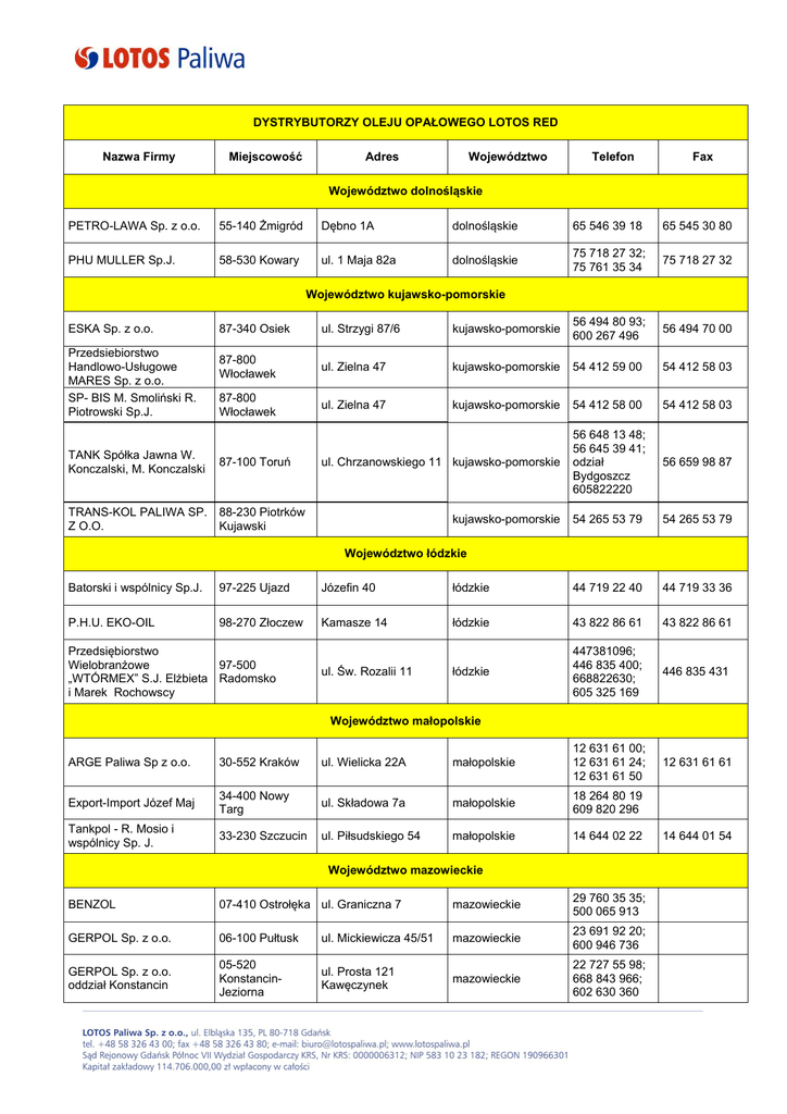 DYSTRYBUTORZY OLEJU OPAŁOWEGO LOTOS RED Nazwa