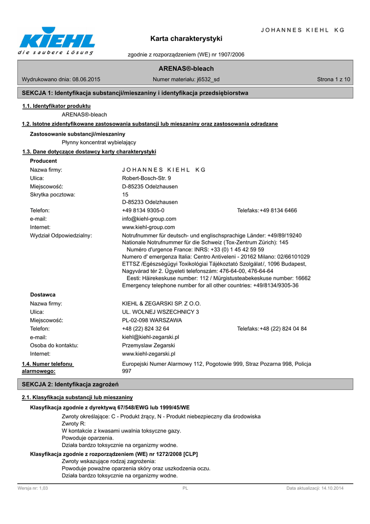 JOHANNES KIEHL KG Karta charakterystyki zgodnie z rozporządzeniem (WE) nr 1907/2006 ARENAS®-bleach Wydrukowano dnia: 08.06.2015 Strona 1 z 10 Numer materiału: j6532_sd SEKCJA 1: Identyfikacja substancji/mieszaniny i identyfikacja przedsiębiorstwa 1.1. Identyfikator produktu ARENAS®-bleach 1.2. Istotne zidentyfikowane zastosowania substancji lub mieszaniny oraz zastosowania odradzane Zastosowanie substancji/mieszaniny Płynny koncentrat wybielający 1.3. Dane dotyczące dostawcy karty charakterystyki Producent Nazwa firmy: Ulica: Miejscowość: Skrytka pocztowa: Telefon: e-mail: Internet: Wydział Odpowiedzialny: JOHANNES KIEHL Robert-Bosch-Str. 9 D-85235 Odelzhausen 15 D-85233 Odelzhausen +49 8134 9305-0 [email protected] KG Telefaks: +49 8134 6466 www.kiehl-group.com Notrufnummer für deutsch- und englischsprachige Länder: +49/89/19240 Nationale Notrufnummer für die Schweiz (Tox-Zentrum Zürich): 145 Numéro d'urgence France: INRS: +33 (0) 1 45 42 59 59 Numero d' emergenza Italia: Centro Antiveleni - 20162 Milano: 02/66101029 ETTSZ /Egészségügyi Toxikológiai Tájékoztató Szolgálat/, 1096 Budapest, Nagyvárad tér 2. Ügyeleti telefonszám: 476-64-00, 476-64-64 Eesti: Häirekeskuse number: 112 / Mürgistusteabekeskuse number: 16662 Emergency telephone number for all other countries: +49/8134/9305-36 Dostawca Nazwa firmy: Ulica: KIEHL & ZEGARSKI SP. Z O.O. UL. WOLNEJ WSZECHNICY 3 Miejscowość: PL-02-098 WARSZAWA Telefon: +48 (22) 824 32 64 e-mail: Osoba do kontaktu: [email protected] Przemyslaw Zegarski Internet: www.kiehl-zegarski.pl 1.4. Numer telefonu alarmowego: Telefaks: +48 (22) 824 04 84 Europejski Numer Alarmowy 112, Pogotowie 999, Straz Pozarna 998, Policja 997 SEKCJA 2: Identyfikacja zagrożeń 2.1. Klasyfikacja substancji lub mieszaniny Klasyfikacja zgodnie z dyrektywą 67/548/EWG lub 1999/45/WE Zwroty określające: C - Produkt żrący, N - Produkt niebezpieczny dla środowiska Zwroty R: W kontakcie z kwasami uwalnia toksyczne gazy. Powoduje oparzenia. Działa bardzo toksycznie na organizmy wodne. Klasyfikacja zgodnie z rozporządzeniem (WE) nr 1272/2008 [CLP] Zwroty wskazujące rodzaj zagrożenia: Powoduje poważne oparzenia skóry oraz uszkodzenia oczu. Działa bardzo toksycznie na organizmy wodne. Wersja nr: 1,03 PL Data aktualizacji: 14.10.2014 JOHANNES KIEHL KG Karta charakterystyki zgodnie z rozporządzeniem (WE) nr 1907/2006 ARENAS®-bleach Wydrukowano dnia: 08.06.2015 Strona 2 z 10 Numer materiału: j6532_sd 2.2. Elementy oznakowania Niebezpieczne składniki, które muszą być wymienione na etykiecie Sodium hypochlorite Hasło ostrzegawcze: Niebezpieczeństwo GHS05-GHS09 Piktogram: Zwroty wskazujące rodzaj zagrożenia H314 Powoduje poważne oparzenia skóry oraz uszkodzenia oczu. H400 Działa bardzo toksycznie na organizmy wodne. Zwroty wskazujące środki ostrożności P273 Unikać uwolnienia do środowiska. P280 Stosować rękawice ochronne/odzież ochronną/ochronę oczu/ochronę twarzy. P303+P361+P353 W PRZYPADKU KONTAKTU ZE SKÓRĄ (lub z włosami): Natychmiast zdjąć całą zanieczyszczoną odzież. Spłukać skórę pod strumieniem wody/prysznicem. P305+P351+P338 W PRZYPADKU DOSTANIA SIĘ DO OCZU: Ostrożnie płukać wodą przez kilka minut. Wyjąć soczewki kontaktowe, jeżeli są i można je łatwo usunąć. Nadal płukać. Specjalne oznakowanie niektórych preparatów EUH031 W kontakcie z kwasami uwalnia toksyczne gazy. 2.3. Inne zagrożenia Nieznane. SEKCJA 3: Skład/informacja o składnikach (zgodnie z 648/2004/EG) 3.2. Mieszaniny Charakterystyka chemiczna ustabilizowany aktywny chlor >10% Składniki niebezpieczne Nr WE Nr CAS Nr Index Nr REACH Nazwa chemiczna Ilość Klasyfikacja zgodnie z 67/548/EWG Klasyfikacja zgodnie z rozporządzeniem (WE) nr 1272/2008 [CLP] 231-668-3 Roztwór podchlorynu sodu 12% Cl aktywny 7681-52-9 C - Produkt żrący, N - Produkt niebezpieczny dla środowiska R34-31-50 017-011-00-1 Skin Corr. 1B, Aquatic Acute 1; H314 H400 EUH031 100 % Wydźwięk zwroty R, H i EUH: patrz sekcja 16. SEKCJA 4: Środki pierwszej pomocy 4.1. Opis środków pierwszej pomocy Wskazówki ogólne Przenieść na świeże powietrze w przypadku wdychania oparów. Natychmiast zdjąć skażone ubranie. W przypadku wdychania Przenieść na świeże powietrze. Jeśli objawy utrzymują się, wezwać lekarza. Wersja nr: 1,03 PL Data aktualizacji: 14.10.2014 JOHANNES KIEHL KG Karta charakterystyki zgodnie z rozporządzeniem (WE) nr 1907/2006 ARENAS®-bleach Wydrukowano dnia: 08.06.2015 Strona 3 z 10 Numer materiału: j6532_sd W przypadku kontaktu ze skórą Natychmiast zmyć mydłem z dużą ilością wody. Natychmiast zdjąć skażone ubranie. Konieczna natychmiastowa pomoc medyczna w przypadku kiedy nieopatrzone uszkodzenia skóry tworzą trudno gojące się rany. W przypadku kontaktu z oczami Płukać starannie dużą ilością wody, również pod powiekami. Zasięgnąć porady medycznej. W przypadku połknięcia Przemyć usta wodą i następnie wypić dużą ilość wody. Jeśli to możliwe nie dopuścić do wymiotów. Natychmiast powiadomić lekarza. 4.2. Najważniejsze ostre i opóźnione objawy oraz skutki narażenia Informacje te nie są dostępne. 4.3. Wskazania dotyczące wszelkiej natychmiastowej pomocy lekarskiej i szczególnego postępowania z poszkodowanym Przedstawić lekarzowi dołączoną Kartę Charakterystyki Substancji Niebezpiecznej. SEKCJA 5: Postępowanie w przypadku pożaru 5.1. Środki gaśnicze Odpowiednie środki gaśnicze Woda Dwutlenek węgla (CO2) 5.2. Szczególne zagrożenia związane z substancją lub mieszaniną Chlor 5.3. Informacje dla straży pożarnej W razie pożaru, założyć aparat oddechowy z zamkniętym obiegiem powietrza. Informacja uzupełniająca Użycie środków gaśniczych odpowiednich dla lokalnych warunków i dla środowiska. SEKCJA 6: Postępowanie w przypadku niezamierzonego uwolnienia do środowiska 6.1. Indywidualne środki ostrożności, wyposażenie ochronne i procedury w sytuacjach awaryjnyc