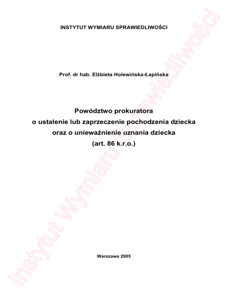 ci ied liw o INSTYTUT WYMIARU SPRAWIEDLIWO CI raw Prof. dr hab. El bieta Holewi ska- api ska Powództwo prokuratora Sp o ustalenie lub zaprzeczenie pochodzenia dziecka oraz o uniewa nienie uznania dziecka Ins tyt ut W ym i aru (art. 86 k.r.o.) Warszawa 2005 ci Spis tre ci Uwagi wst pne ..................................................................................................... 1 liw o I. II. Rola prokuratora w post powaniu cywilnym w aspekcie jego powództwa z art. 86 k.r.o. ..................................................................................................................... 6 1. Charakter uprawnie prokuratora w sprawach niemaj tkowych z zakresu prawa rodzinnego .......................................................................................... 6 ied 1.1. Podstawy powództwa prokuratora z art. 86 k.r.o. .................................. 7 1.2. Suwerenno decyzji prokuratora o wniesieniu powództwa z art. 86 k.r.o. .................................................................................................... 10 2. Samoistny charakter uprawnie prokuratora z art. 86 k.r.o.......................... 18 raw III. Stosowanie art. 86 k.r.o. w praktyce prokuratur dzia aj cych w obszarze ciwo ci Prokuratury Okr gowej w Warszawie ............................................. 22 1. Liczba i rodzaj spraw ................................................................................... 22 2. Sprawy o zaprzeczenie ma skiego pochodzenia dziecka....................... 23 Sp 2.1. Ogólne informacje o roli prokuratora w sprawach o zaprzeczenie ma skiego pochodzenia dziecka .................................................... 23 2.2. Powództwo prokuratora o zaprzeczenie pochodzenia dziecka z ma stwa.......................................................................................... 24 3. Sprawy o uniewa nienie uznania dziecka.................................................... 28 aru 3.1. Odmowa wytoczenia powództwa o uniewa nienie uznania ................ 29 3.2. Powództwa wniesione przez prokuratorów o uniewa nienie uznania dziecka ................................................................................................ 30 4. Sprawy o ustalenie i zaprzeczenie macierzy stwa ...................................... 34 ym i 4.1. Sprawa o ustalenie macierzy stwa ..................................................... 34 4.2. Sprawy o zaprzeczenie macierzy stwa ............................................... 35 4.2.1. Odmowa wniesienia przez prokuratora powództwa o zaprzeczenie macierzy stwa .................................................... 36 ut W 4.2.2. Powództwo prokuratora o zaprzeczenie macierzy stwa........... 40 5. Sprawy o s dowe ustalenie ojcostwa .......................................................... 41 Ins tyt IV. Uwagi dotycz ce praktyki stosowania art. 86 k.r.o. w przedstawionych sprawach............................................................................................................ 44 ci Uwagi wst pne Aktualny stan i kwestionowanie prawny w pochodzenia zakresie dziecka powództwa od liw o I. prokuratora rodziców jest o efektem ustalenie ewolucji orzecznictwa S du Najwy szego i pogl dów doktryny po drugiej wojnie wiatowej. odgrywa istotn rol ied Udzia prokuratora w polskim post powaniu cywilnym zacz pocz wszy od wej cia w ycie, w dniu 1 stycznia 1951 r., ustawy z dnia 20 lipca 1950 r. o zmianie przepisów post powania w sprawach cywilnych. Wskazana ustawa raw wprowadzi a zasad badania prawdy materialnej jako jedn z naczelnych zasad tego post powania. Ograniczy a dzia anie tradycyjnie rozumianej zasady dyspozycyjno ci. W 1950 r. nast pi y tak e istotne zmiany dotycz ce prokuratury1. Bardzo donios a rola prokuratora w post powaniu cywilnym zosta a ugruntowana Sp w kodeksie post powania cywilnego z dnia 17 listopada 1964 r. W art. 7 tego kodeksu zosta o przes dzone, e prokurator mo e post powania w ka dej sprawie, jak równie wzi da wszcz cia udzia w ka dym tocz cym si ju aru post powaniu, jednak e w sprawach niemaj tkowych z zakresu prawa rodzinnego mo e wytacza powództwa tylko w wypadkach wskazanych w ustawie. Powództwo o ustalenie lub zaprzeczenie pochodzenia dziecka oraz o uniewa nienie ym i uznania dziecka, zgodnie z art. 86 k.r.o., mo e wytoczy tak e prokurator. Przewa a opinia, e w tych sprawach legitymacja prokuratora ma charakter materialnoprawny. Ma ona s ochronie szczególnie donios ego interesu jednostki, jakim jest 1 ut W ustalenie pochodzenia od rodziców zgodnie z pochodzeniem genetycznym. Ins tyt Prokuratura zosta a wyodr bniona z resortu sprawiedliwo ci. Powo ano urz d Prokuratora Generalnego. Zgodnie z art. 2 ustawy z dnia 20 lipca 1950 r., Dz.U. Nr 38, poz. 346 „Generalny Prokurator Rzeczypospolitej i jego organy stanowi Prokuratur Rzeczypospolitej Polskiej”. Art. 1 ustawy stanowi , e „W celu ugruntowania praworz dno ci ludowej, ochrony mienia spo ecznego i cigania przest pstw tworzy si urz d Generalnego Prokuratora Rzeczypospolitej”. Rozwi zania prawne dotycz ce udzia u prokuratora w post powaniu cywilnym by y wzorowane na unormowaniach i praktyce radzieckiej. Nie zosta a przes dzona pozycja procesowa prokuratora. Zob. na ten temat J. Jod owski: Nowe drogi polskiego procesu cywilnego, NP nr 6 i nr 7-8 z 1951 r. W syntetycznej formie rozwój instytucji udzia u prokuratora w post powaniu cywilnym w okresie poprzedzaj cym wej cie w ycie kodeksu post powania cywilnego z 1964 r. i nowej ustawy „O Prokuraturze PRL” z dnia 14 kwietnia 1967 r., Dz.U. Nr 13, poz. 55, przedstawi W. Masewicz: Prokurator w post powaniu cywilnym, Warszawa 1975, s. 14-25. ci Najcz ciej prokurator korzysta ze swego uprawnienia w sytuacji, gdy osoba e si liw o bezpo rednio, osobi cie zainteresowana nie mo e tego uczyni . Z regu y wi to z wyga ni ciem uprawnienia do kwestionowania w asnego stanu cywilnego przez osob bezpo rednio i osobi cie zainteresowan wynikiem sprawy. Krótkie zawite terminy do zaprzeczenia ojcostwa i uniew