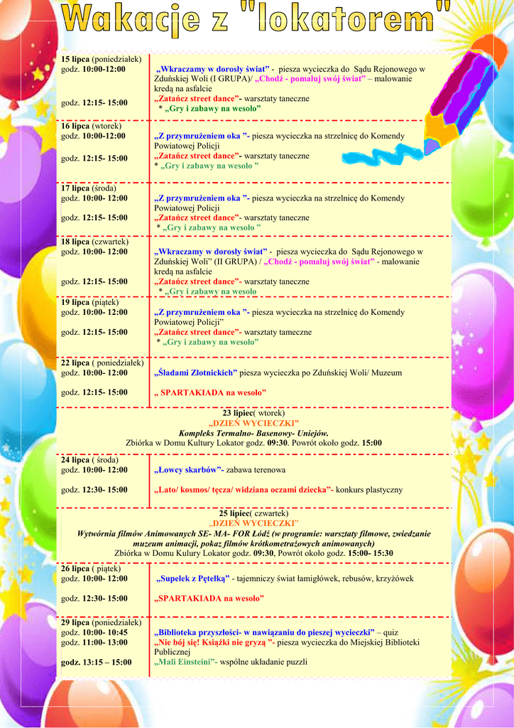 15 lipca (poniedziałek) godz. 10:00-12:00 godz. 12:15- 15:00 16 lipca (wtorek) godz. 10:00-12:00 godz. 12:15- 15:00 17 lipca (środa) godz. 10:00- 12:00 godz. 12:15- 15:00 18 lipca (czwartek) godz. 10:00- 12:00 godz. 12:15- 15:00 19 lipca (piątek) godz. 10:00- 12:00 godz. 12:15- 15:00 „Wkraczamy w dorosły świat” - piesza wycieczka do Sądu Rejonowego w Zduńskiej Woli (I GRUPA)/ „Chodź - pomaluj swój świat” – malowanie kredą na asfalcie „Zatańcz street dance”- warsztaty taneczne * „Gry i zabawy na wesoło” „Z przymrużeniem oka ”- piesza wycieczka na strzelnicę do Komendy Powiatowej Policji „Zatańcz street dance”- warsztaty taneczne * „Gry i zabawy na wesoło ” „Z przymrużeniem oka ”- piesza wycieczka na strzelnicę do Komendy Powiatowej Policji „Zatańcz street dance”- warsztaty taneczne * „Gry i zabawy na wesoło ” „Wkraczamy w dorosły świat” - piesza wycieczka do Sądu Rejonowego w Zduńskiej Woli” (II GRUPA) / „Chodź - pomaluj swój świat” - malowanie kredą na asfalcie „Zatańcz street dance”- warsztaty taneczne * „Gry i zabawy na wesoło „Z przymrużeniem oka ”- piesza wycieczka na strzelnicę do Komendy Powiatowej Policji” „Zatańcz street dance”- warsztaty tameczne * „Gry i zabawy na wesoło” 22 lipca ( poniedziałek) godz. 10:00- 12:00 „Śladami Złotnickich” piesza wycieczka po Zduńskiej Woli/ Muzeum godz. 12:15- 15:00 „ SPARTAKIADA na wesoło” 23 lipiec( wtorek) „DZIEŃ WYCIECZKI” Kompleks Termalno- Basenowy- Uniejów. Zbiórka w Domu Kultury Lokator godz. 09:30. Powrót około godz. 15:00 24 lipca ( środa) godz. 10:00- 12:00 „Łowcy skarbów”- zabawa terenowa godz. 12:30- 15:00 „Lato/ kosmos/ tęcza/ widziana oczami dziecka”- konkurs plastyczny 25 lipiec( czwartek) „DZIEŃ WYCIECZKI” Wytwórnia filmów Animowanych SE- MA- FOR Łódź (w programie: warsztaty filmowe, zwiedzanie muzeum animacji, pokaz filmów krótkometrażowych animowanych) Zbiórka w Domu Kulury Lokator godz. 09:30, Powrót około godz. 15:00- 15:30 26 lipca ( piątek) godz. 10:00- 12:00 „Supełek z Pętelką” - tajemniczy świat łamigłówek, rebusów, krzyżówek godz. 12:30- 15:00 „SPARTAKIADA na wesoło” 29 lipca (poniedziałek) godz. 10:00- 10:45 godz. 11:00- 13:00 godz. 13:15 – 15:00 „Biblioteka przyszłości- w nawiązaniu do pieszej wycieczki” – quiz „Nie bój się! Książki nie gryzą ”- piesza wycieczka do Miejskiej Biblioteki Publicznej „Mali Einsteini”- wspólne układanie puzzli 30 lipiec( wtorek) „DZIEŃ WYCIECZKI” Kino Orange ”IMAX” (w programie: film w 3D, wykłady, warsztaty edukacyjne o tematyce przyrodniczej) Zbiórka w Domu Kultury Lokator o godz. 08: 00 Powrót około godz. 14:00- 14:30 31 lipca ( środa) godz. 10:00- 12:00 „DZIEŃ WYCIECZKI”- „Skansen Lokomotyw” - Karsznice godz. 12:30- 15:00 ” Czy znam swoje miasto…?” – konkurs plastyczny organizowany w muzeum * „Gry i zabawy na wesoło” 1 sierpień( czwartek) „DZIEŃ WYCIECZKI” Stajnia Harnulka- Wydrzyn (w programie: ognisko, przejażdżka wierzchem na koniu, konkursy, gry i zabawy w plenerze) Zbiórka w Domu Kultury Lokator o godz. 09:30. Powrót około godz. 14:30- 15:00 2 sierpnia (piątek) godz. 10:00- 13:00 „Wakacyjna Szkółka Tenisa Ziemnego” * „Gry i zabawy na wesoło” godz. 13:30- 15:00 „Przygotowania do dnia indiańskiego” 5 sierpnia (poniedziałek) godz. 10:00- 13:00 godz. 13:30- 15:00 „Wakacyjna Szkółka Tenisa Ziemnego” * „Gry i zabawy na wesoło” „DZIEŃ INDIAŃSKI”- zabawy rekreacyjno- obyczajowe 6 sierpień(wtorek) „DZIEŃ WYCIECZKI” Aquapark „Fala”- Łódź Zbiórka w Domu Kultury Lokator o godz. 09:15. Powrót około godz. 15:00- 15:30 7 sierpnia ( środa) godz. 10:00- 10:30 godz. 11:00 – 13:00 godz. 13:30- 15:30 8 sierpnia (czwartek) godz. 10:00- 13:00 godz. 13:30- 15:00 „Nie taki urzędnik straszny”- Z czym kojarzy Ci się Urząd?- pogadanka „Wkraczamy w dorosły świat…” piesza wycieczka do Urzędu Miasta w Zduńskiej Woli „Gry i zabawy na wesoło” „Wakacyjna Szkółka Tenisa Ziemnego” * ”Gry i zabawy na wesoło” „Wakacje moich marzeń”- konkurs plastyczny” 9 sierpień( piątek) „DZIEŃ WYCIECZKI” Nadleśnictwo Poddębice, Leśnictwo Rodrysin ( w programie: ognisko z kiełbasami, naśladowanie leśnych mieszkańców, poszukiwanie i rozpoznawanie zwierzęcych śladów, gry i zabawy plenerowe ) Zbiórka w Domu Kultury Lokator godz. 09:30. Powrót około godz. 14:30- 15:00 12sierpnia (poniedziałek) „Wakacyjna Szkółka Tenisa Ziemnego godz. 10:00- 13:00 * „Gry i zabawy na wesoło” „Wkraczamy w dorosły świat…”piesza wycieczka do Starostwa Powiatowego w godz. 13:30- 15:00 Zduńskiej Woli 13 sierpień( wtorek) „DZIEŃ WYCIECZKI” Muzeum Archeologiczne w Biskupinie( w programie: warsztaty edukacyjne(dzieje pieniądza, lepienie garnków; rejs statkiem po Jeziorze Biskupińskim, obiad) Zbiórka w Domu Kultury Lokator o godz. 07:00. Powrót około godz. 19:00- 20:00. 14 sierpnia (środa) godz. 10:00- 13:00 „Wakacyjna Szkółka Tenisa Ziemnego” * „Gry i zabawy na wesoło” godz. 13:30- 15:00 „Śpiewać każdy może”- karaoke dla dzieci UWAGA! Na zajęcia taneczne i tenisa ziemnego obowiązuje: strój sportowy wraz z butami na płaskiej podeszwie. • Organizator zastrzega sobie prawo do zmian w programie zajęć.
