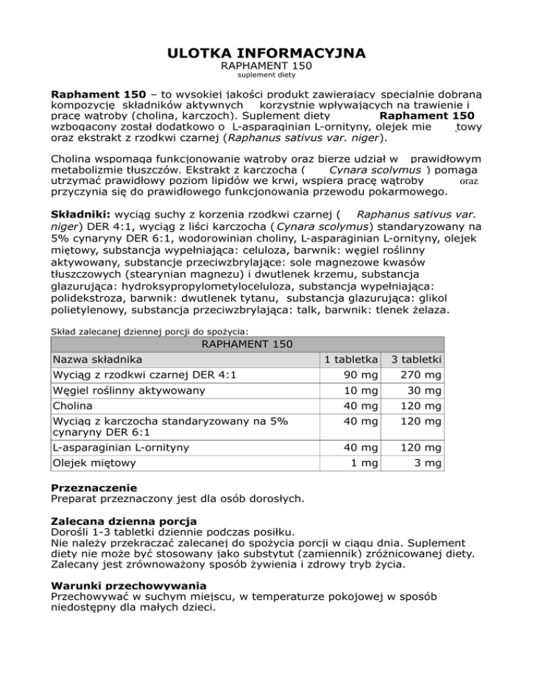 ULOTKA INFORMACYJNA RAPHAMENT 150 suplement diety Raphament 150 – to wysokiej jakości produkt zawierający specjalnie dobraną kompozycję składników aktywnych korzystnie wpływających na trawienie i pracę wątroby (cholina, karczoch). Suplement diety Raphament 150 wzbogacony został dodatkowo o L-asparaginian L-ornityny, olejek mie ̨towy oraz ekstrakt z rzodkwi czarnej (Raphanus sativus var. niger). Cholina wspomaga funkcjonowanie wątroby oraz bierze udział w prawidłowym metabolizmie tłuszczów. Ekstrakt z karczocha ( Cynara scolymus ) pomaga utrzymać prawidłowy poziom lipidów we krwi, wspiera pracę wątroby oraz przyczynia się do prawidłowego funkcjonowania przewodu pokarmowego. Składniki: wyciąg suchy z korzenia rzodkwi czarnej ( Raphanus sativus var. niger) DER 4:1, wyciąg z liści karczocha ( Cynara scolymus) standaryzowany na 5% cynaryny DER 6:1, wodorowinian choliny, L-asparaginian L-ornityny, olejek miętowy, substancja wypełniająca: celuloza, barwnik: węgiel roślinny aktywowany, substancje przeciwzbrylające: sole magnezowe kwasów tłuszczowych (stearynian magnezu) i dwutlenek krzemu, substancja glazurująca: hydroksypropylometyloceluloza, substancja wypełniająca: polidekstroza, barwnik: dwutlenek tytanu, substancja glazurująca: glikol polietylenowy, substancja przeciwzbrylająca: talk, barwnik: tlenek żelaza. Skład zalecanej dziennej porcji do spożycia: RAPHAMENT 150 Nazwa składnika 1 tabletka 3 tabletki Wyciąg z rzodkwi czarnej DER 4:1 90 mg 270 mg Węgiel roślinny aktywowany 10 mg 30 mg Cholina 40 mg 120 mg Wyciąg z karczocha standaryzowany na 5% cynaryny DER 6:1 40 mg 120 mg L-asparaginian L-ornityny 40 mg 120 mg 1 mg 3 mg Olejek miętowy Przeznaczenie Preparat przeznaczony jest dla osób dorosłych. Zalecana dzienna porcja Dorośli 1-3 tabletki dziennie podczas posiłku. Nie należy przekraczać zalecanej do spożycia porcji w ciągu dnia. Suplement diety nie może być stosowany jako substytut (zamiennik) zróżnicowanej diety. Zalecany jest zrównoważony sposób żywienia i zdrowy tryb życia. Warunki przechowywania Przechowywać w suchym miejscu, w temperaturze pokojowej w sposób niedostępny dla małych dzieci. Najlepiej spożyć przed końcem: Numer partii produkcyjnej: Masa netto: 14,1g. Opakowanie zawiera 30 tabletek powlekanych po 470mg. Producent: ALG Pharma Poland Sp. z o.o. ul. Ciołka 17 01-445 Warszawa KRS 0000514068
