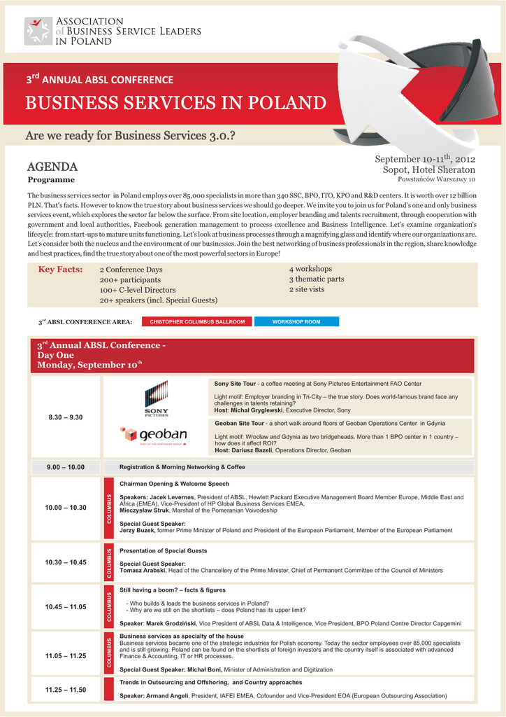 L CONFERENCE 3rd ANNUAL ABSL CONFERENCE BUSINESS SERVICES IN POLAND Are we ready for Business Services 3.0.? September 10-11th, 2012 Sopot, Hotel Sheraton AGENDA Powstańców Warszawy 10 Programme The business services sector in Poland employs over 85,000 specialists in more than 340 SSC, BPO, ITO, KPO and R&D centers. It is worth over 12 billion PLN. That's facts. However to know the true story about business services we should go deeper. We invite you to join us for Poland’s one and only business services event, which explores the sector far below the surface. From site location, employer branding and talents recruitment, through cooperation with government and local authorities, Facebook generation management to process excellence and Business Intelligence. Let's examine organization's lifecycle: from start-ups to mature units functioning. Let's look at business processes through a magnifying glass and identify where our organizations are. Let's consider both the nucleus and the environment of our businesses. Join the best networking of business professionals in the region, share knowledge and best practices, find the true story about one of the most powerful sectors in Europe! Key Facts: 2 Conference Days 200+ participants 100+ C-level Directors 20+ speakers (incl. Special Guests) 3rd ABSL CONFERENCE AREA: CHISTOPHER COLUMBUS BALLROOM 4 workshops 3 thematic parts 2 site vists WORKSHOP ROOM rd 3 Annual ABSL Conference Day One th Monday, September 10 Sony Site Tour - a coffee meeting at Sony Pictures Entertainment FAO Center Light motif: Employer branding in Tri-City – the true story. Does world-famous brand face any challenges in talents retaining? Host: Michał Gryglewski, Executive Director, Sony 8.30 – 9.30 Geoban Site Tour - a short walk around floors of Geoban Operations Center in Gdynia Light motif: Wrocław and Gdynia as two bridgeheads. More than 1 BPO center in 1 country – how does it affect ROI? Host: Dariusz Bazeli, Operations Director, Geoban 9.00 – 10.00 Registration & Morning Networking & Coffee 10.45 – 11.05 11.05 – 11.25 COLUMBUS Presentation of Special Guests COLUMBUS 10.30 – 10.45 Speakers: Jacek Levernes, President of ABSL, Hewlett Packard Executive Management Board Member Europe, Middle East and Africa (EMEA), Vice-President of HP Global Business Services EMEA, Mieczysław Struk, Marshal of the Pomeranian Voivodeship COLUMBUS 10.00 – 10.30 COLUMBUS Chairman Opening & Welcome Speech Special Guest Speaker: Jerzy Buzek, former Prime Minister of Poland and President of the European Parliament, Member of the European Parliament Special Guest Speaker: Tomasz Arabski, Head of the Chancellery of the Prime Minister, Chief of Permanent Committee of the Council of Ministers Still having a boom? – facts & figures - Who builds & leads the business services in Poland? - Why are we still on the shortlists – does Poland has its upper limit? Speaker: Marek Grodziński, Vice President of ABSL Data & Intelligence, Vice President, BPO Poland Centre Director Capgemini Business services as specialty of the house Business services became one of the strategic industries for Polish economy. Today the sector employees over 85,000 specialists and is still growing. Poland can be found on the shortlists of foreign investors and the country itself is associated with advanced Finance & Accounting, IT or HR processes. Special Guest Speaker: Michał Boni, Minister of Administration and Digitization Trends in Outsourcing and Offshoring, and Country approaches 11.25 – 11.50 Speaker: Armand Angeli, President, IAFEI EMEA, Cofounder and Vice-President EOA (European Outsourcing Association) Business Services 1.0. – The True Story 12.00 – 12.30 COLUMBUS 11.50 – 12.00 COLUMBUS Panel Discussions with Matter-of-Fact Case studies Location & Resources & Incentives 12.30 – 13.30 Case studies part 1: Presentation of Main Conference Partner - Invest in Pomerania Panel discussion: Case studies part 2 - Concept and the reality of setting up a business service center – how to make a right decision? How to go about avoiding pitfalls? Key criteria & key differentiators. Shortfalls & Challenges Moderator: Antony Roberts-York, Vice President of ABSL Knowledge Sharing, CEO UBS Poland Service Centre Panelists: Przemysław Berendt, VP Global Marketing Luxoft, Raimo Kesti, Managing Director Poland at Geoban, Marek Łyżwa, Member of the Board, Polish Information and Foreign Investment Agency, Agnieszka Orłowska, Managing Director HP Wrocław Global Business Center Wojciech Skrudlik, Center Head, MAN Accounting Center Networking Lunch 13.30 – 14.00 COLUMBUS Panel discussion: Case studies part 3 – Massive recruitment - Is it possible to recruit large numbers and sustain quality in selection? - Practical experiences in various domains – truths & myths, challenges and pitfalls. Moderators: Agata Piątek, Branch Manager, HAYS Panelists: Marta Aserigadu, Business Services Delivery Manager, Hays Specialist Recruitment Representatives of ITO and BPO Business Services with massive recruitment experience 14.00 – 14.40 COLUMBUS Panel discussion: Aligning city value proposition to Business 14.40 – 15.00 - Attracting new investors "Soft criteria" vs. "Hard figures" - Serving new investors: one stop shop in the city - Cooperating with new investors: information and networking Moderator: Michał Kobosko - Editor-in-chief, Wprost Panelists: Teresa Kamińska - the President of the Management Board of PSSE Ltd Paweł Adamowicz - President of Gdańsk City, Rafał Bruski - President of Bydgoszcz City, Ryszard Grobelny - President of Poznań City, Andrzej Kosztowniak - President of Radom City, Krzysztof Żuk - President of Lublin City Marcin Krupa, Vice President of Katowice City, Afternoon Networking & Coffee Business Services 2.0. - Accelerate and differentiate Transform the process and eliminate waste - “One-size-fits-all approach" or sewing dedicated solutions for business services organizatio