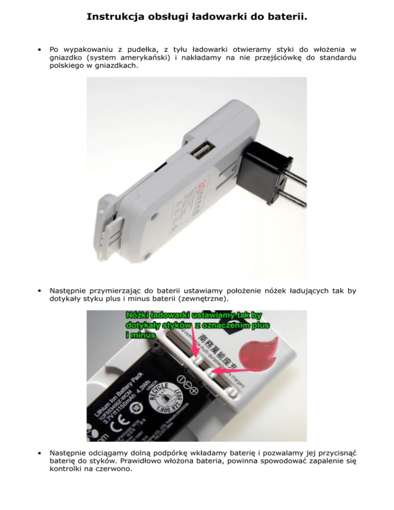 Instrukcja obsługi ładowarki do baterii. • Po wypakowaniu z pudełka, z tyłu ładowarki otwieramy styki do włożenia w gniazdko (system amerykański) i nakładamy na nie przejściówkę do standardu polskiego w gniazdkach. • Następnie przymierzając do baterii ustawiamy położenie nóżek ładujących tak by dotykały styku plus i minus baterii (zewnętrzne). • Następnie odciągamy dolną podpórkę wkładamy baterię i pozwalamy jej przycisnąć baterię do styków. Prawidłowo włożona bateria, powinna spowodować zapalenie się kontrolki na czerwono. • Po włożeniu ładowarki z baterią do gniazdka, kontrolka zmienia kolor na niebieskawy. Po naładowaniu, zapali się znów na czerwono. Ładowarka poprzez przejściówkę przystosowana jest do pracy z napięciem 220V. Ładowarka objęta jest sześcio-miesięczną gwarancją.