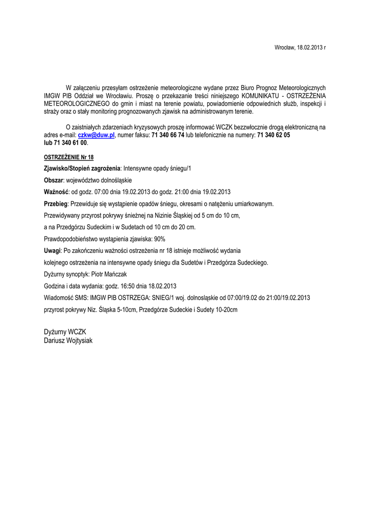 Wrocław, 18.02.2013 r W załączeniu przesyłam ostrzeżenie meteorologiczne wydane przez Biuro Prognoz Meteorologicznych IMGW PIB Oddział we Wrocławiu. Proszę o przekazanie treści niniejszego KOMUNIKATU - OSTRZEŻENIA METEOROLOGICZNEGO do gmin i miast na terenie powiatu, powiadomienie odpowiednich służb, inspekcji i straży oraz o stały monitoring prognozowanych zjawisk na administrowanym terenie. O zaistniałych zdarzeniach kryzysowych proszę informować WCZK bezzwłocznie drogą elektroniczną na adres e-mail: [email protected], numer faksu: 71 340 66 74 lub telefonicznie na numery: 71 340 62 05 lub 71 340 61 00. OSTRZEŻENIE Nr 18 Zjawisko/Stopień zagrożenia: Intensywne opady śniegu/1 Obszar: województwo dolnośląskie Ważność: od godz. 07:00 dnia 19.02.2013 do godz. 21:00 dnia 19.02.2013 Przebieg: Przewiduje się wystąpienie opadów śniegu, okresami o natężeniu umiarkowanym. Przewidywany przyrost pokrywy śnieżnej na Nizinie Śląskiej od 5 cm do 10 cm, a na Przedgórzu Sudeckim i w Sudetach od 10 cm do 20 cm. Prawdopodobieństwo wystąpienia zjawiska: 90% Uwagi: Po zakończeniu ważności ostrzeżenia nr 18 istnieje możliwość wydania kolejnego ostrzeżenia na intensywne opady śniegu dla Sudetów i Przedgórza Sudeckiego. Dyżurny synoptyk: Piotr Mańczak Godzina i data wydania: godz. 16:50 dnia 18.02.2013 Wiadomość SMS: IMGW PIB OSTRZEGA: SNIEG/1 woj. dolnosląskie od 07:00/19.02 do 21:00/19.02.2013 przyrost pokrywy Niz. Śląska 5-10cm, Przedgórze Sudeckie i Sudety 10-20cm Dyżurny WCZK Dariusz Wojtysiak