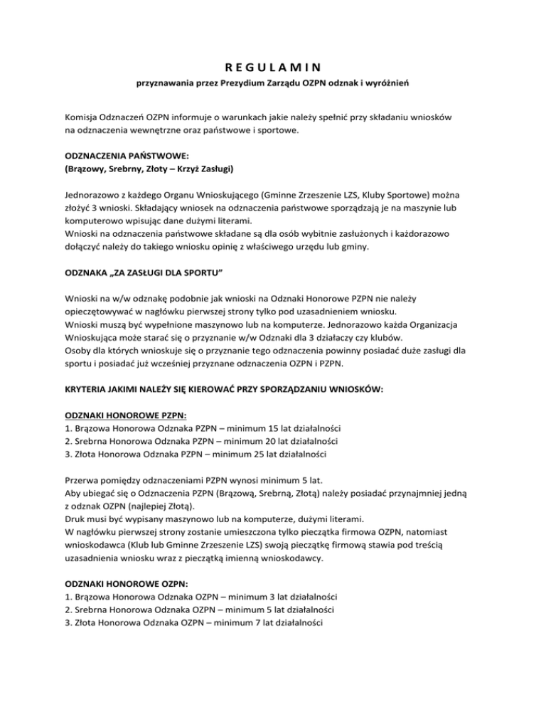 REGULAMIN przyznawania przez Prezydium Zarządu OZPN odznak i wyróżnień Komisja Odznaczeń OZPN informuje o warunkach jakie należy spełnić przy składaniu wniosków na odznaczenia wewnętrzne oraz państwowe i sportowe. ODZNACZENIA PAŃSTWOWE: (Brązowy, Srebrny, Złoty – Krzyż Zasługi) Jednorazowo z każdego Organu Wnioskującego (Gminne Zrzeszenie LZS, Kluby Sportowe) można złożyć 3 wnioski. Składający wniosek na odznaczenia państwowe sporządzają je na maszynie lub komputerowo wpisując dane dużymi literami. Wnioski na odznaczenia państwowe składane są dla osób wybitnie zasłużonych i każdorazowo dołączyć należy do takiego wniosku opinię z właściwego urzędu lub gminy. ODZNAKA „ZA ZASŁUGI DLA SPORTU” Wnioski na w/w odznakę podobnie jak wnioski na Odznaki Honorowe PZPN nie należy opieczętowywać w nagłówku pierwszej strony tylko pod uzasadnieniem wniosku. Wnioski muszą być wypełnione maszynowo lub na komputerze. Jednorazowo każda Organizacja Wnioskująca może starać się o przyznanie w/w Odznaki dla 3 działaczy czy klubów. Osoby dla których wnioskuje się o przyznanie tego odznaczenia powinny posiadać duże zasługi dla sportu i posiadać już wcześniej przyznane odznaczenia OZPN i PZPN. KRYTERIA JAKIMI NALEŻY SIĘ KIEROWAĆ PRZY SPORZĄDZANIU WNIOSKÓW: ODZNAKI HONOROWE PZPN: 1. Brązowa Honorowa Odznaka PZPN – minimum 15 lat działalności 2. Srebrna Honorowa Odznaka PZPN – minimum 20 lat działalności 3. Złota Honorowa Odznaka PZPN – minimum 25 lat działalności Przerwa pomiędzy odznaczeniami PZPN wynosi minimum 5 lat. Aby ubiegać się o Odznaczenia PZPN (Brązową, Srebrną, Złotą) należy posiadać przynajmniej jedną z odznak OZPN (najlepiej Złotą). Druk musi być wypisany maszynowo lub na komputerze, dużymi literami. W nagłówku pierwszej strony zostanie umieszczona tylko pieczątka firmowa OZPN, natomiast wnioskodawca (Klub lub Gminne Zrzeszenie LZS) swoją pieczątkę firmową stawia pod treścią uzasadnienia wniosku wraz z pieczątką imienną wnioskodawcy. ODZNAKI HONOROWE OZPN: 1. Brązowa Honorowa Odznaka OZPN – minimum 3 lat działalności 2. Srebrna Honorowa Odznaka OZPN – minimum 5 lat działalności 3. Złota Honorowa Odznaka OZPN – minimum 7 lat działalności Przerwa pomiędzy odznaczeniami OZPN wynosi minimum 2 lat. W/w wnioski mogą być wypełnione długopisem lub na maszynie, należy je wypełnić (dotyczy to zwłaszcza danych osobowych) drukowanymi, dużymi literami. W nagłówku wniosku powinna znajdować się pieczątka firmowa właściwego Klubu lub Gminnego Zrzeszenia LZS do którego należy dany klub lub działacz. Natomiast w rubryce uzasadnienie wniosku, pod treścią uzasadnienia powinna znajdować się firmowa pieczęć klubu lub Gminnego Zrzeszenia LZS i imienna Prezesa Klubu lub Przewodniczącego Gminnego Zrzeszenia LZS. „ZŁOTY MEDAL ZA WYBITNE ZASŁUGI DLA PIŁKARSTWA ŚLĄSKA OPOLSKIEGO” - przyznawany przez Prezydium Zarządu OZPN. Jak sama nazwa wskazuje w/w medal przyznaje się długoletnim wybitnym działaczom i klubom, którzy oprócz odznaczeń OZPN, posiadają już inne wyróżnienia i odznaki np. PZPN. Wnioski na ten Medal sporządza się poprzez właściwe Organy OZPN, maksymalnie dla 3 – 5 działaczy. Wszystkie wnioski na odznaczenia muszą być złożone w odpowiednim terminie, aby mogły zostać rozpatrzone przez Komisję Odznaczeń OZPN a następnie zatwierdzone przez Prezydium Zarządu OZPN. Regulamin został zatwierdzony 25 czerwca 2009 roku przez Prezydium Zarządu Opolskiego Związku Piłki Nożnej i wchodzi w życie w dniu zatwierdzenia.