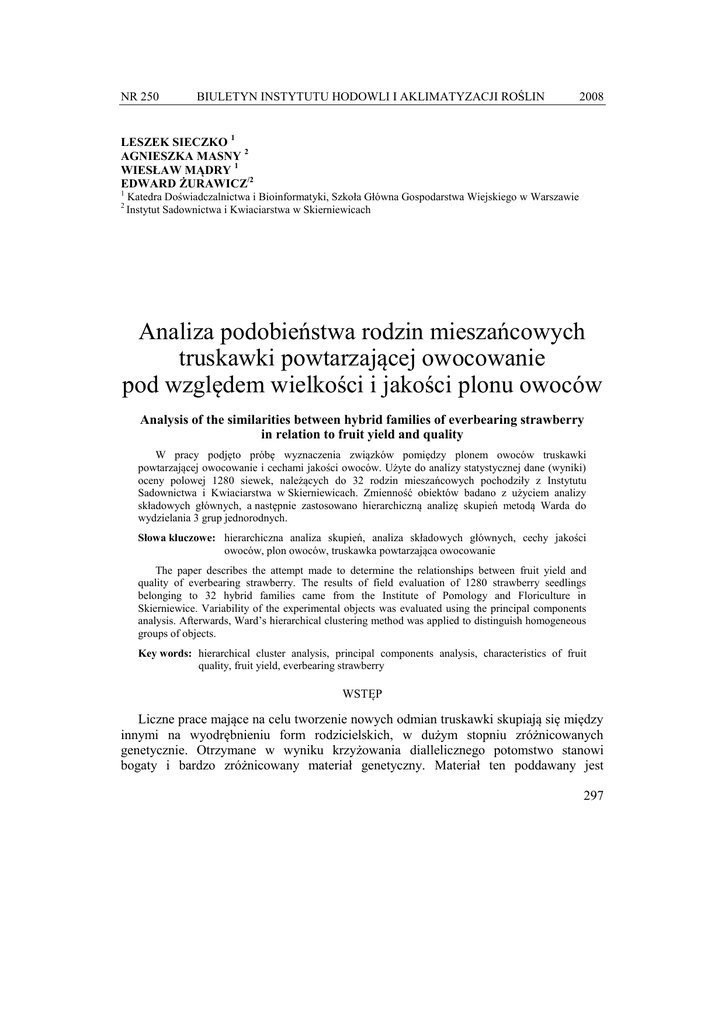 NR 250 BIULETYN INSTYTUTU HODOWLI I AKLIMATYZACJI ROŚLIN 2008 LESZEK SIECZKO 1 AGNIESZKA MASNY 2 WIESŁAW MĄDRY 1 EDWARD ŻURAWICZ/2 1 2 Katedra Doświadczalnictwa i Bioinformatyki, Szkoła Główna Gospodarstwa Wiejskiego w Warszawie Instytut Sadownictwa i Kwiaciarstwa w Skierniewicach Analiza podobieństwa rodzin mieszańcowych truskawki powtarzającej owocowanie pod względem wielkości i jakości plonu owoców Analysis of the similarities between hybrid families of everbearing strawberry in relation to fruit yield and quality W pracy podjęto próbę wyznaczenia związków pomiędzy plonem owoców truskawki powtarzającej owocowanie i cechami jakości owoców. Użyte do analizy statystycznej dane (wyniki) oceny polowej 1280 siewek, należących do 32 rodzin mieszańcowych pochodziły z Instytutu Sadownictwa i Kwiaciarstwa w Skierniewicach. Zmienność obiektów badano z użyciem analizy składowych głównych, a następnie zastosowano hierarchiczną analizę skupień metodą Warda do wydzielania 3 grup jednorodnych. Słowa kluczowe: hierarchiczna analiza skupień, analiza składowych głównych, cechy jakości owoców, plon owoców, truskawka powtarzająca owocowanie The paper describes the attempt made to determine the relationships between fruit yield and quality of everbearing strawberry. The results of field evaluation of 1280 strawberry seedlings belonging to 32 hybrid families came from the Institute of Pomology and Floriculture in Skierniewice. Variability of the experimental objects was evaluated using the principal components analysis. Afterwards, Ward’s hierarchical clustering method was applied to distinguish homogeneous groups of objects. Key words: hierarchical cluster analysis, principal components analysis, characteristics of fruit quality, fruit yield, everbearing strawberry WSTĘP Liczne prace mające na celu tworzenie nowych odmian truskawki skupiają się między innymi na wyodrębnieniu form rodzicielskich, w dużym stopniu zróżnicowanych genetycznie. Otrzymane w wyniku krzyżowania diallelicznego potomstwo stanowi bogaty i bardzo zróżnicowany materiał genetyczny. Materiał ten poddawany jest 297 Leszek Sieczko ... kilkuletniej, w warunkach polowych, ocenie cech o dużym znaczeniu gospodarczym (plon owoców i jego jakość, a także podatność na choroby liści). Część z tych cech oceniana jest za pomocą dokładnych pomiarów (plon i średnia masa owoców), cechy opisujące jakość owoców oraz podatność na choroby, z uwagi na dużą czasoi pracochłonność oraz wysokie koszty dokładnych badań analitycznych, z reguły określane są tylko bonitacyjnie. Analiza potomstwa przy użyciu różnych metod statystycznych pozwala na określenie m.in. wartości hodowlanej użytych do krzyżowań form rodzicielskich, zmienności i odziedziczalności badanych cech użytkowych, a także określenia związków pomiędzy tymi cechami. Znajomość tych parametrów statystycznych pozwala na zwiększenie efektywności prowadzonych prac hodowlanych. Problemem, który pojawia się na etapie analizy danych, jest dobór technik i metod statystycznych, które pozwolą na kompleksowe, a zarazem jak najbardziej szczegółowe przedstawienie związków pomiędzy badanymi cechami. Pomocnymi tu są metody statystyki wielowymiarowej, są one wykorzystywane coraz częściej i nie stanowią już problemu obliczeniowego, dlatego też chętnie są stosowane do analizy danych fenotypowych z badań roślin rolniczych (Teklu i in., 2007; Mguis i in., 2008) i sadowniczych (Gurrieri i in., 2001; Wu i in., 2003). Metody wielowymiarowe są także stosowane do analiz zmienności roślin na podstawie markerów biochemicznych i molekularnych DNA (Bulińska-Radomska, 2000; Fuentes i in., 2008). Celem badań było zastosowanie analizy korelacji prostych oraz analizy składowych głównych do charakterystyki związków pomiędzy plonem owoców oraz cechami jego jakości w zbiorze segregujących rodzin pełnego rodzeństwa, stanowiących rodziny mieszańcowe truskawki powtarzającej owocowanie. Wydzielono także i opisano grupy rodzin mieszańcowych wielocechowo jednorodnych, (o dużym podobieństwie wielocechowym) za pomocą hierarchicznej analizy skupień. MATERIAŁ I METODY Materiałem badawczym były siewki truskawki powtarzającej owocowanie w pokoleniu F1, należące do 32 rodzin mieszańcowych, uzyskanych z krzyżowań ośmiu form rodzicielskich, w niekompletnym układzie diallelicznym według II metody Griffinga (1956). W tym układzie krzyżowań wykonano krzyżowania wprost (26 kombinacji krzyżowań) i wsobne (6 kombinacji krzyżowań) — (tab. 1). Doświadczenie polowe założone zostało w układzie losowanych bloków w 4 powtórzeniach (poletkach) z 10 roślinami na każdym poletku, na polu doświadczalnym Sadu Pomologicznego Instytutu Sadownictwa i Kwiaciarstwa w Skierniewicach. Rośliny były uprawiane zgodnie z zaleceniami, powszechnie stosowanymi w nowoczesnej technologii uprawy odmian powtarzających owocowanie. Zabezpieczono rośliny przed mrozem poprzez okrywanie włókniną P-17 oraz usuwano rozwijające się wiosną kwiatostany tzw. pierwszego owocowania, a pozostawiono je dla uzyskania owocowania letnio-jesiennego kwiatostanów wyrastających po 1 czerwca. Takie zabiegi nie są stosowane w tradycyjnej uprawie polowej. 298 Leszek Sieczko ... Tabela 1 Układ krzyżowań ośmiu form rodzicielskich truskawki powtarzającej owocowanie The crossing design of eight parental forms of everbearing strawberry Odmiana Mara des Ostara Selva Geneva Capitola Variety Bois Ostara — 2 3 4 1 Selva 8 9 — 10 Geneva 14 15 16 Mara des Bois 20 21 Capitola 25 Yolo Calypso Red-gauntlet Numery obiektów — rodzin mieszańców; Number of objects — hybryd families Yolo Calypso 5 11 17 22 — 28 6 12 18 23 26 29 31 Redgauntlet 7 13 19 24 27 30 32 — Obserwacje roślin (siewek) badanych potomstw wykonano w drugim i trzecim roku po posadzeniu (lata 1999–2000). Wykonano pomiary plonu handl