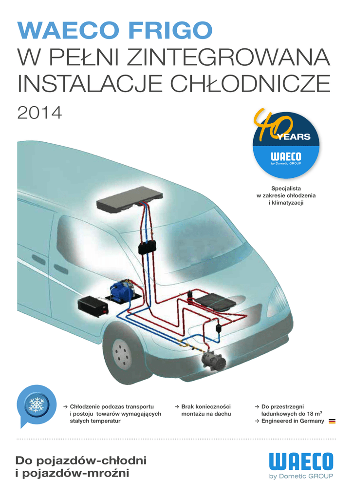 WAECO FRIGO W PEŁNI ZINTEGROWANA INSTALACJE CHŁODNICZE 2014 Specjalista w zakresie chłodzenia i klimatyzacji ≥Chłodzenie podczas transportu i postoju towarów wymagających stałych temperatur Do pojazdów-chłodni i pojazdów-mroźni ≥Brak konieczności montażu na dachu ≥Do przestrzegni ładunkowych do 18 m³ ≥ Engineered in Germany 2 WAECO Frigo Instalacje chłodnicze WAECO Frigo Precyzyjne chłodzenie od specjalistów ENGINEERED IN GERMANY Z ponad 35-letnim doświ przy tym wszystkie wymagania przemysłu samochodowego adczeniem w dziedzinie odnośnie doposażeniowych instalacji chłodniczych. Nasze pojazdów komponenty są pierwszorzędnej jakości: Stosowane są klimatyzacji firma Dometic WAECO wyłącznie zoptymalizowane pod kątem wydajności w tej branży jest absolutnym profesjonalistą. Oprócz elementy tych producentów, których części są już wielu innych innowacji rozwój w pełni zintegrowanych zamontowane w pierwotnym wyposażeniu pojazdu – jak instalacji chłodniczych dla pojazdów chłodni i mroźni jest np. SPAL (wentylatory) i Valeo (kompresory). naszym wielkim sukcesem. Rozbudowaliśmy rozległą sieć certyfikowanych serwisów, sprzedajemy i produkujemy nasze instalacje sami pod marką WAECO Frigo. WAECO Frigo jest systemem modułowym. Uniwersalne komponenty podstawowe pozwalają na elastyczny montaż. Koncepcja instalacji WAECO Frigo została opracowana we współpracy z Test- und Weiterbildungszentrum Karlsruhe (TWK), wiodącym instytutem optymalizacji samochodowych instalacji chłodniczych. Uwzględniono Do 30% więcej mocy chłodniczej! Chłodzenie bez montażu na dachu – dopasowane do pojazdów transportowych Transport wrażliwych na temperaturę towarów jest zawsze skomplikowanym zadaniem logistycznym, regulowanym przepisami prawnymi. Do przewiezienia łatwo psującej się żywności i innych wrażliwych na temperatury produktów z punktu A do B potrzebny jest odpowiednio wyposażony pojazd. Modułowy system WAECO Frigo zapewnia godne zaufania rozwiązania chłodnicze dla wszystkich popularnych pojazdów chłodniczych i mroźni. Cała technika chłodzenia jest umieszczana wewnątrz pojazdu, bez konieczności montażu na dachu. Droga do właściwego chłodzenia precyzyjnego jest bardzo prosta: Wystarczy podać nam typ pojazdu, obojętność przestrzeni ładunkowej i wymagane warunki temperaturowe – my dopasujemy właściwe moduły. Na życzenie możliwe są takie opcje, jak chłodzenie postojowe. Producent zastrzega sobie prawo do modyfikowania konstrukcji przedstawionych tu produktów, wprowadzania w nich udoskonaleń technicznych i zmieniania sposobów dostawy. WAECO Frigo Certyfikowane rozwiązanie chłodnicze do pojazdów Przewożenie żywności lub innych wrażliwych na temperatury produktów regulują surowe przepisy prawne. Przewoźnik jest odpowiedzialny za utrzymanie łańcucha chłodniczego podczas transportu do odbiorcy. Z instalacjami chłodniczymi WAECO Frigo to żaden problem, gdyż są one w stu procentach niezawodne. Zostały sprawdzone przez ATP i posiadają certyfikat zgodny z normą DIN 8958 (kontrola wydajności i działania urządzeń chłodniczych dla termoizolowanych środków transportowych). W ten sposób można zaoferować klientowi pewność prawidłowego i sprawnego transportowania wrażliwych towarów. 3 W pełni zintegrowane chłodzenie Instalacje chłodnicze WAECO Frigo posiadają jedyną w swoim rodzaju zaletę: zintegrowany montaż. Parownik jest montowany do sufitu przestrzeni ładowniczej, dzięki czemu nie przeszkadza podczas załadunku i rozładunku oraz w trakcie czyszczenia. Zrezygnowano tu z typowego dla innych systemów montażu dachowego. Korzyści: Bezproblemowa dostawa przy ograniczonej wysokości przejazdu (np. w garażach podziemnych) Większe bezpieczeństwo podczas manewrów omijania (środek ciężkości pojazdu pozostaje niezmieniony) Sztywność karoserii pozostaje nienaruszona, brak zagrożenia korozją przez wycięcie w dachu Brak pogorszenia wyglądu i aerodynamiki pojazdu ATP + certyfikat DIN 8958 Moduł parownika zgodnie z wymaganiami wytycznych HACCP Idealna integracja: panel obsługi. Kierowca ma stały podgląd aktualnej temperatury w przestrzeni ładunkowej. Opcja: Chłodzenie podczas postoju w pojazdach chłodniczych Opcja: Rozmrażanie gorącym gazem „Soft” dla pojazdów chłodniczych Ta dodatkowa funkcja służy do optymalizacji zadań logistycznych. Długie przestoje z powodu oblodzenia parownika? Można o tym Pojazd można załadować znacznie wcześniej lub może pozostać zapomnieć po zamontowaniu dodatkowej opcji rozmrażania załadowany przez wieczór, aby rano zapewnić szybszą gotowość gorącym do wyruszenia w drogę. Dzięki temu nie jest konieczne tymczasowe kompresorem a parownikiem czynnik chłodniczy jest nagrzewany przechowywanie towaru w chłodniach stacjonarnych. i szybko rozmraża parownik. Dzięki temu pojazd może szybko Dodatkowy kompresor do chłodzenia postojowego jest monto- wrócić na trasę, a parownik może pracować z pełną mocą. Zalecane wany w kabinie kierowcy obok fotela, gniazdo zewnętrzne 230 V do do transportowania z temperaturami od 0°C do 2°C i/lub przy podłączania systemu do prądu jest zamontowane w przednim zderzaku. Z uwagi na to, że elementy chłodzące instalacji także podczas postoju są zasilane prądem z pojazdu, dodaliśmy wysokiej jakości ładowarkę IU0U do zapewnienia prawidłowego poziomu naładowania akumulatora pojazdu. www.waeco.pl gazem. Sposób częstym otwieraniu drzwi. działania: Cyrkulujący pomiędzy Komponenty 4 Chłodzenie na wymiar: system modułowy Instalacje chłodnicze WAECO Frigo są zestawiane z kilku Budowa modułowa zapewnia łatwy montaż – w 8 do elementów systemowych, niektóre z nich są dostępne 12 godzin roboczych zostają zmontowane komponenty opcjonalnie. Głównym elementem każdej instalacji jest podstawowe – i pozwala na indywidualnie dopasowanie parownik, wybrany odpowiedni