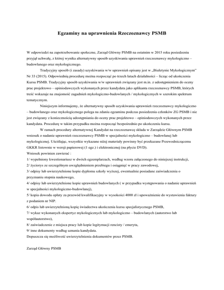Egzaminy na uprawnienia Rzeczoznawcy PSMB W odpowiedzi na zapotrzebowanie społeczne, Zarząd Główny PSMB na ostatnim w 2015 roku posiedzeniu przyjął uchwałę, z której wynika alternatywny sposób uzyskiwania uprawnień rzeczoznawcy mykologiczno – budowlanego oraz mykologicznego. Tradycyjny sposób (i zasady) uzyskiwania w/w uprawnień opisany jest w „Biuletynie Mykologicznym” Nr 33 (2015). Odpowiednią procedurę można rozpocząć po trzech latach działalności – licząc od ukończenia Kursu PSMB. Tradycyjny sposób uzyskiwania w/w uprawnień związany jest m.in. z udostępnieniem do oceny prac projektowo – opiniodawczych wykonanych przez kandydata jako aplikanta rzeczoznawcy PSMB, których treść wskazuje na znajomość zagadnień mykologiczno-budowlanych / mykologicznych w szerokim spektrum tematycznym. Niniejszym informujemy, że alternatywny sposób uzyskiwania uprawnień rzeczoznawcy mykologiczno – budowlanego oraz mykologicznego polega na zdaniu egzaminu podczas posiedzenia członków ZG PSMB i nie jest związany z koniecznością udostępniania do oceny prac projektowo – opiniodawczych wykonanych przez kandydata. Procedurę w takim przypadku można rozpocząć bezpośrednio po ukończeniu kursu. W ramach procedury alternatywnej Kandydat na rzeczoznawcę składa w Zarządzie Głównym PSMB wniosek o nadanie uprawnień rzeczoznawcy PSMB w specjalności mykologiczno – budowlanej lub mykologicznej. Uściślając, wszystkie wykazane niżej materiały powinny być przekazane Przewodniczącemu GKKR listownie w wersji papierowej (1 egz.) i elektronicznej (na płycie DVD). Wniosek powinien zawierać : 1/ wypełniony kwestionariusz w dwóch egzemplarzach, według wzoru załączonego do niniejszej instrukcji, 2/ życiorys ze szczególnym uwzględnieniem przebiegu i osiągnięć w pracy zawodowej, 3/ odpisy lub uwierzytelnione kopie dyplomu szkoły wyższej, ewentualnie posiadane zaświadczenia o przyznaniu stopnia naukowego, 4/ odpisy lub uwierzytelnione kopie uprawnień budowlanych ( w przypadku występowania o nadanie uprawnień w specjalności mykologiczno-budowlanej), 5/ kopia dowodu opłaty za przewód kwalifikacyjny w wysokości 4000 zł i upoważnienie do wystawienia faktury z podaniem nr NIP. 6/ odpis lub uwierzytelnioną kopię świadectwa ukończenia kursu specjalistycznego PSMB, 7/ wykaz wykonanych ekspertyz mykologicznych lub mykologiczno – budowlanych (autorstwo lub współautorstwo), 8/ zaświadczenie z miejsca pracy lub kopie legitymacji rencisty / emeryta, 9/ inne dokumenty według uznania kandydata. Dopuszcza się możliwość uwierzytelnienia dokumentów przez PSMB. Zarząd Główny PSMB