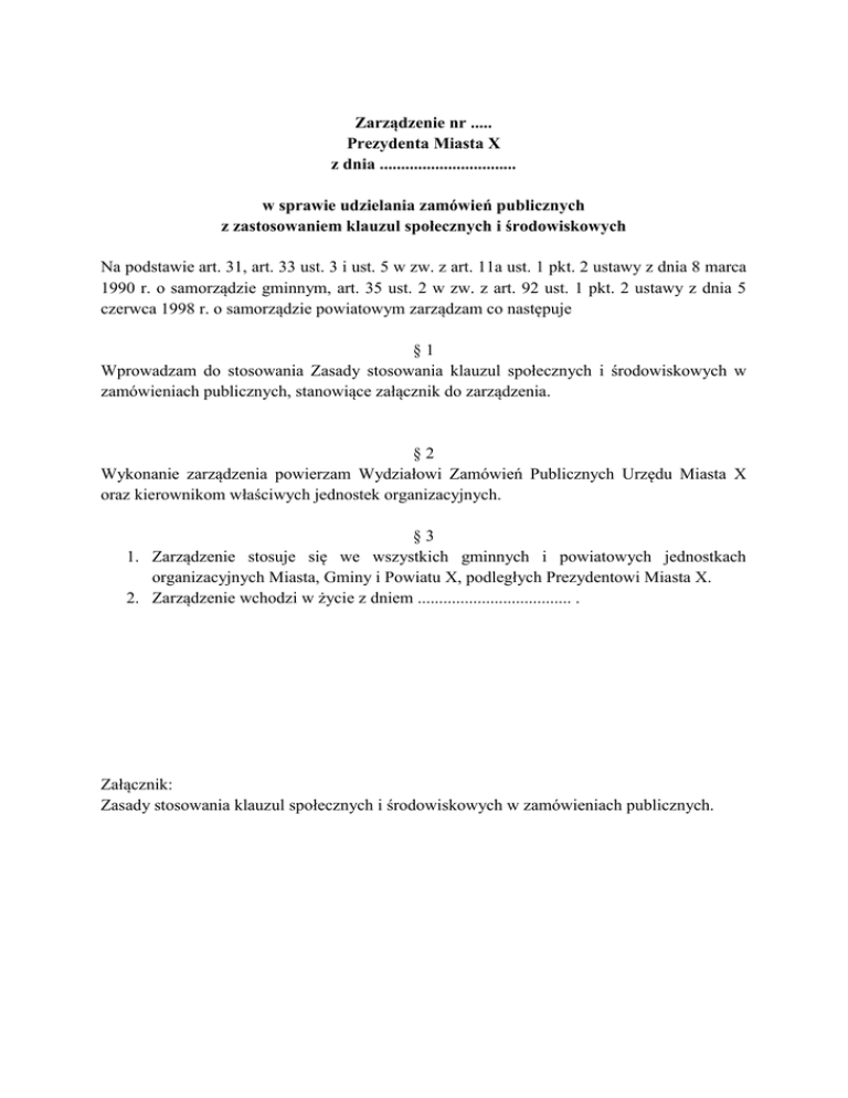 Zarządzenie nr ..... Prezydenta Miasta X z dnia ................................ w sprawie udzielania zamówień publicznych z zastosowaniem klauzul społecznych i środowiskowych Na podstawie art. 31, art. 33 ust. 3 i ust. 5 w zw. z art. 11a ust. 1 pkt. 2 ustawy z dnia 8 marca 1990 r. o samorządzie gminnym, art. 35 ust. 2 w zw. z art. 92 ust. 1 pkt. 2 ustawy z dnia 5 czerwca 1998 r. o samorządzie powiatowym zarządzam co następuje §1 Wprowadzam do stosowania Zasady stosowania klauzul społecznych i środowiskowych w zamówieniach publicznych, stanowiące załącznik do zarządzenia. §2 Wykonanie zarządzenia powierzam Wydziałowi Zamówień Publicznych Urzędu Miasta X oraz kierownikom właściwych jednostek organizacyjnych. §3 1. Zarządzenie stosuje się we wszystkich gminnych i powiatowych jednostkach organizacyjnych Miasta, Gminy i Powiatu X, podległych Prezydentowi Miasta X. 2. Zarządzenie wchodzi w życie z dniem .................................... . Załącznik: Zasady stosowania klauzul społecznych i środowiskowych w zamówieniach publicznych. Projekt zarządzenia Prezydenta Miasta X z uzasadnieniem Uzasadnienie projektu zarządzenia Stosowanie klauzul społecznych (środowiskowych) jest dopuszczalne w zamówieniach publicznych w sposób wyraźnie uregulowany począwszy od dyrektyw unijnych z 2004 r. Zostały wówczas uchwalone dwie dyrektywy: dyrektywa 2004/18/WE Parlamentu Europejskiego i Rady z dnia 31 marca 2004 r. w sprawie koordynacji procedur udzielania zamówień publicznych na roboty budowlane, dostawy i usługi (tzw. dyrektywa klasyczna) oraz dyrektywa 2004/17/WE Parlamentu Europejskiego i Rady z dnia 31 marca 2004 r. koordynująca procedury udzielania zamówień przez podmioty działające w sektorach gospodarki wodnej, energetyki, transportu i usług pocztowych (tzw. dyrektywa sektorowa). Obie powołane regulacje wspólnotowe zawierają zarówno w motywach (preambułach), jak i części normatywnej zasady, na podstawie których w prawie krajowym można uwzględniać przy udzielaniu zamówień określone względy społeczne, czy środowiskowe. Względy te mogą wpływać na warunki udziału w postępowaniu, przekładać się na wymagania związane z realizacją zamówień oraz na kryteria oceny ofert. Przewidziano mianowicie, że Państwa Członkowskie mogą zastrzec prawo udziału w procedurach udzielania zamówień publicznych zakładom pracy chronionej lub przewidzieć możliwość realizacji takich zamówień w ramach programów pracy chronionej, w których większość zaangażowanych pracowników stanowią osoby niepełnosprawne, które ze względu na charakter lub stopień swojej niepełnosprawności nie mogą wykonywać swojej pracy w normalnych warunkach (por. art. 19 dyrektywy klasycznej). Instytucje zamawiające mogą ponadto określić warunki szczególne związane z realizacją zamówienia, pod warunkiem, że są one zgodne z przepisami prawnymi Unii oraz zostały wskazane w ogłoszeniu o zamówieniu lub specyfikacjach. Warunki rządzące realizacją zamówienia mogą w szczególności dotyczyć względów społecznych i środowiskowych (por. art. 26 dyrektywy klasycznej). W ramach kryteriów oceny ofert (kryteriów udzielenia zamówienia) prawodawca unijny wskazał, że dokonując wyboru oferty najkorzystniejszej ekonomicznie można brać pod uwagę m.in. aspekty środowiskowe, przy czym zastosowano otwarty katalog możliwych kryteriów (por. art. 53 dyrektywy klasycznej). Ponadto w prawie pierwotnym Unii Europejskiej przewidziano m.in., że przy ustalaniu i realizacji polityk i działań Unii, w szczególności w celu wspierania zrównoważonego rozwoju, muszą być brane pod uwagę wymogi ochrony środowiska (art. 11 Traktatu o Funkcjonowaniu Unii Europejskiej). O uwzględnianiu kwestii społecznych i środowiskowych w ramach zamówień publicznych (tzw. instrumentalizacji zamówień publicznych) wypowiadał się wielokrotnie Trybunał Sprawiedliwości Unii Europejskiej, m.in. w sprawie Nord-Pas-de-Calais (sygn. C225/98) i w sprawie Concordia Bus Finland (sygn. C-513/99). Również Komisja Europejska wypełnia istotną rolę w tym zakresie m.in. wydając liczne komunikaty interpretacyjne (np. (COM (2001) 274, Bruksela, 4.07.2001; COM (2001) 566, Bruksela, 15.10.2001; COM (2008) 400, Bruksela, 16 lipca 2008 r.), przewodniki (np. „Kwestie społeczne w zakupach. Przewodnik dotyczący uwzględniania kwestii społecznych w zamówieniach publicznych.”) oraz tzw. Karty Produktu, stanowiące swoiste instrukcje dla zamawiających (np. GPP Toolkit Karta Produktu Budownictwo). 2 Projekt zarządzenia Prezydenta Miasta X z uzasadnieniem W prawie polskim odpowiednie przepisy zawarto w ustawie z dnia 29 stycznia 2004 r. Prawo zamówień publicznych. Pierwotnie w ustawie przewidziano możliwość brania pod uwagę w ramach kryteriów oceny ofert m.in. aspektu zastosowania najlepszych dostępnych technologii w zakresie oddziaływania na środowisko. Istotne regulacje w zakresie stosowania klauzul społecznych wprowadzono w lipcu 2009 r. Dotyczyły one obszaru zatrudniania określonych grup osób wykluczonych społecznie oraz kwestii szkoleniowych jako warunków realizacji zamówienia (art. 29 ust. 4 ustawy). W grudniu 2009 r. wszedł z kolei w życie przepis odnoszący się do zagadnienia zatrudnienia osób niepełnosprawnych jako warunku udziału w postępowaniu (art. 22 ust. 2 ustawy). Należy wskazać przy tym, że postulaty podkreślające potrzebę uwzględniania kryteriów społecznych w zamówieniach publicznych były formułowane już nieco wcześniej, w szczególności zostały zawarte w Białej Księdze Prawa Przedsiębiorczości Społecznej w Polsce przygotowanej przez Grupę Prawno - Rzeczniczą Krajowej Sieci Tematycznej - Temat D - Ekonomia Społeczna (z dnia 14 marca 2008 r.). Powołany dokument został opracowany w oparciu o analizy i doświadczenia podmiotów realizujących projekty służące rozwojowi przedsiębiorczości społecznej 