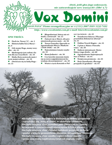 «Dziœ, jeœli głos Jego usłyszycie, 4/2007 nie zatwardzajcie serc waszych!» (Hbr 4,7) Vox Domini „G£OS PANA” Pismo ewangelizacyjne nr 4 (111) 2007 ISSN 1232-7492 http://www.voxdomini.com.pl e-mail: [email protected] Spis treści: l Duch św. Teresy [2] – str. 2 l Historia kultu Serca Maryi – str. 8 l Gdy mamy Boga, mamy wszy stko – str. 15 l Medziugorje jest cudem i da rem dla nas wszystkich – str. 16 l Matka Boża uratowała mnie i życie mojej rodziny – str. 18 l Otwórzcie się na łaskę Boga – str. 21 l Błogosławieni, którzy nie wi dzieli, a uwierzyli – str. 23 l Zatracić się w Maryi, aby pro mieniowała przeze mnie – str. 26 l Teresa Gonzalez-Quevedo ze Zgromadzenia Maryi z Madrytu (1930-1950) – str. 29 l Najważniejsze tematy orędzi – str. 32 l Ikona Jedności – str. 38 l Czy tureckie muzeum stanie się na nowo najpiękniejszym ko ściołem chrześcijaństwa? – str. 39 l Wieści z życia Kościoła w Pol sce i na świecie – str. 42 l Świadectwo lekarza: Dlaczego przestałem dokonywać aborcji? – str. 51 l Pokłon Trzech Magów – str. 52 l Z pism o. Mateo: Potrzeba wiar y – str. 58 l Stulecie intronizacji. Ojciec Mateo i jego dzieło – str. 60 l Zgromadzenie Najświętszych Serc w Polsce – str. 61 l Świąteczna promocja – str. 62 l Boże Narodzenie: dlaczego przypada 25 grudnia? – str. 63 Nie było miejsca dla Ciebie w Betlejem w żadnej gospodzie i narodziłeś się, Jezu, w stajni, w ubóstwie i chłodzie. Nie było miejsca, choć zszedłeś jako Zbawiciel na ziemię, by wyrwać z czarta niewoli nieszczęsne Adama plemię. Nie było miejsca, choć chciałeś ludzkość przytulić do łona i podać z krzyża grzesznikom zbawcze, skrwawione ramiona. Nie było miejsca, choć szedłeś ogień miłości zapalić i przez swą mękę najdroższą świat od zagłady ocalić. 1 Vox Domini DUCH ŚW. TERESY (2) PRZYMIOTY MIŁOŚCI BOŻEJ W ŚW. TERESIE OD DZIECIĄTKA JEZUS MIŁOŚĆ CZYNNA „Pracuj jak dobry żołnierz Chrystusa”1 – pisał św. Paweł do ucznia swego, Tymoteusza. Znaczy to, że zadaniem człowieka na ziemi nie jest radowanie się spokojem miłości uszczęśliwiającej, ale walka z ziemskimi skłonnościami, sprzeciwiającymi się Królestwu Bożemu i rozszerzanie tego Królestwa Bożego przez uczynki miłości zdobywającej. Tak też pojmowała swe życie św. Teresa. W tej walce „z ziemskimi skłonnościami” stara się ukazać nam, jak zawsze, cel miłości, który pragnie osiągnąć: „Nie dlatego, aby zdobyć wieniec, zebrać zasługi i nabyć cnoty – ale dla zrobienia przyjemności Jezusowi, ratując dusze”. I dlatego śpiewa: „Mą radością ciągła walka, by Panu rodzić wybranych...” (Mój spokój i moja radość, str. 411). „O! Jezu mój, walczyć będę dla miłości Twojej aż do schyłku życia mego. Skoro nie chciałeś zażyć pokoju na ziemi, chcę iść za Twoim przykładem; pałam żądzą walczenia o chwałę Twoją; błagam Cię, umocnij odwagę moją! uzbrój mnie do walki”. (Modlitwa 10-11). I nie złożyła broni. A kiedy kilka tygodni przed jej śmiercią, widząc, jak jeszcze wyrzeka się wszystkiego przy każdej sposobności, zapytano jej: „Pewnie chcesz więc zbierać zasługi?” „O tak – odrzekła – ale nie dla siebie: dla dusz, dla Kościoła, aby rzucać róże wszystkim, sprawiedliwym i grzesznikom”. (18 sierpnia). Zanim wejdziemy w szczegóły tej walki, wydanej naturze na każdym kroku, posłuchajmy, co sądzi św. Teresa o sposobie, w jaki ją prowadzić należy, a zobaczymy, że w jej pojęciu życia doskonałego nie ma nic z gnuśnego spokoju. Najpierw mówi: „Nie gardzę bynajmniej wzniosłymi myślami, łączącymi dusze z Bogiem, lecz od dawna zrozumiałam, że nie należy zbytecznie na nich polegać. Najwznioślejsze natchnienia i porywy niczym są bez uczynków”. (Rozdz. X., str. 179). 1 Z 2 Listu do Tymoteusza 2,3. 2 Do słów pochwały odnoszących się do Judyty: „Żeś sobie mężnie poczęła, wzmocnione jest serce twoje”2 taką uwagę dodaje: „Wiele dusz usprawiedliwia się tymi słowy: Nie mam siły do tej ofiary. Lecz niechże tylko spróbują zdobyć się na wysiłek! Czasem to trudno, ale Bóg w swej dobroci nie odmawia nikomu pier wszej łaski potrzebnej do zwyciężenia siebie; jeśli tylko dusza jest wierną, natychmiast Pan ją oświeca, a zatem serce się wzmacnia i jedno zwycięstwo wieńczy drugie” (8 sierp.; Wspomn. i rady, str. 266). „Gdzieżby była twoja zasługa, mówiła do pewnej nowicjuszki, gdybyś walczyła tylko wtedy, kiedy masz odwagę? Cóż szkodzi, że odwagi nie czujesz, byleś tylko tak działała, jak gdybyś ją miała!” (Tamże, 279). „Chciałabym być tak mężną jak waleczny rycerz, który się na swe cierpienia nie uskarża, który rany swych towarzyszy uważa za ciężkie, a na swoje jak gdyby na lekkie zadraśnięcia, niewiele zważa”. (Wspomn. i rady, str. 272). Inna nowicjuszka, przeczytawszy ustęp z Koheleta: „Miłosierdzie uczyni miejsce każdemu według zasługi uczynków jego”3 pytała swej młodziutkiej Mistrzyni: - Dlaczego tam powiedziane „według zasługi uczynków”, kiedy św. Paweł mówi: „dostępują zaś usprawiedliwienia za darmo, z łaski jego?”4 (Wspomnienia niewydane). Służebnica Boża wytłumaczyła energicznie ten pozorny kontrast tym, że jakkolwiek istotą nadziei posuniętej aż do ostatecznych granic jest zdanie się na Boga i ufność, to jednak podsyca ją nie co innego, jak ofiara. Myśl tę rozwinęła w tych słowach: „Czyńmy wszystko, co tylko w naszej mocy, dawajmy bez rachuby, zapierajmy się ustawicznie, słowem, składajmy na każdym kroku dowody naszej czyn nej, ofiarnej miłości. Ponieważ wszystko to w rzeczywistości i tak jest niczym, trzeba całą swą ufność położyć w Bogu, który Sam tylko uczynki nasze uświęcić 2 Księga Judyty 15,2. 3 Księga Koheleta 16,15. 4 List do Rzymian 3,24. zdoła, wyznając się być 